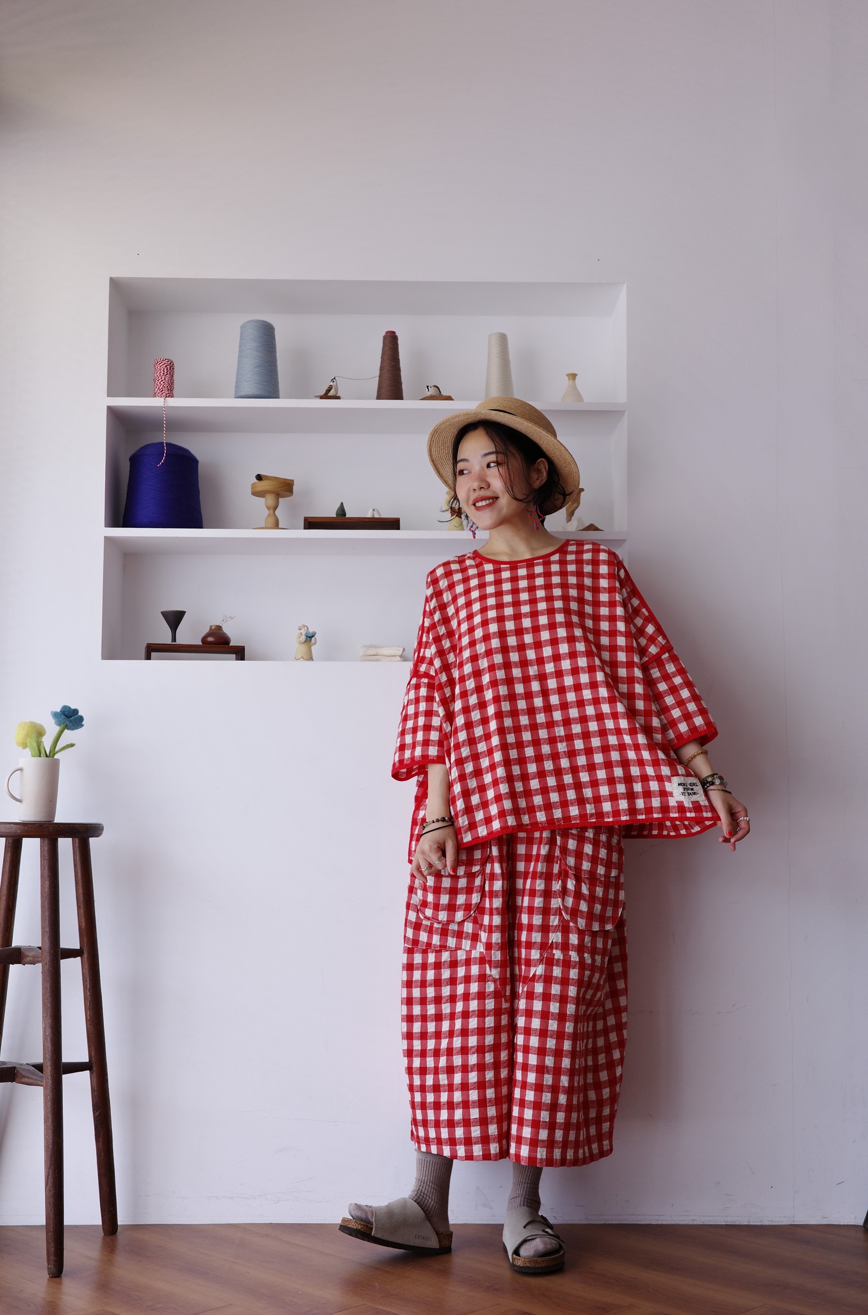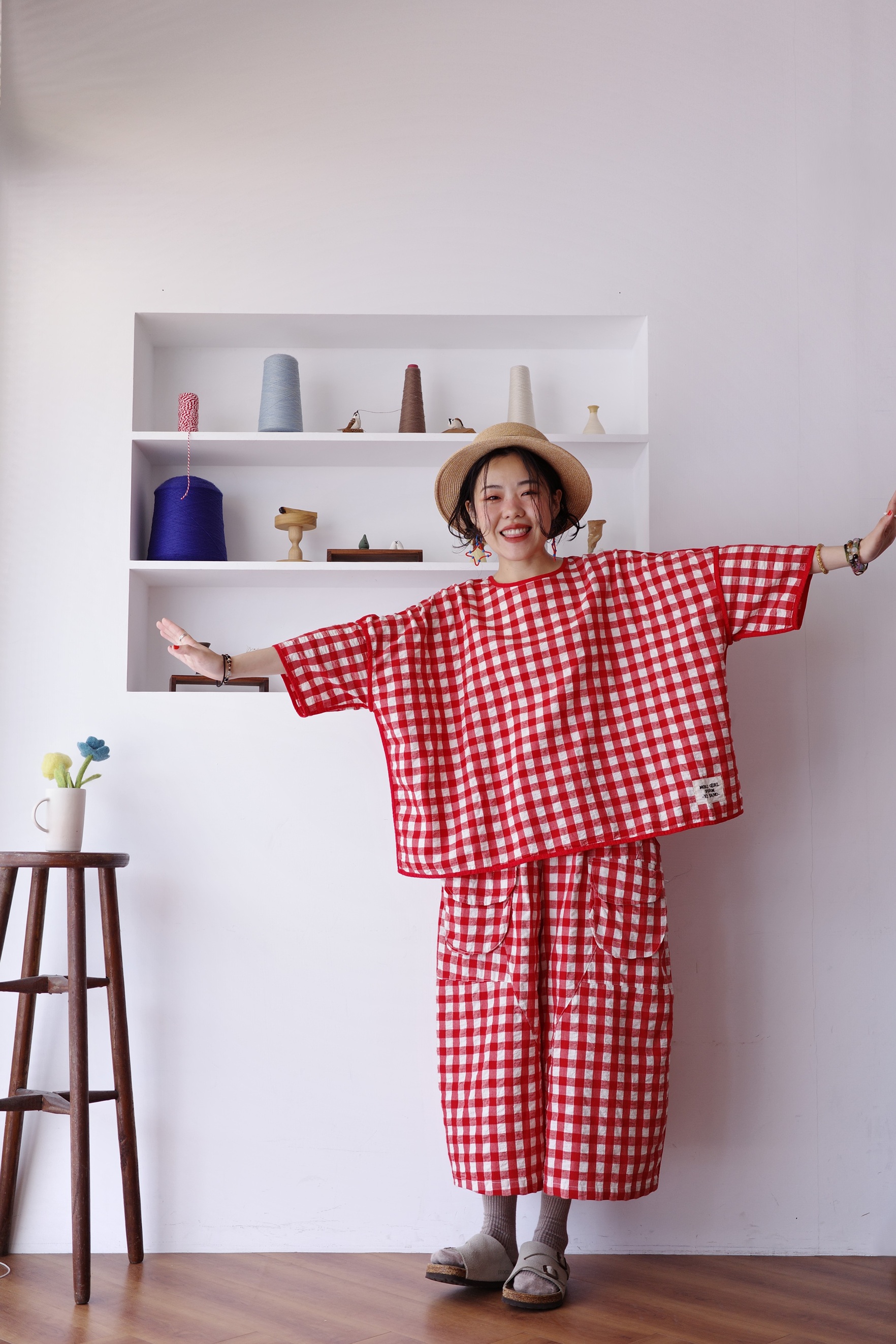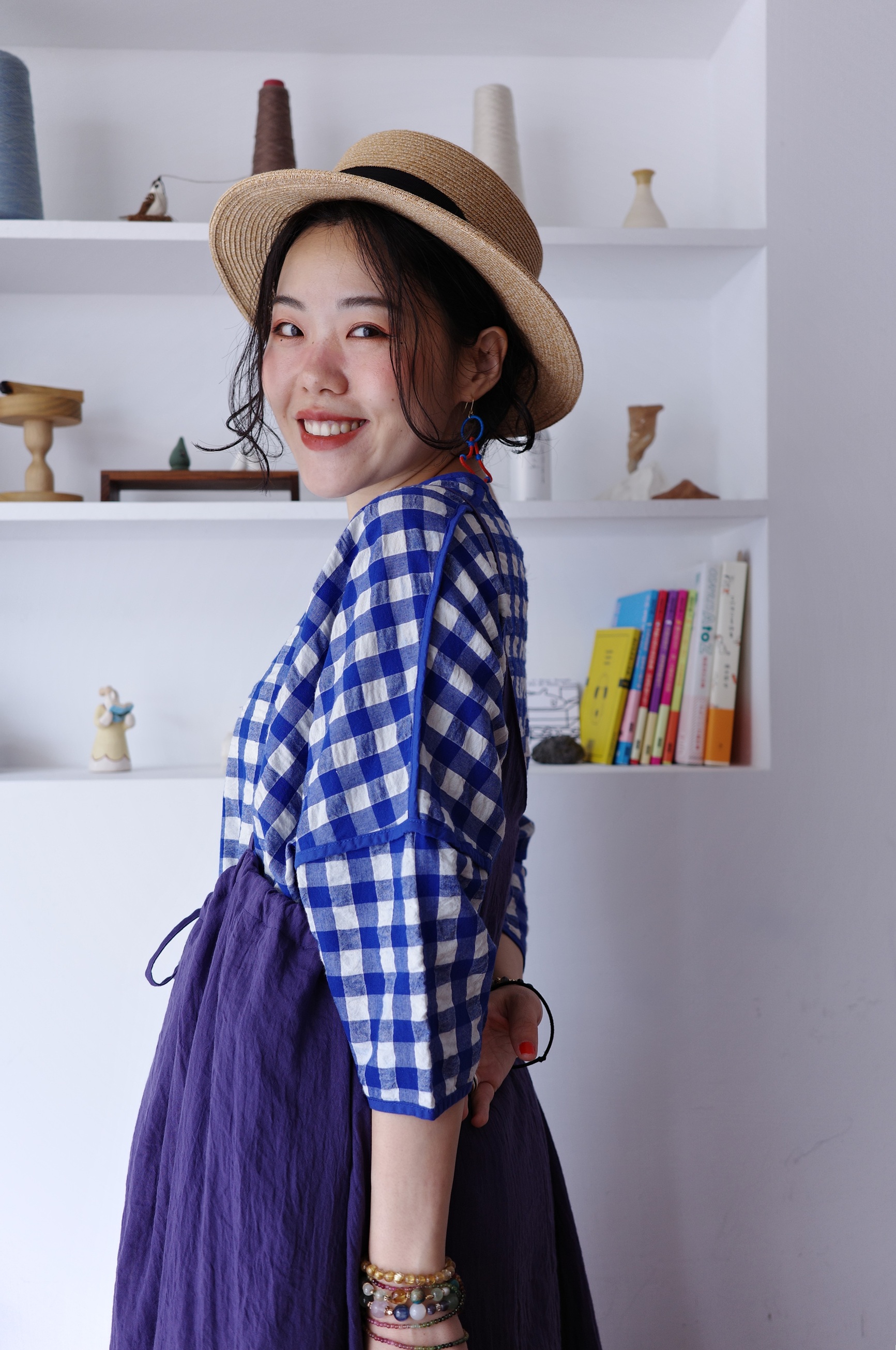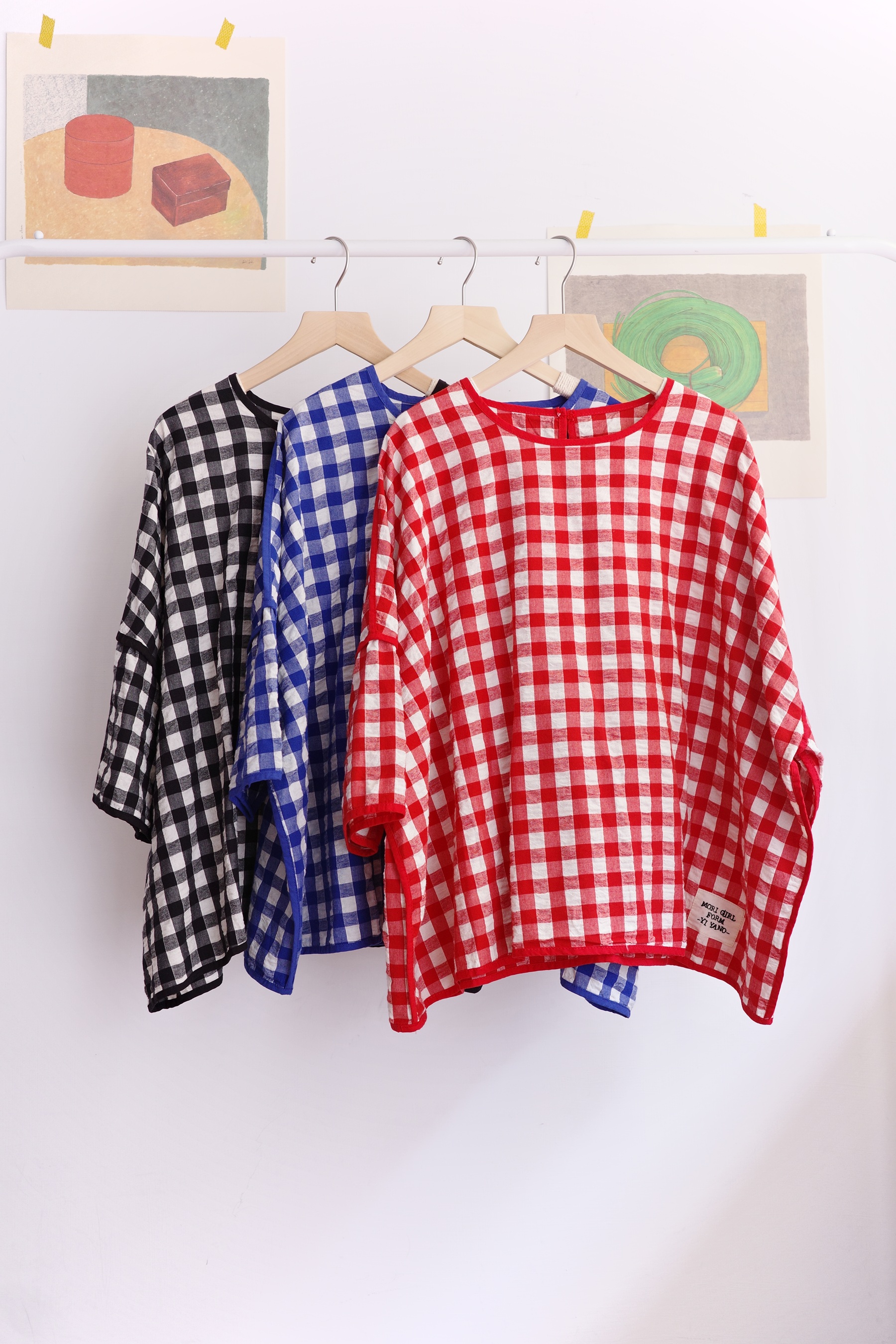 布料是透氣的泡泡棉,帶有自然紋理不需整燙,飽和色調的方格紋經典可愛。