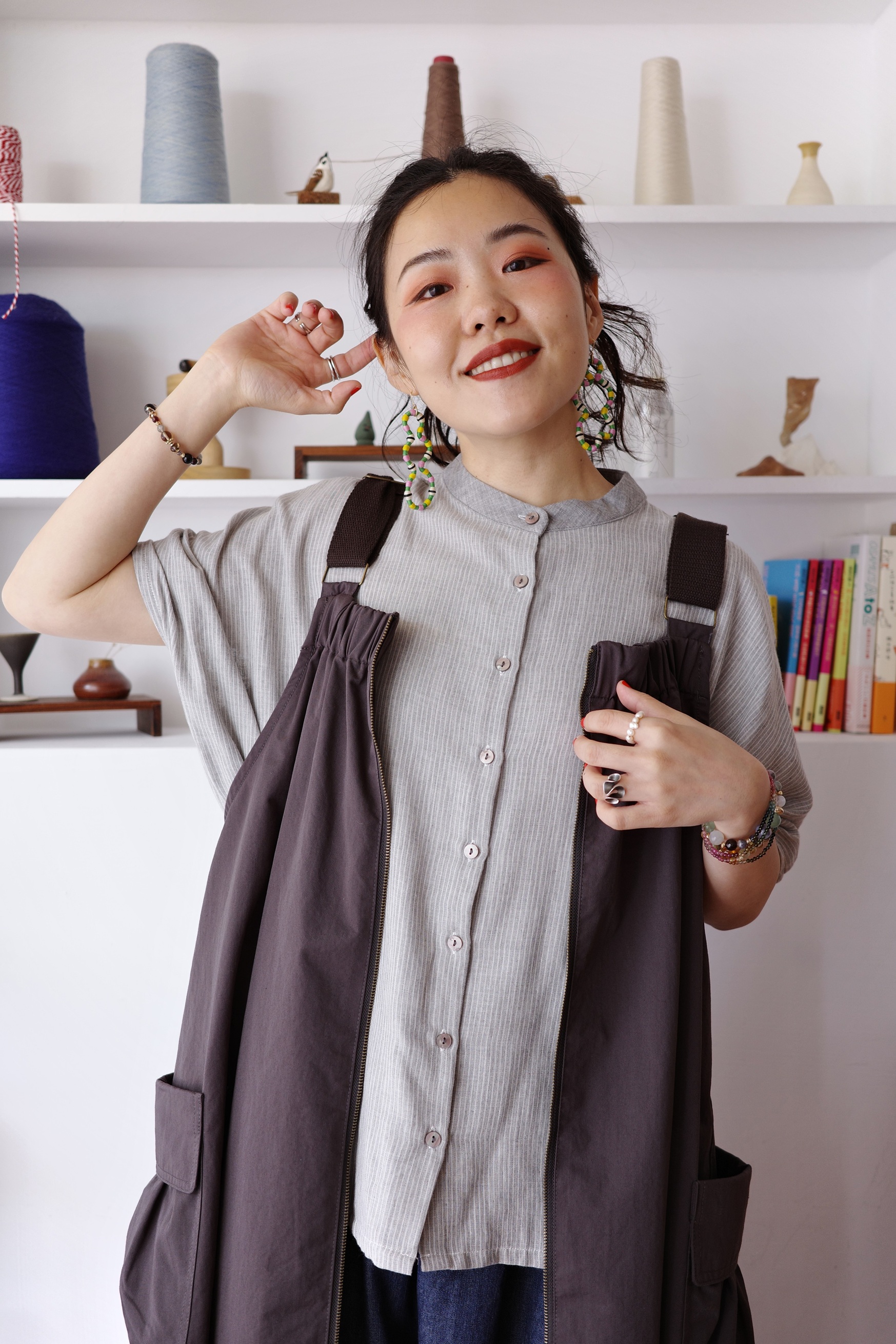 無領拼接設計,也可以自由開釦成V領將衣服往後拉,更加率性。