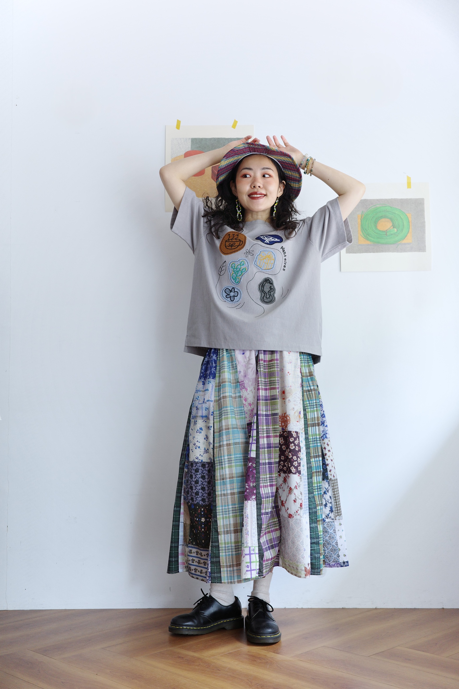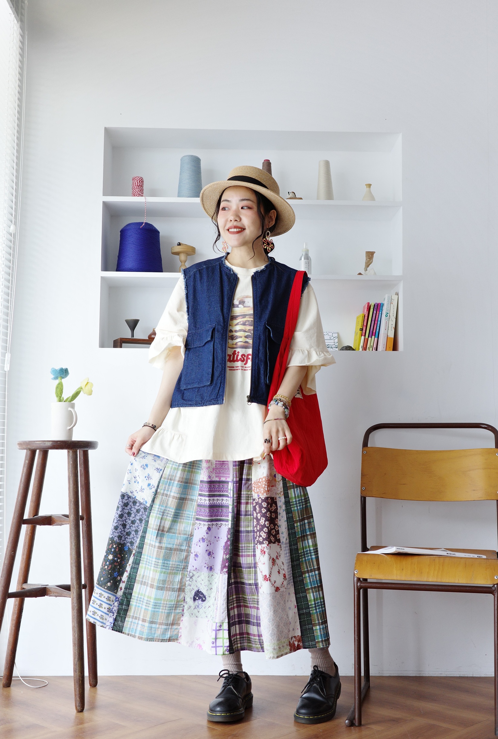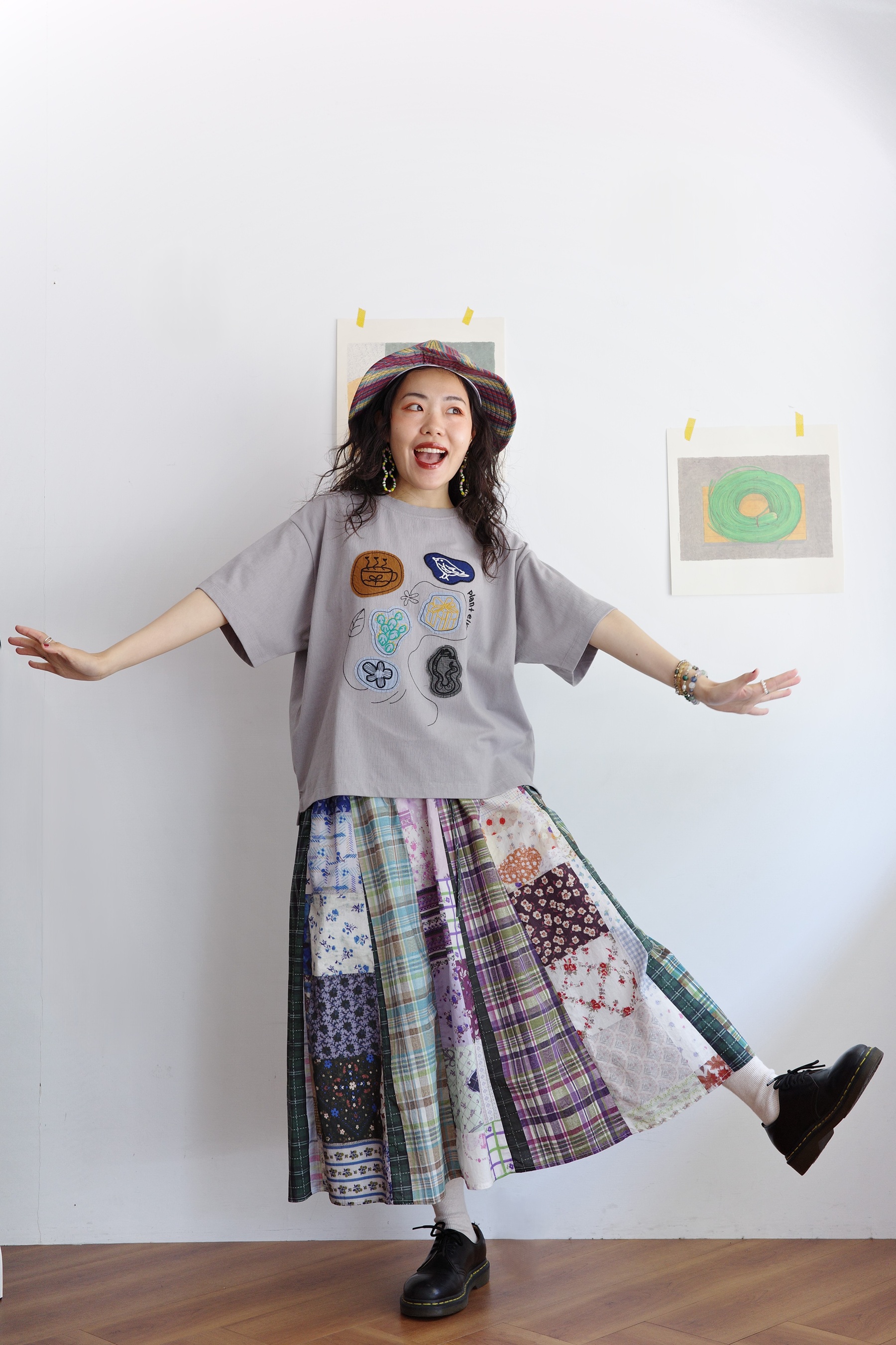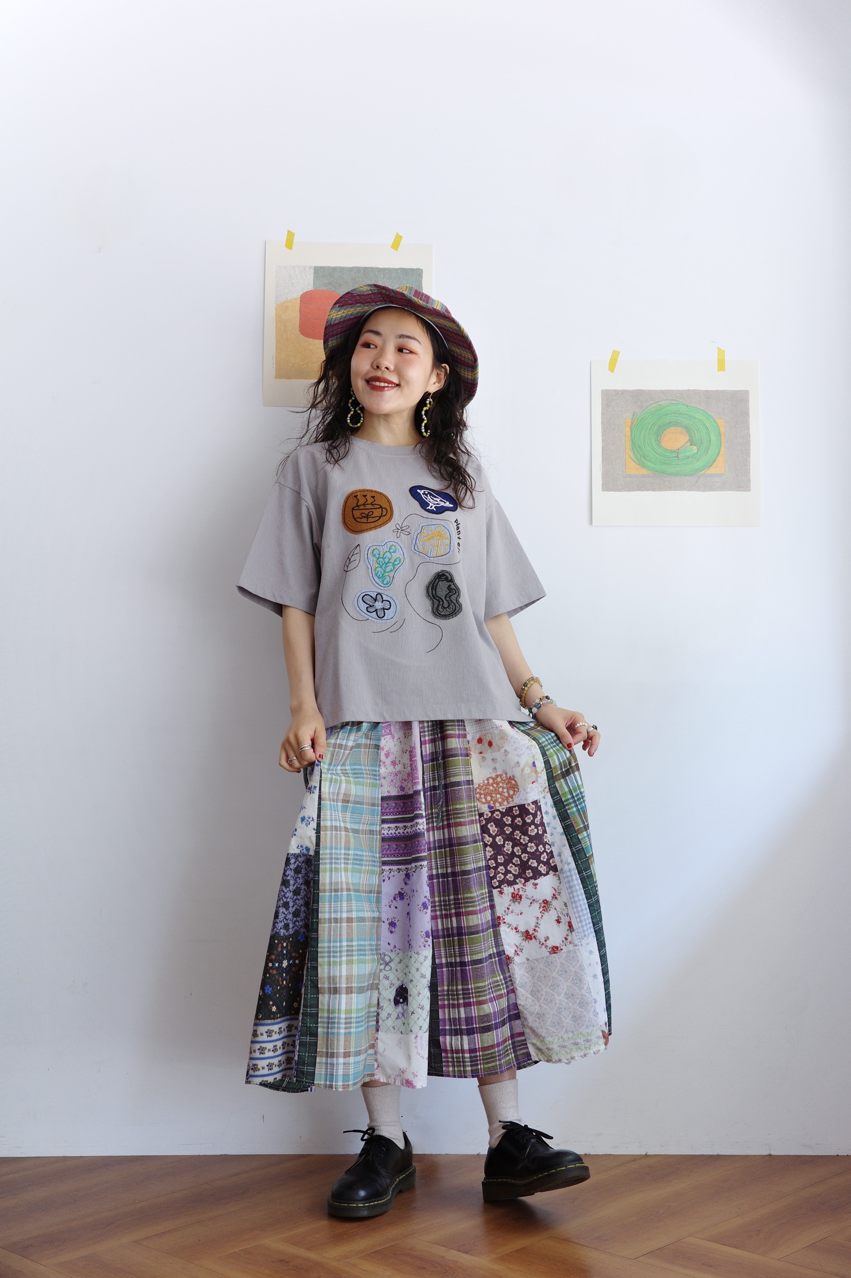 花色可愛的拼布裙,搭配簡單的T-shirt就可以出門
