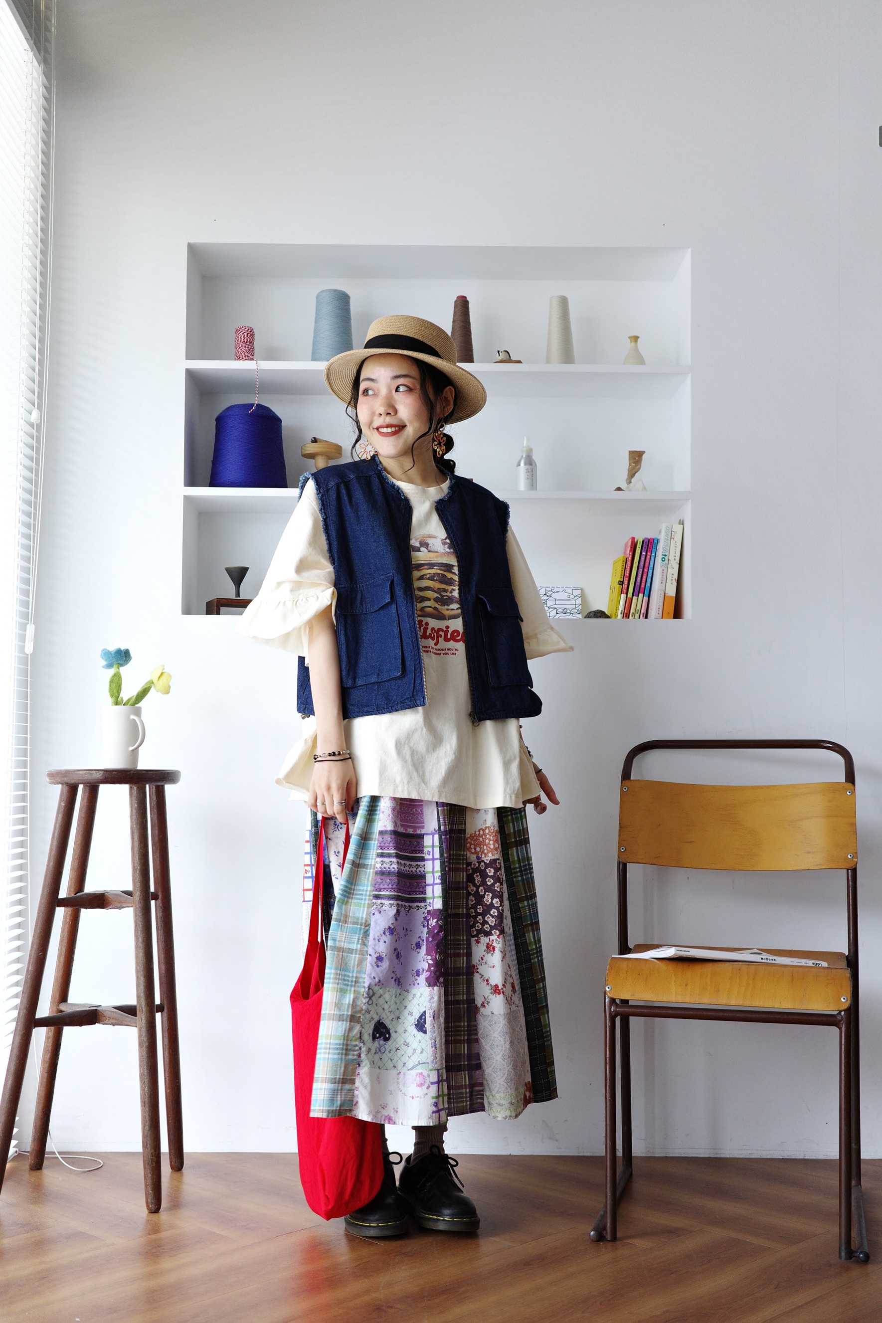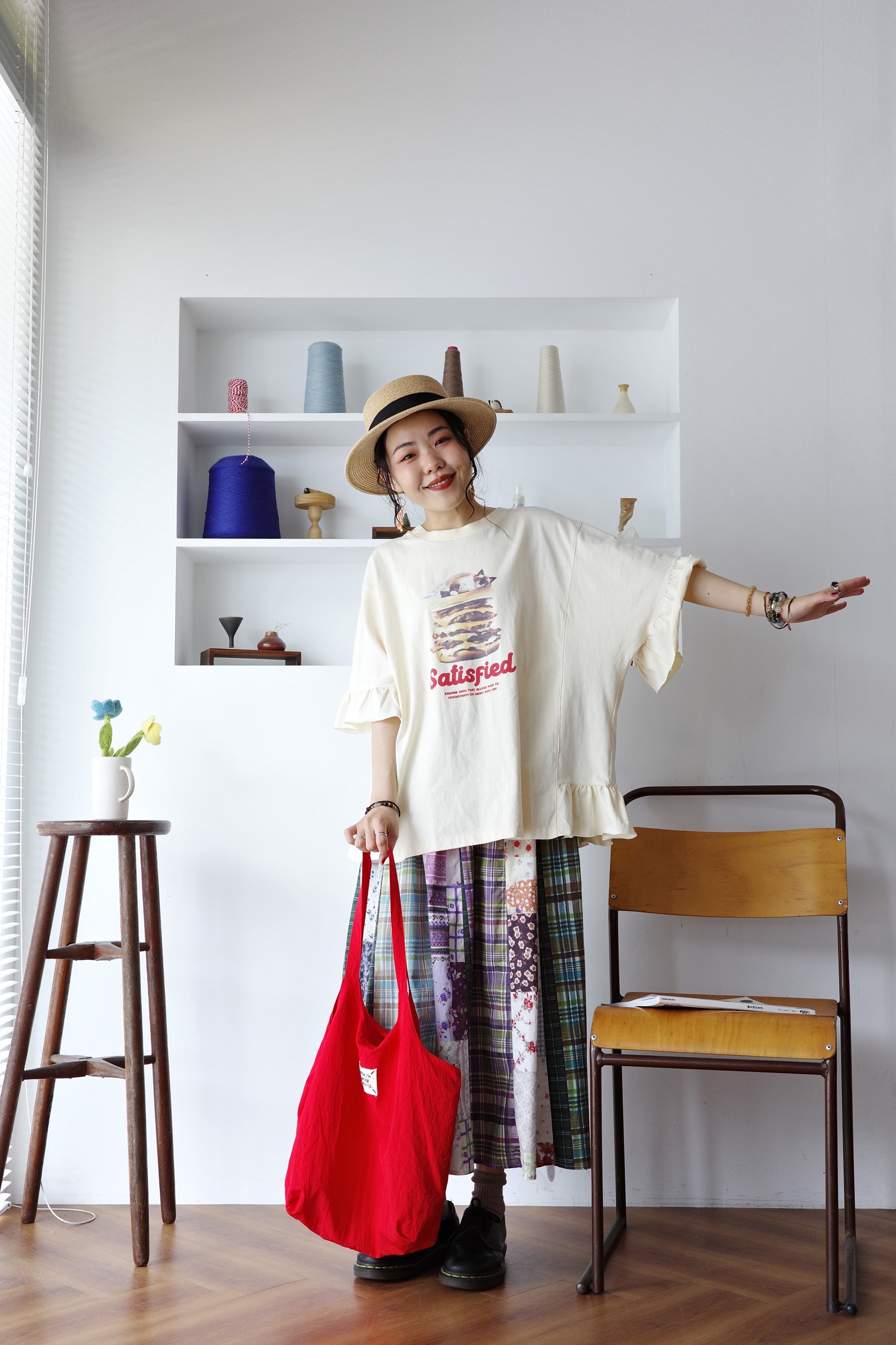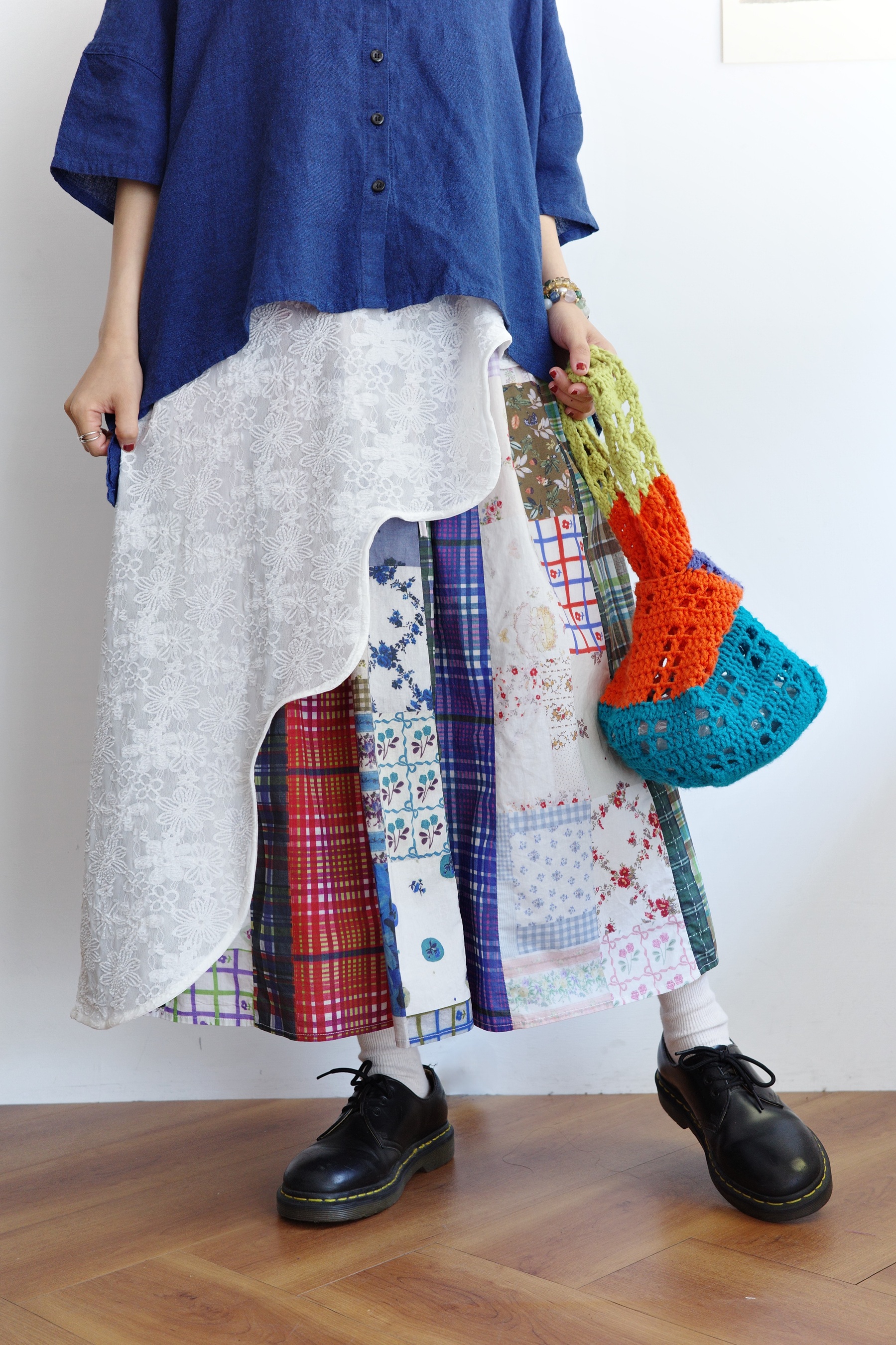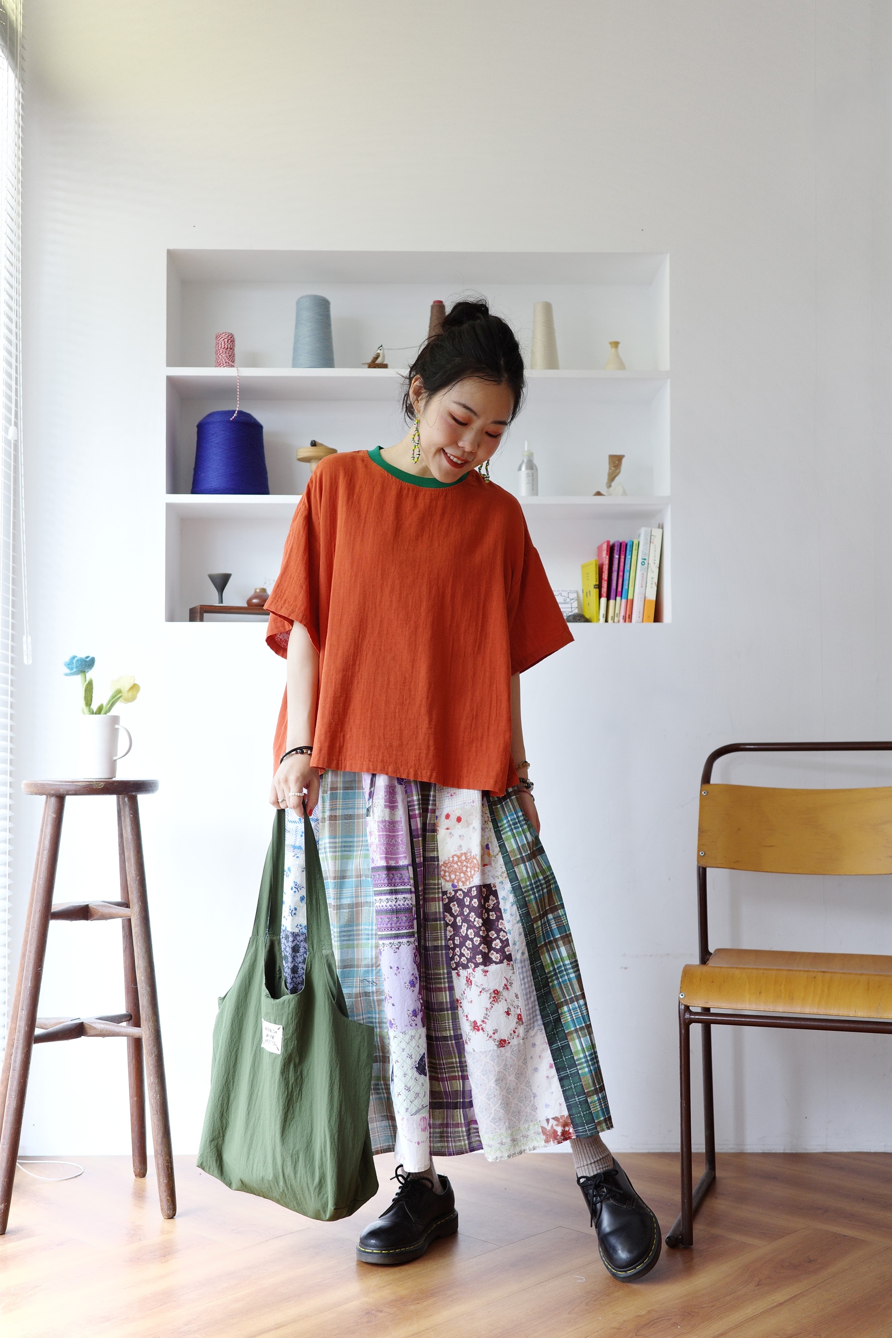 花色可愛的拼布裙,搭配簡單的T-shirt就可以出門