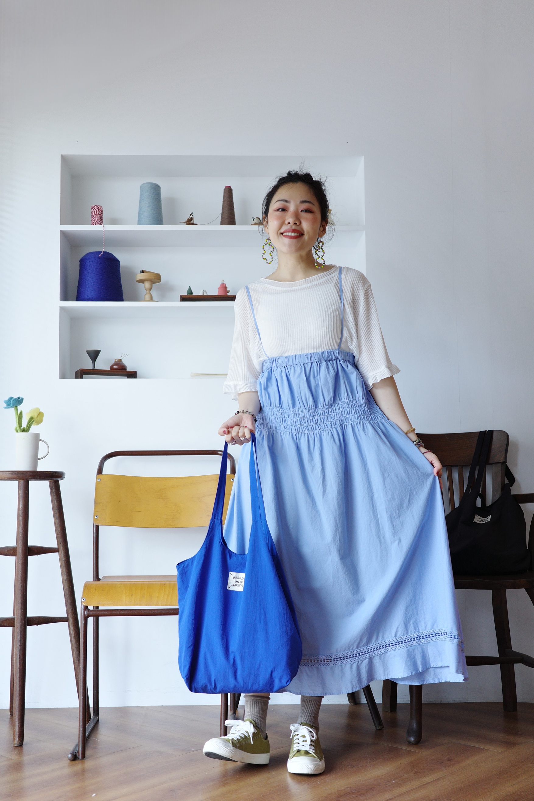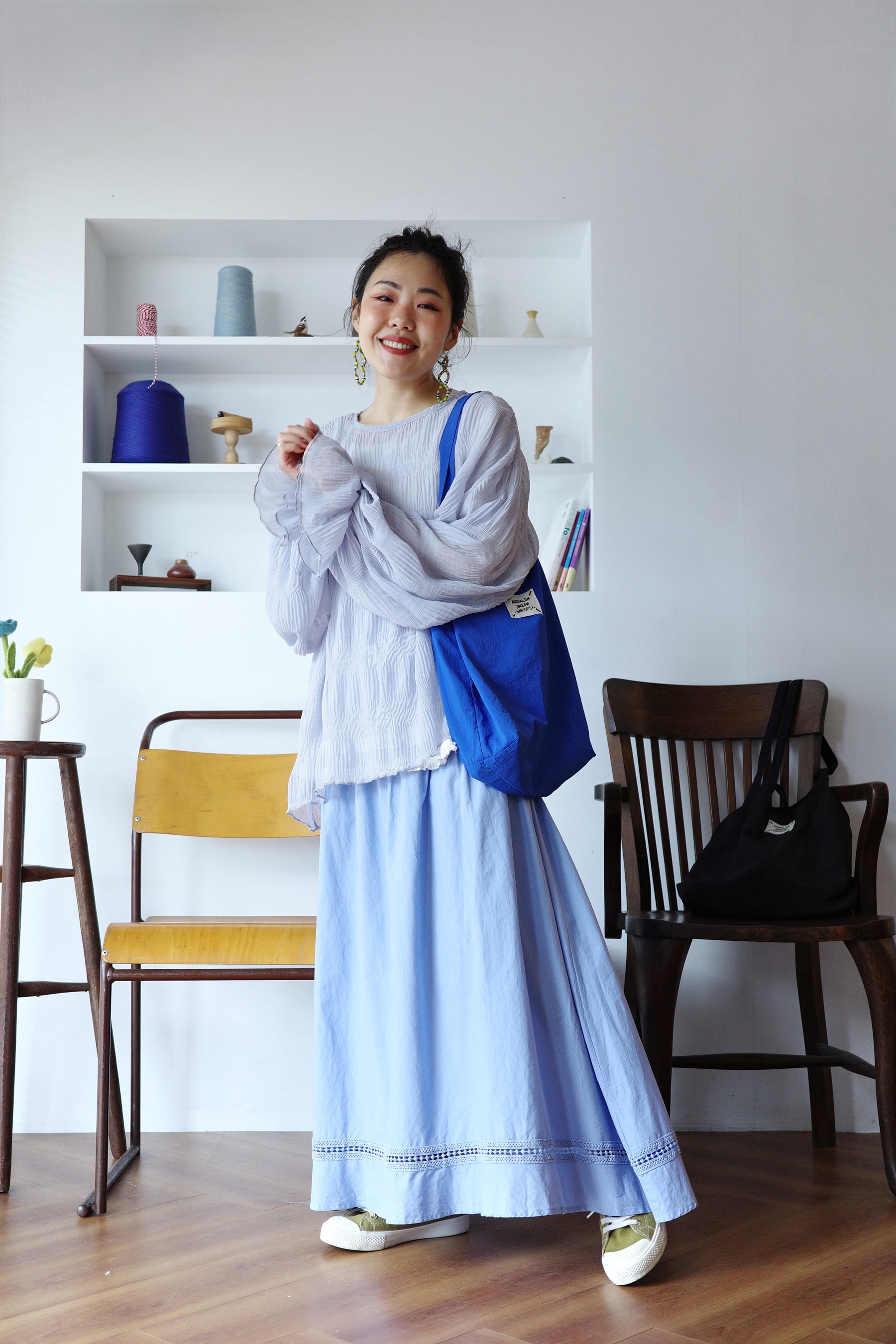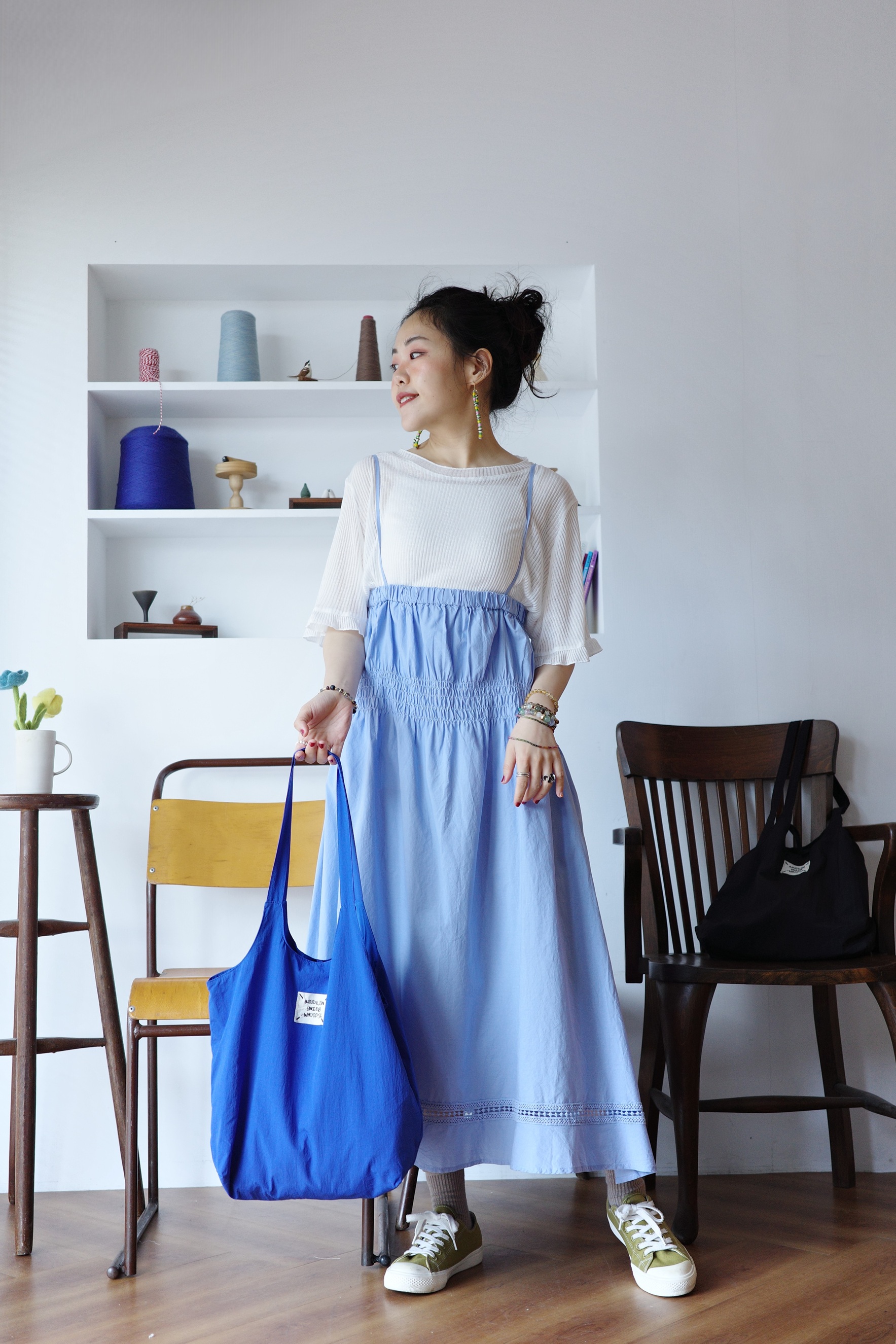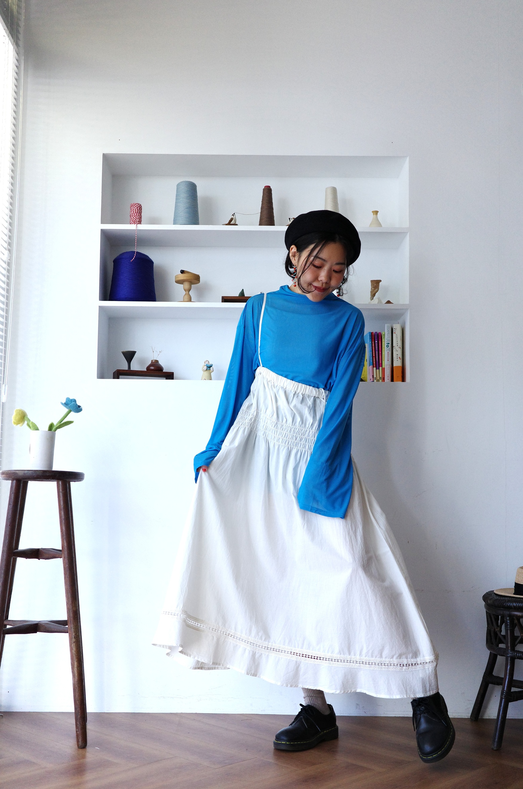 可以作為一般半身裙著用,裙擺鏤空織帶點綴, 還可以當作平口小洋裝,或是繫上內側的吊帶變細肩吊帶洋裝!!