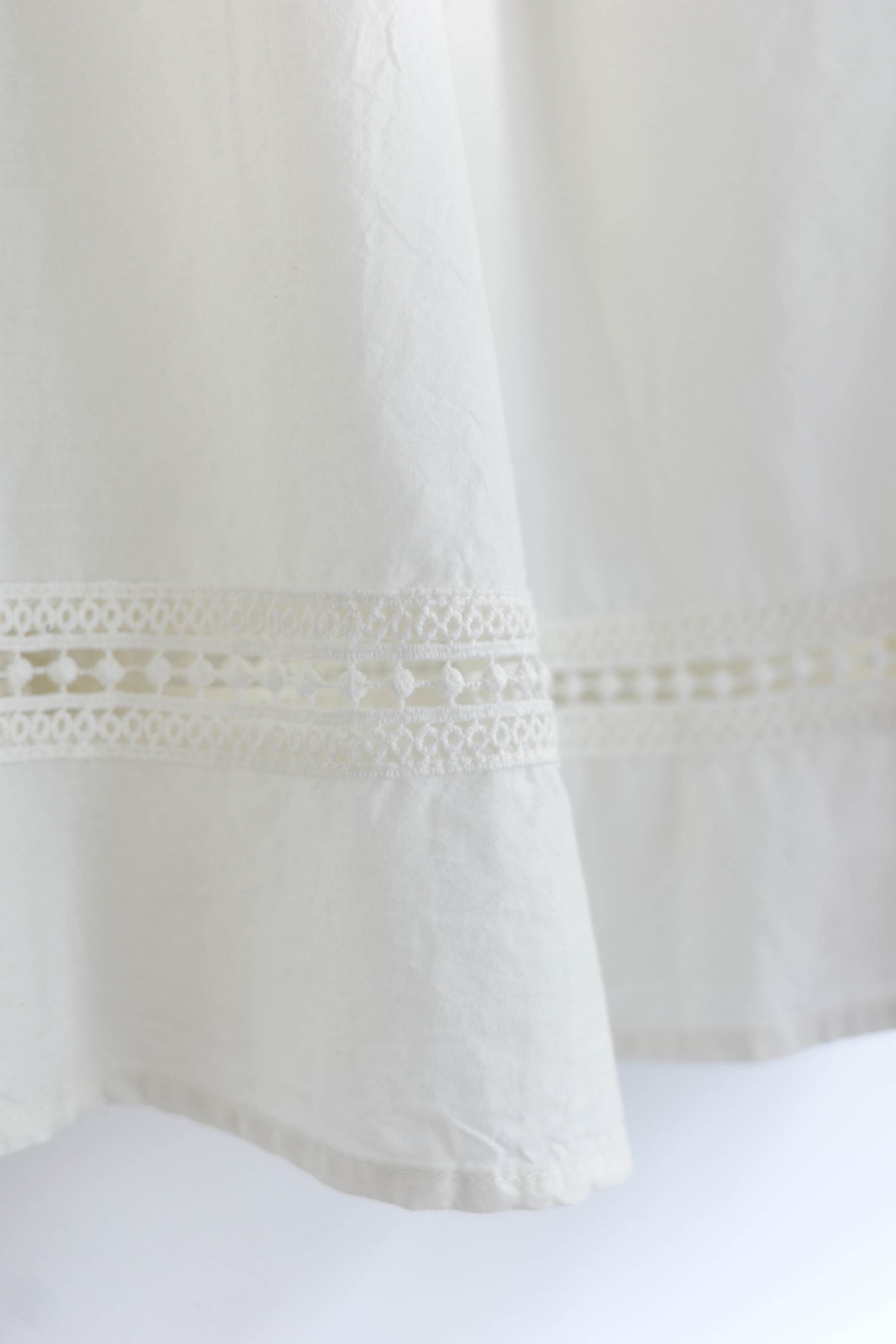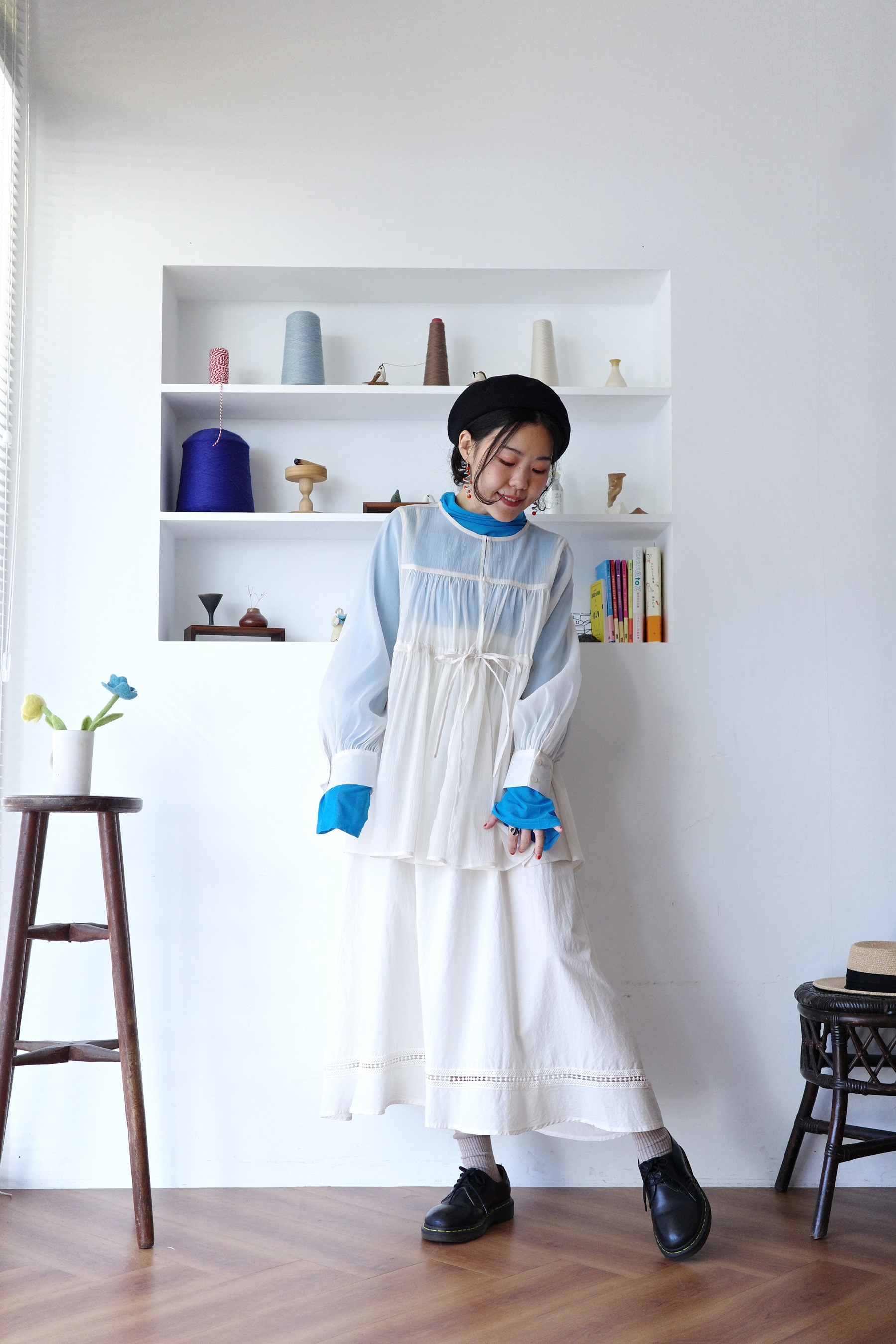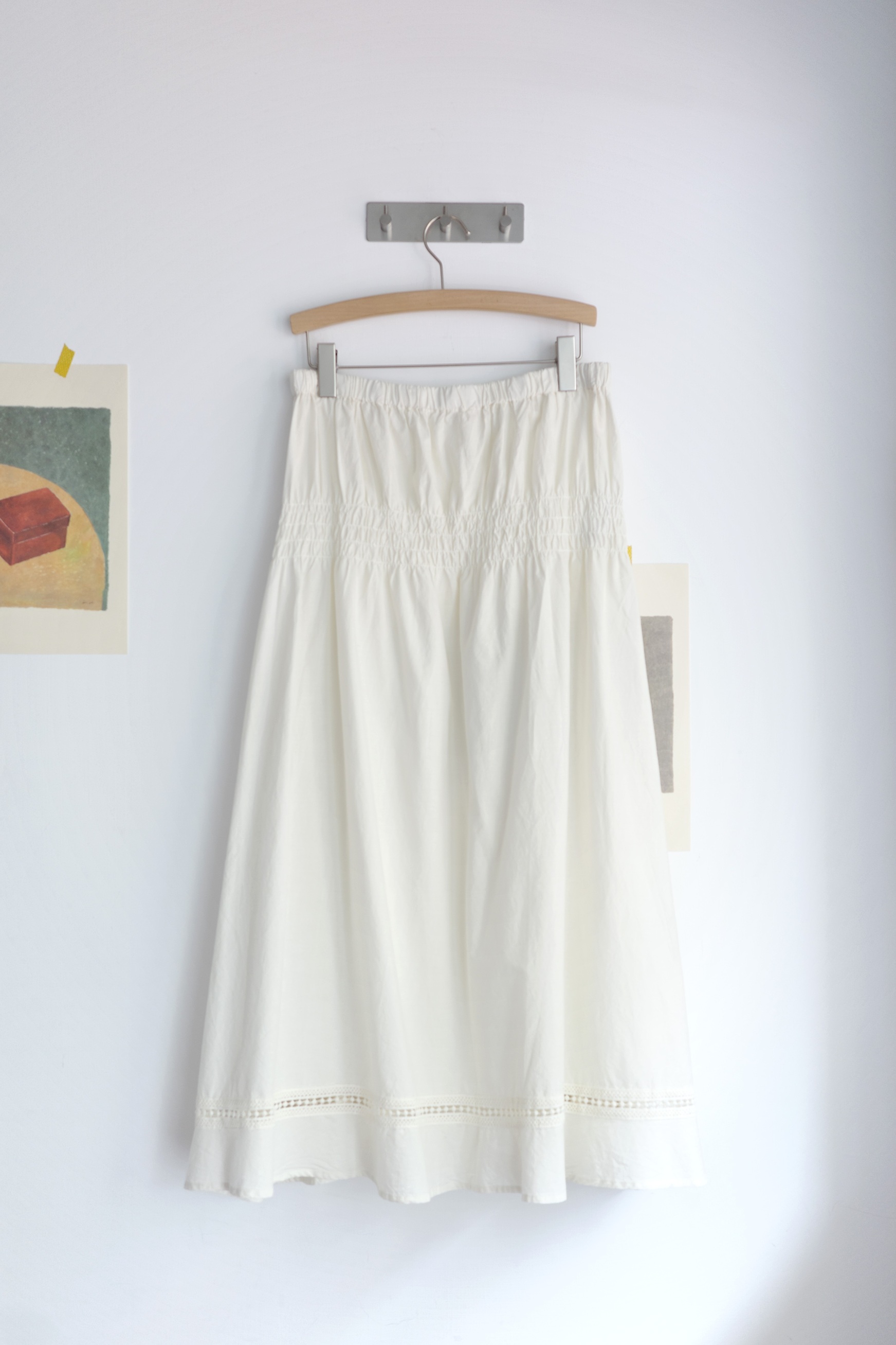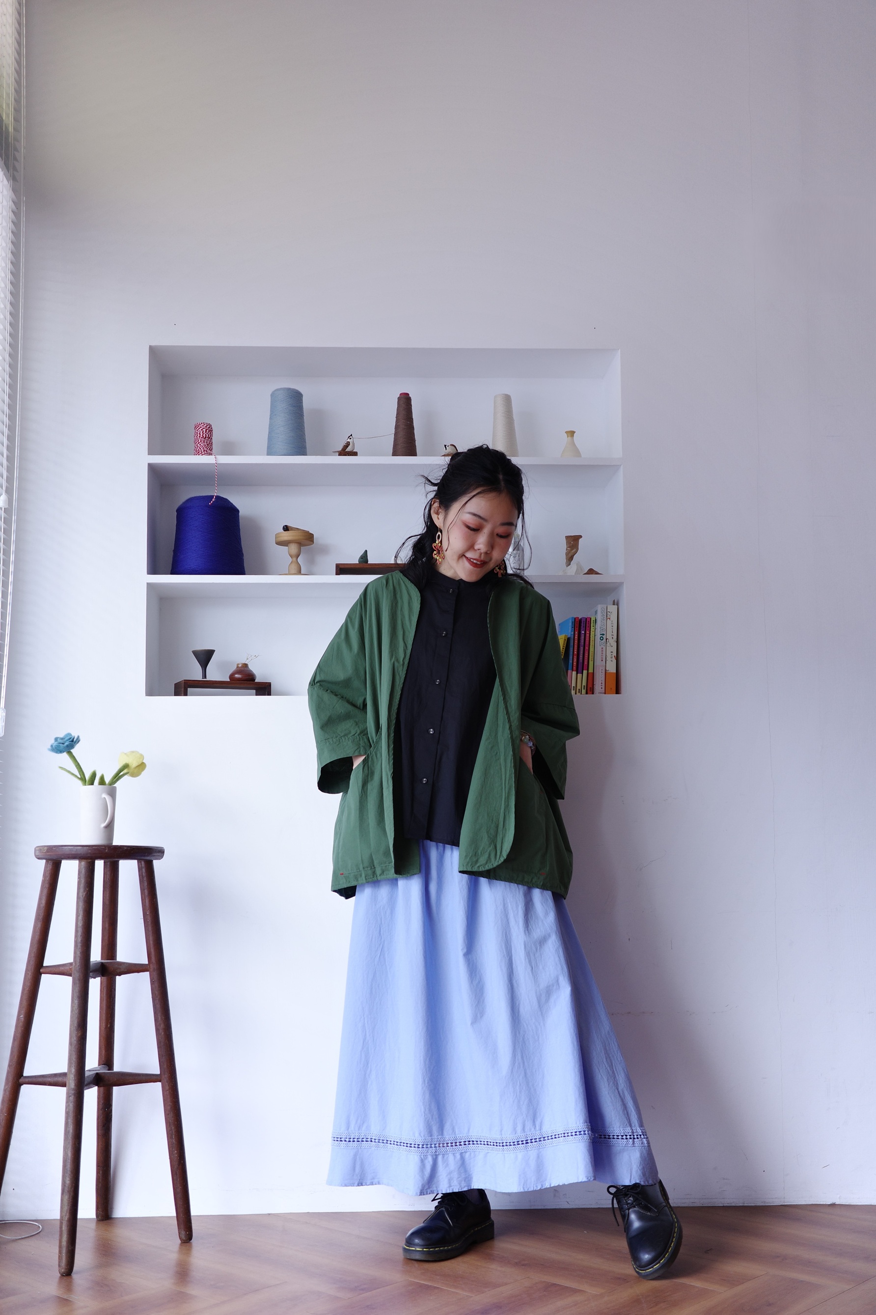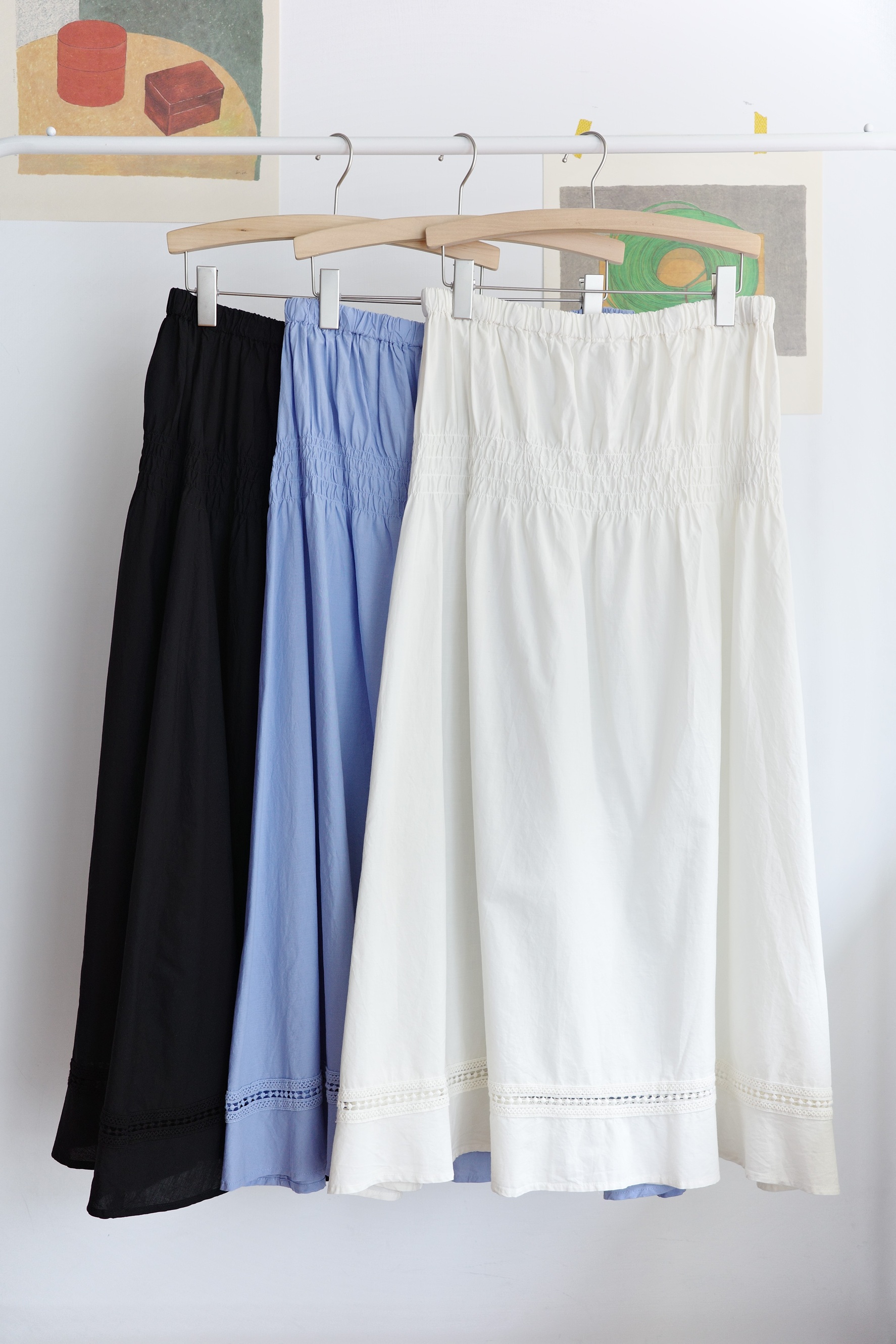 可以作為一般半身裙著用,裙擺鏤空織帶點綴, 還可以當作平口小洋裝,或是繫上內側的吊帶變細肩吊帶洋裝!!