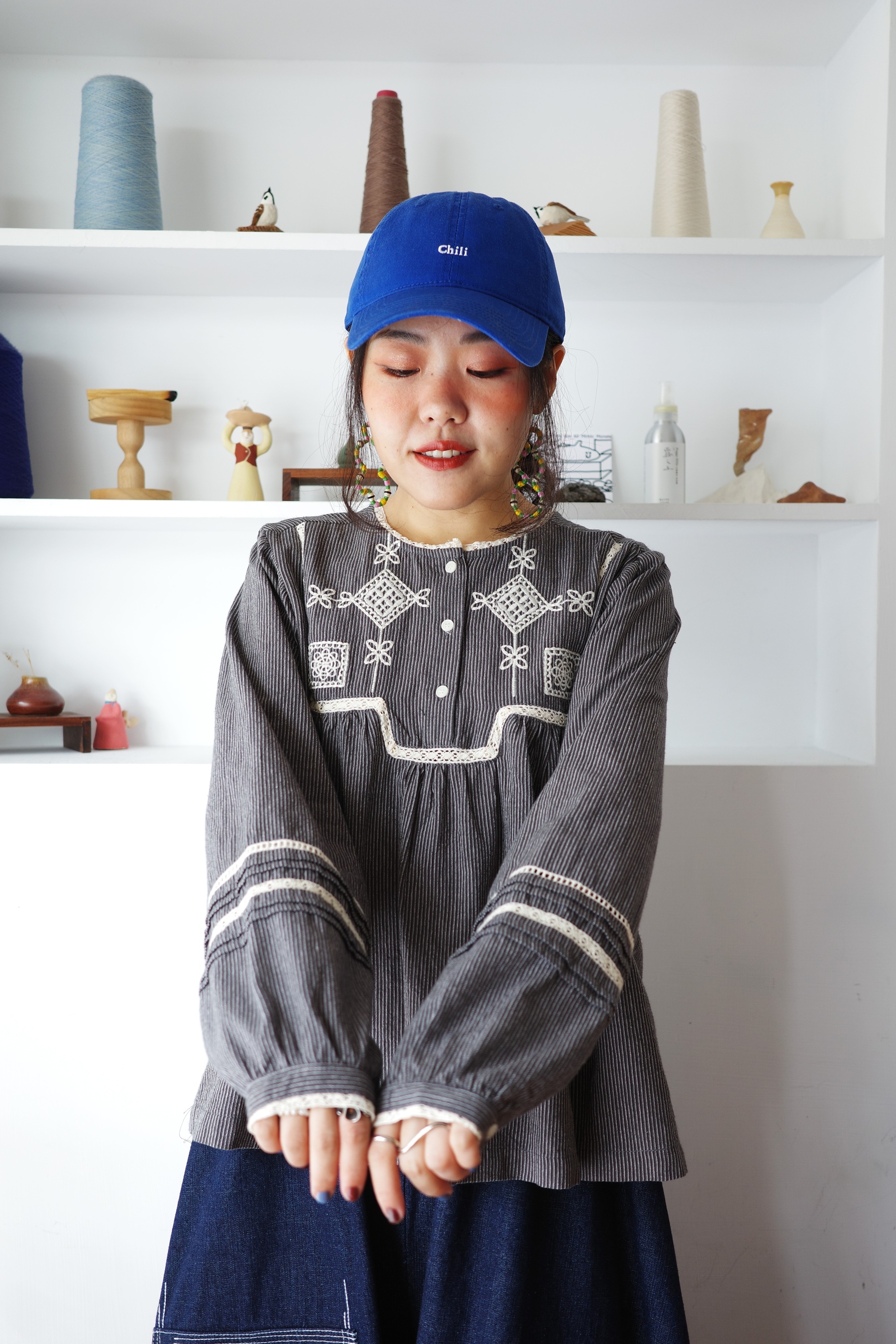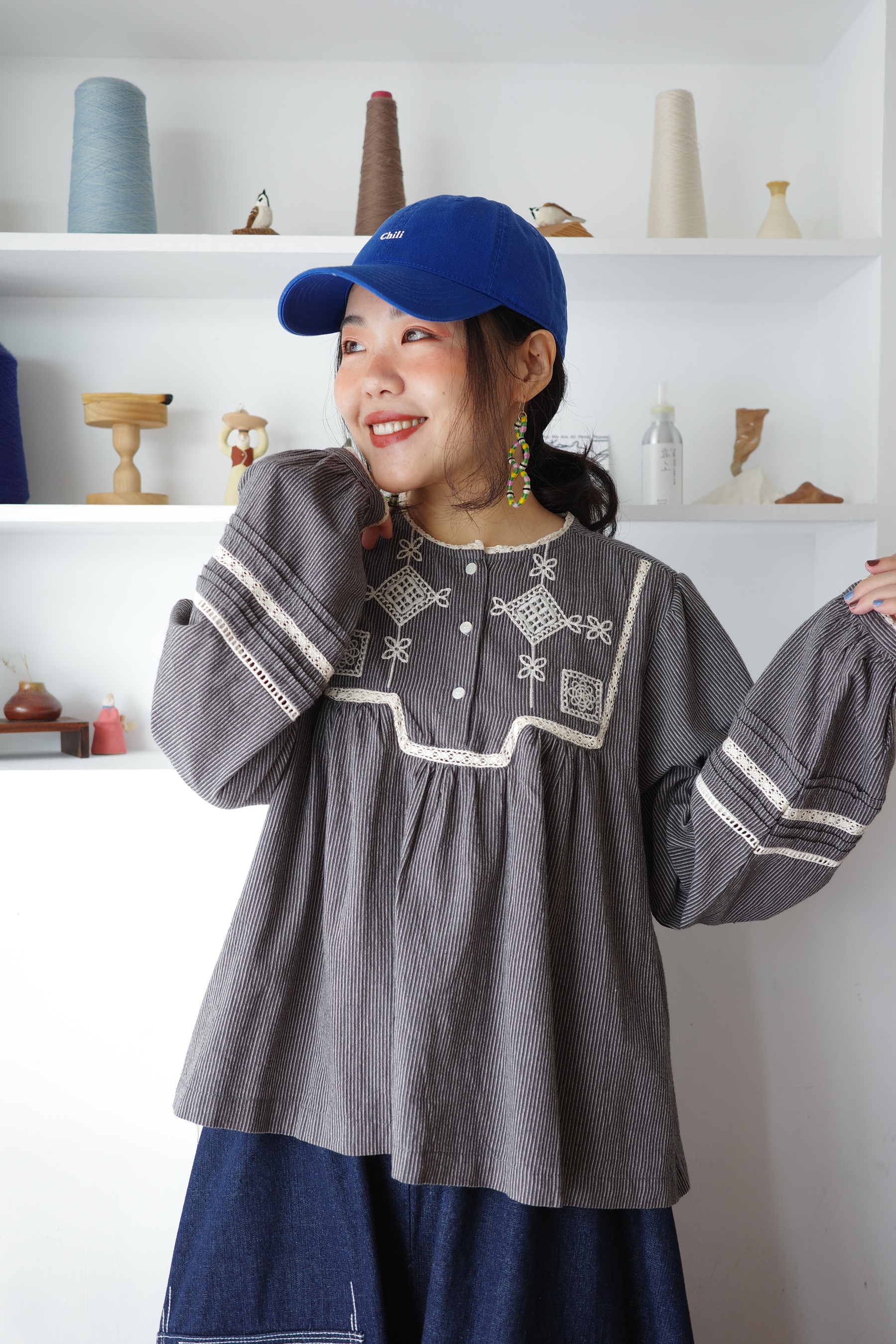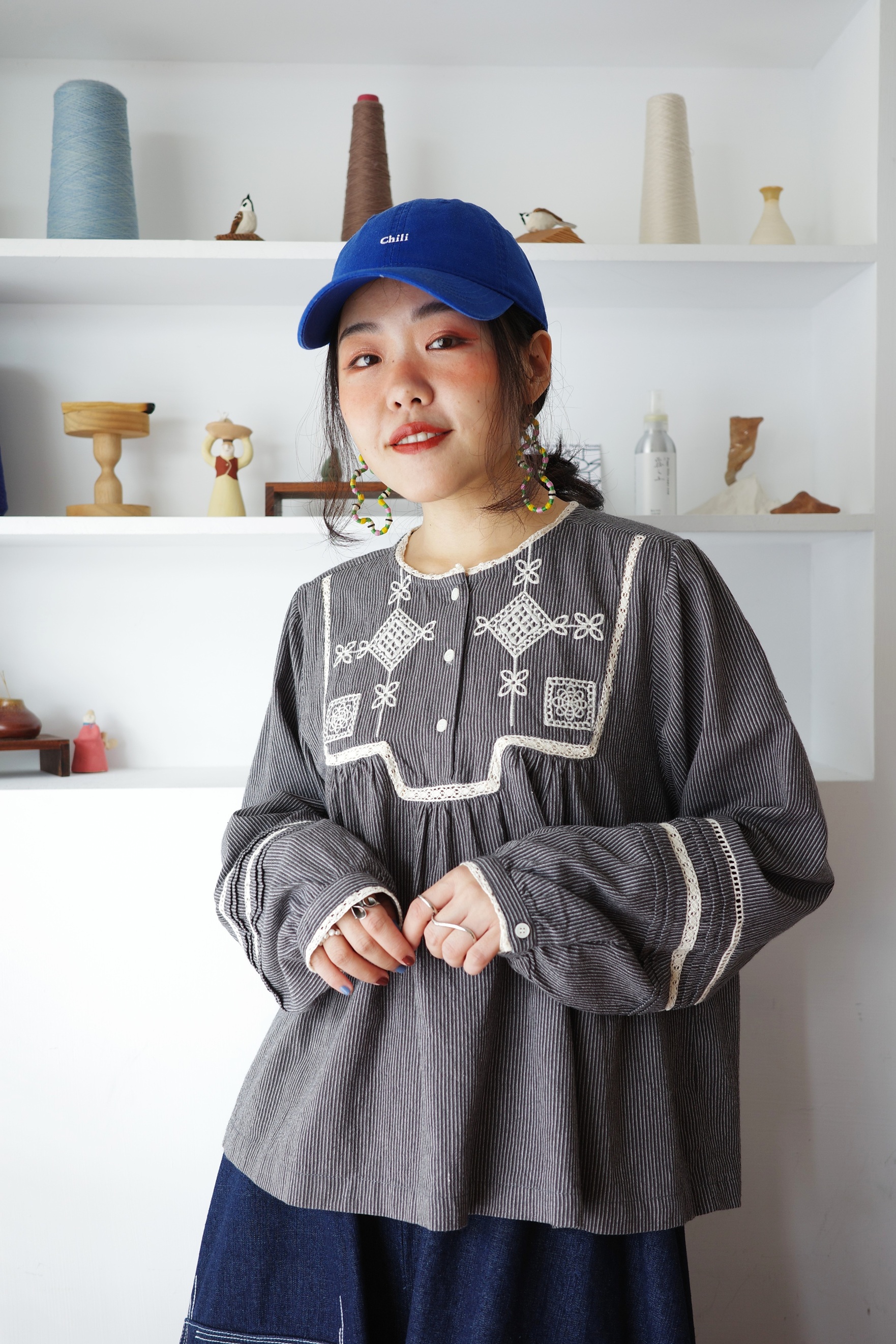 𓏭圖騰刺繡鏤空織帶直紋上衣