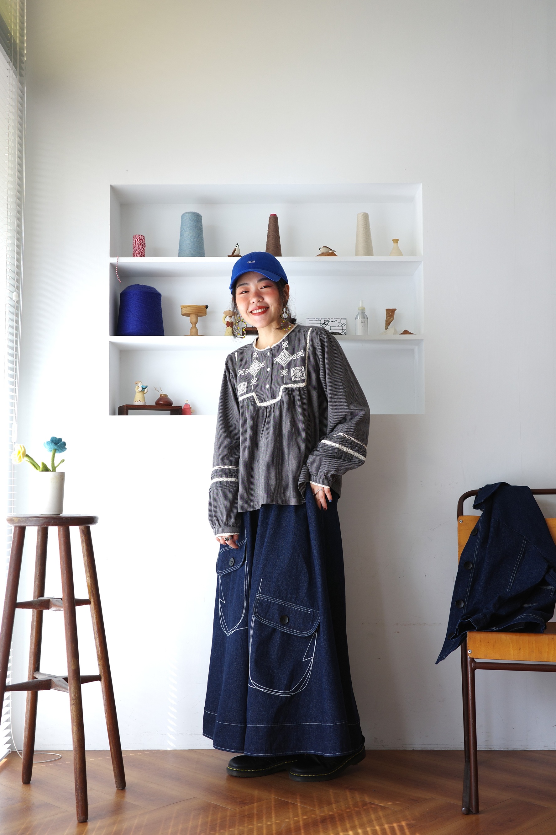 領口半開釦,也非常適合把扣子開成V領搭配木耳立領上衣一起穿堆疊層次。