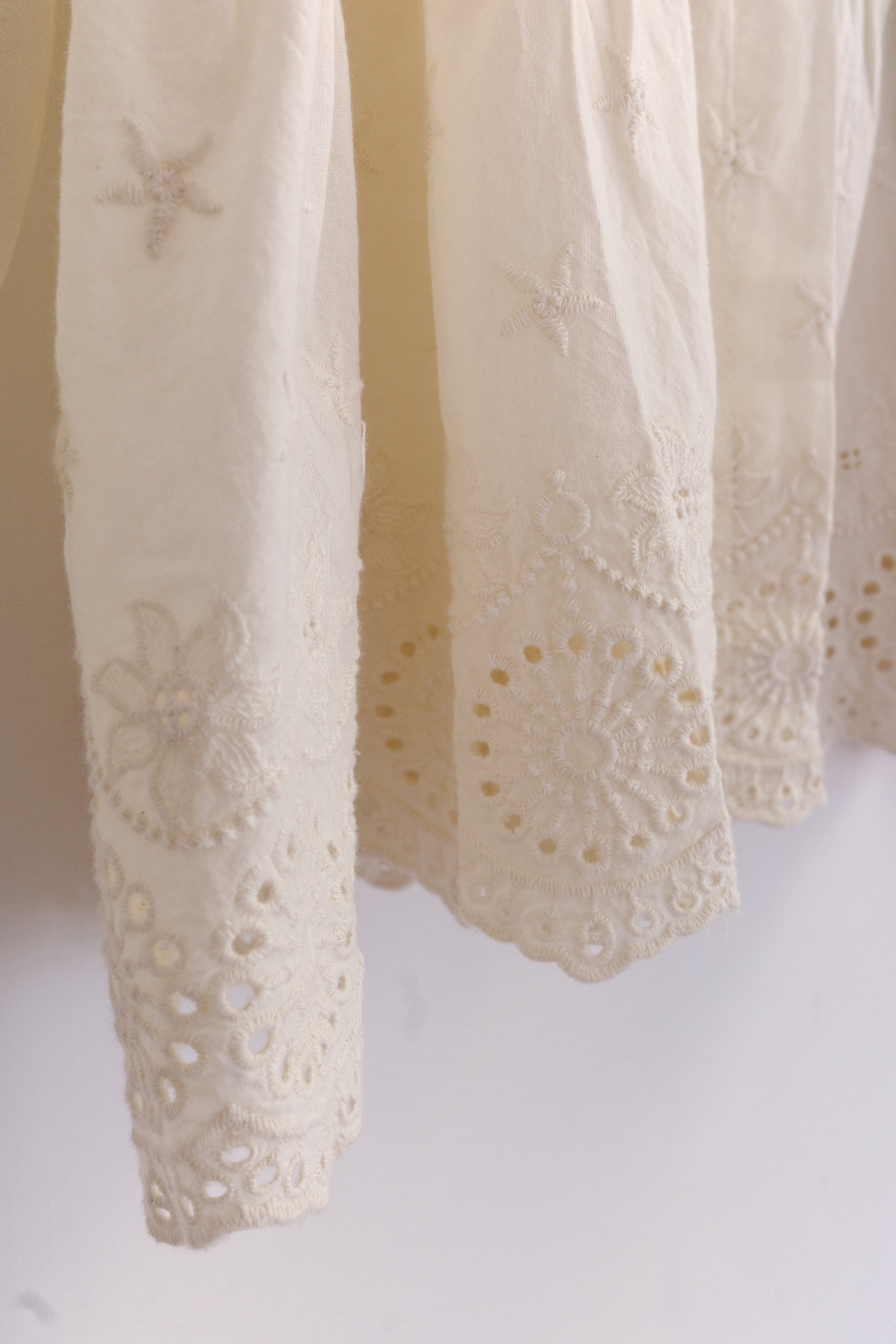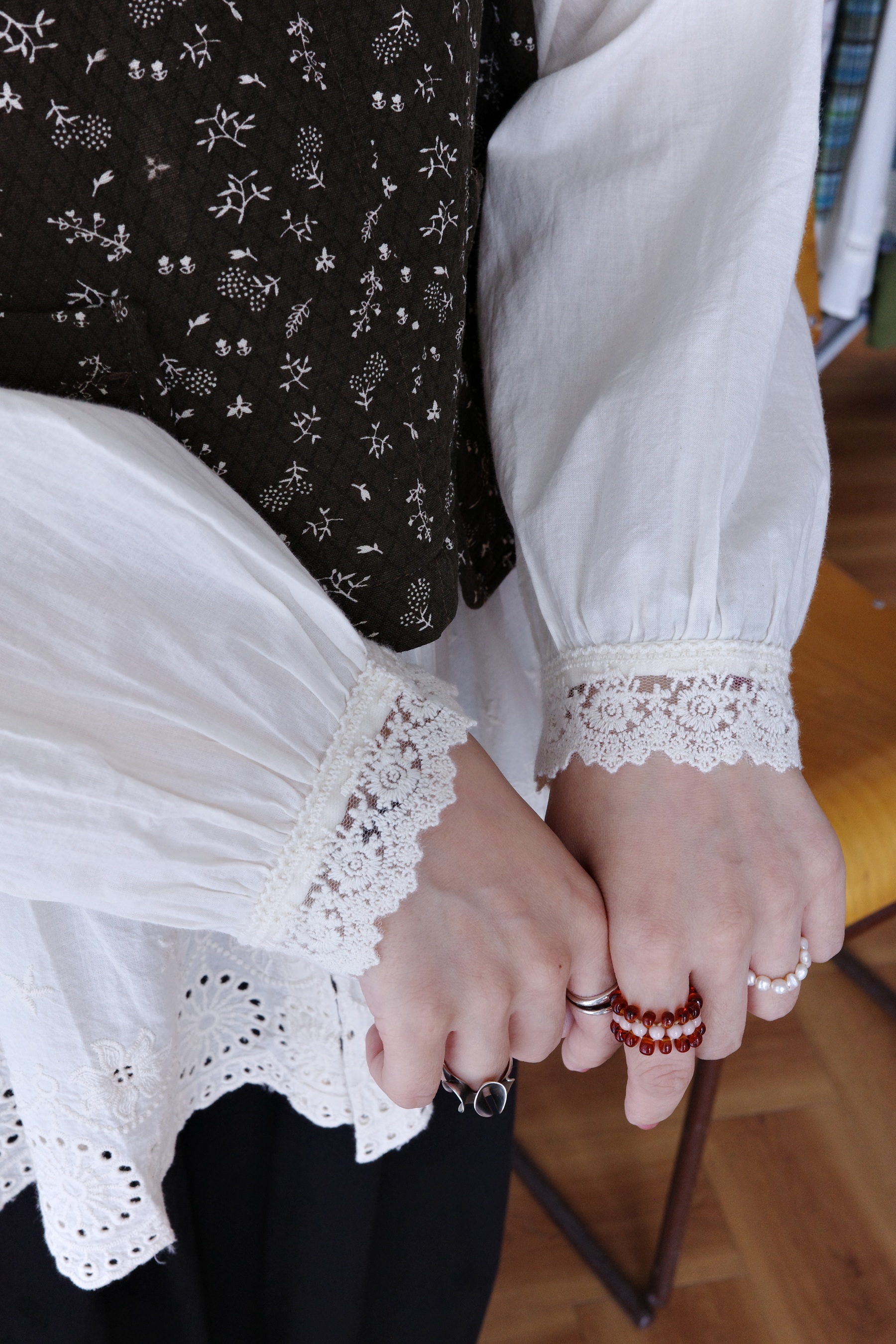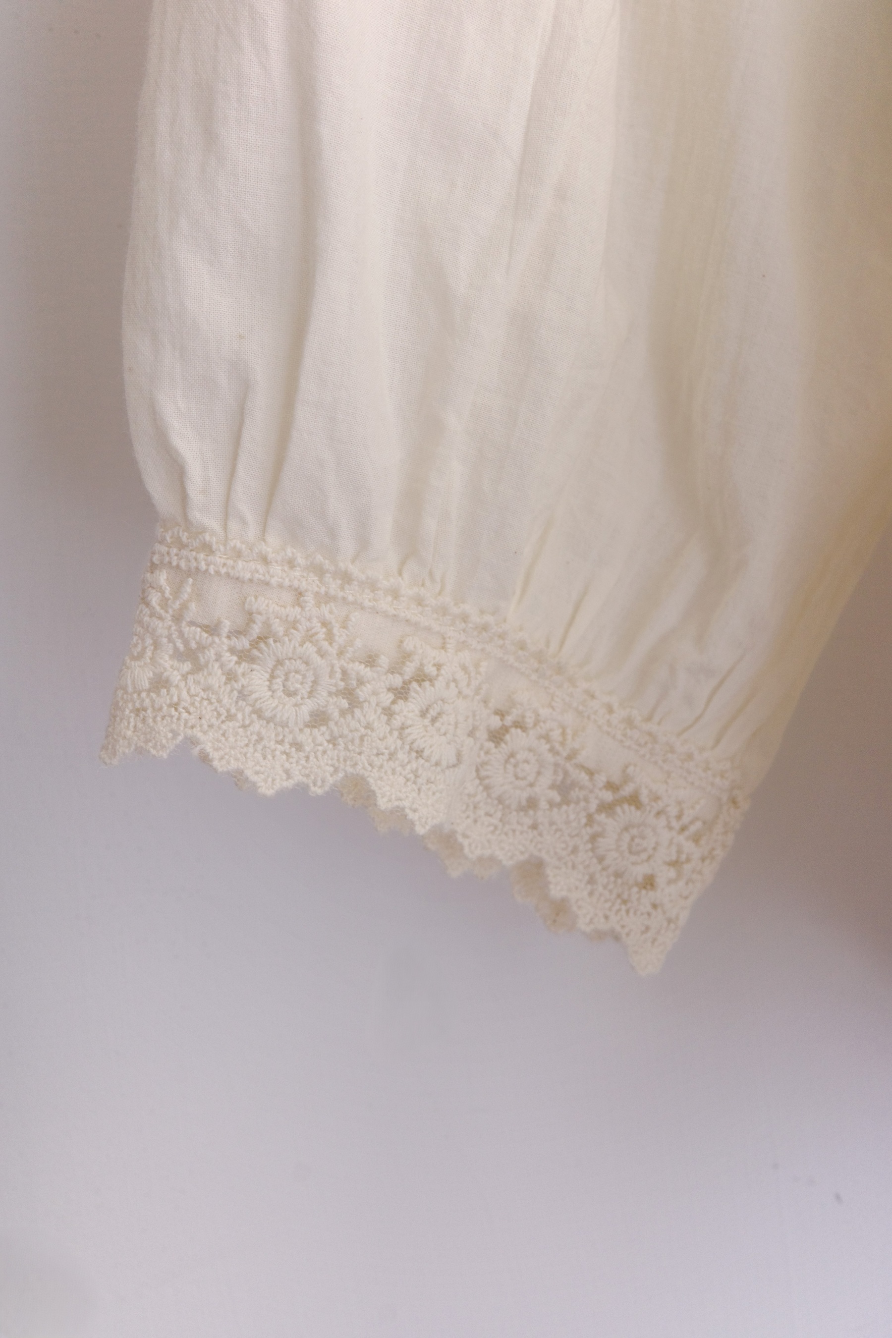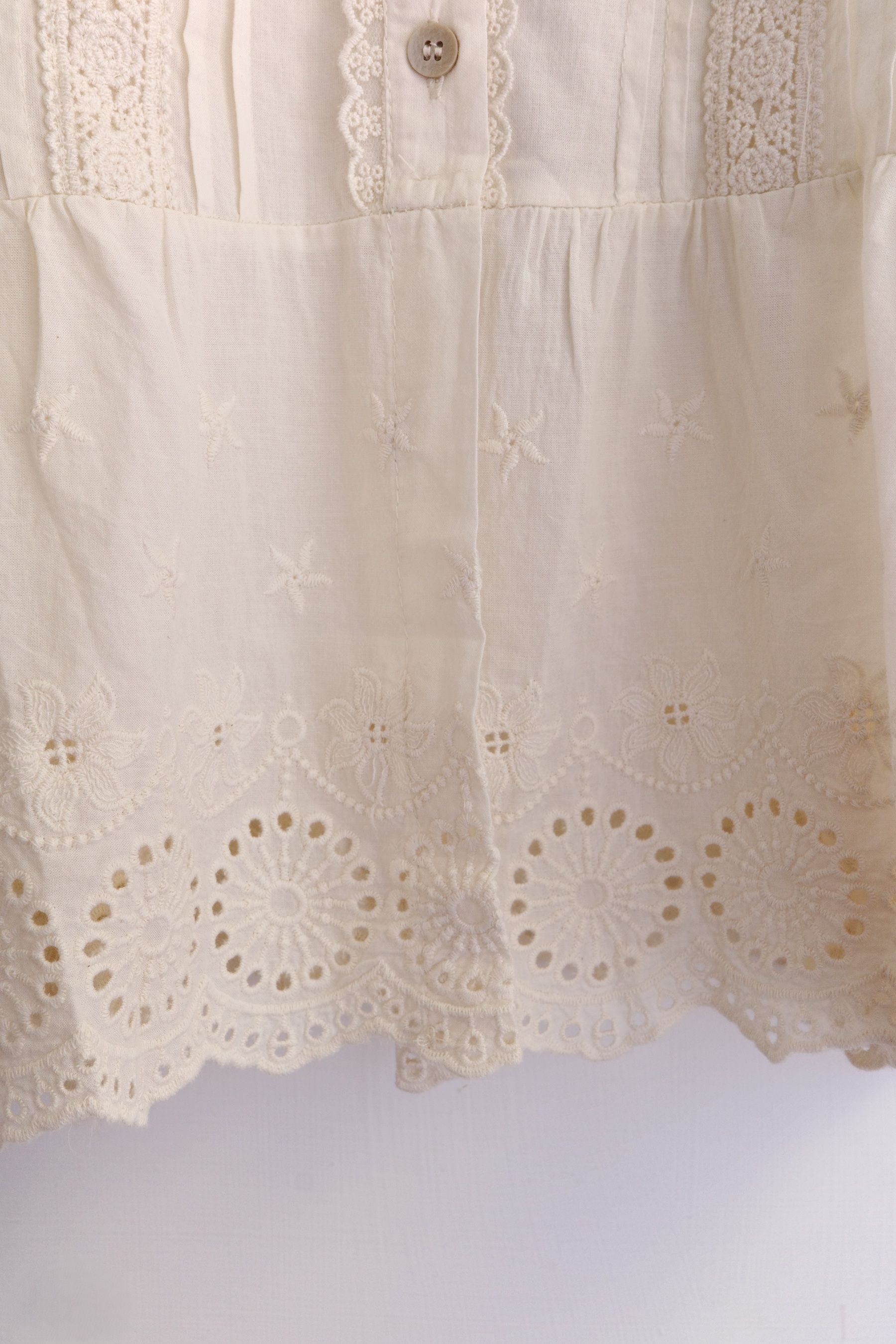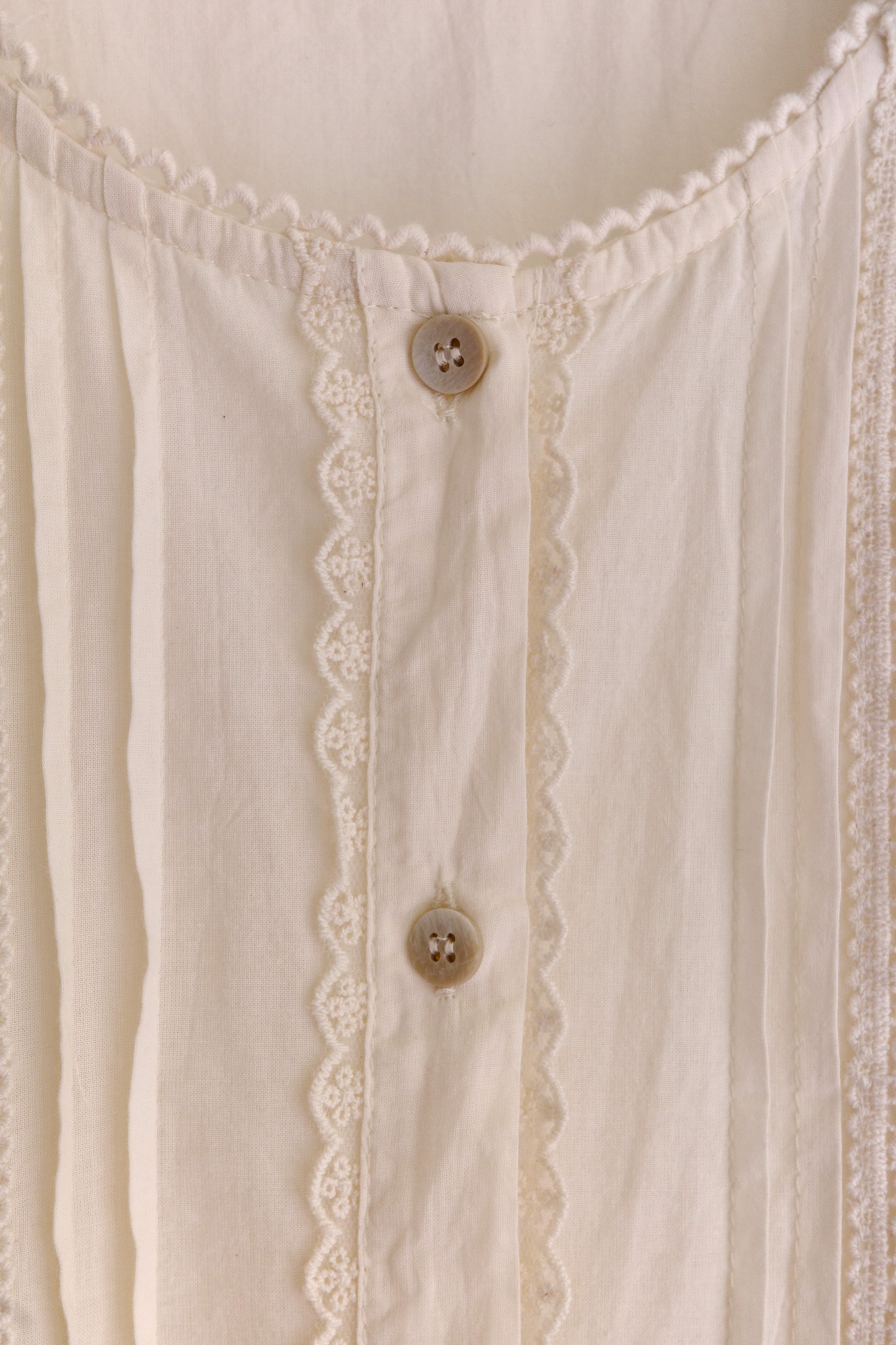 門襟兩側壓摺蕾絲拼接點綴,非常精緻優雅,領口也有波浪小蕾絲滾邊。