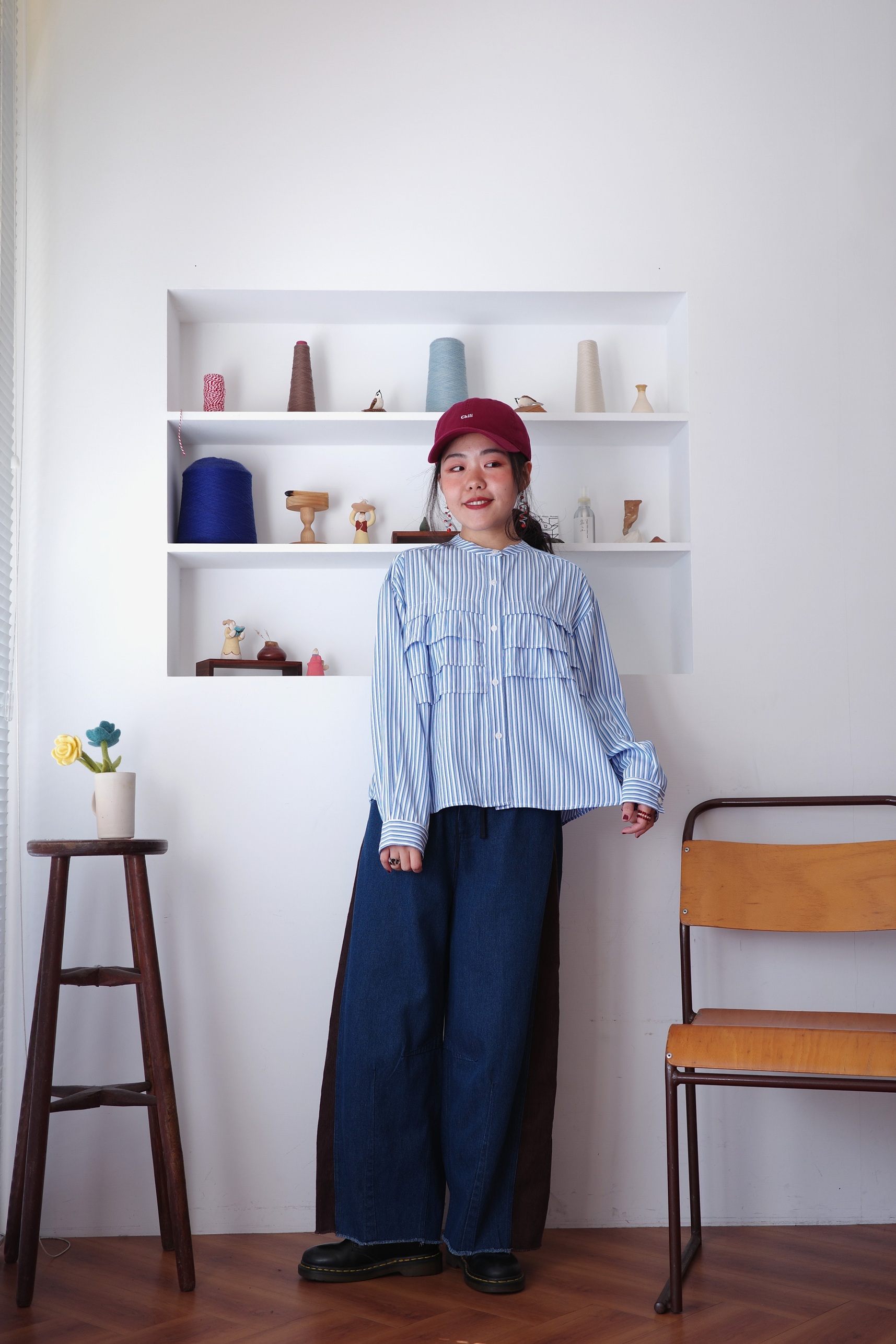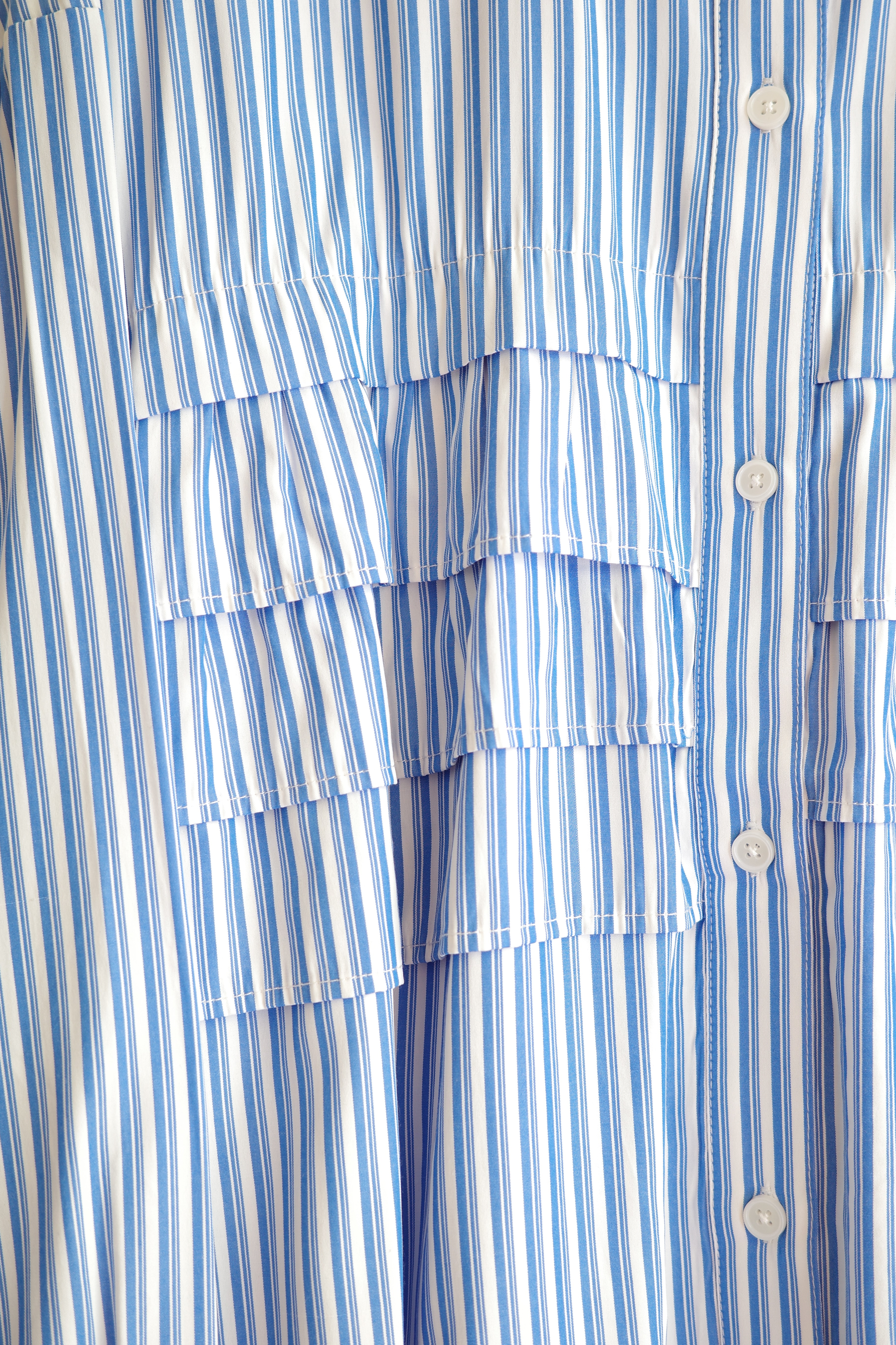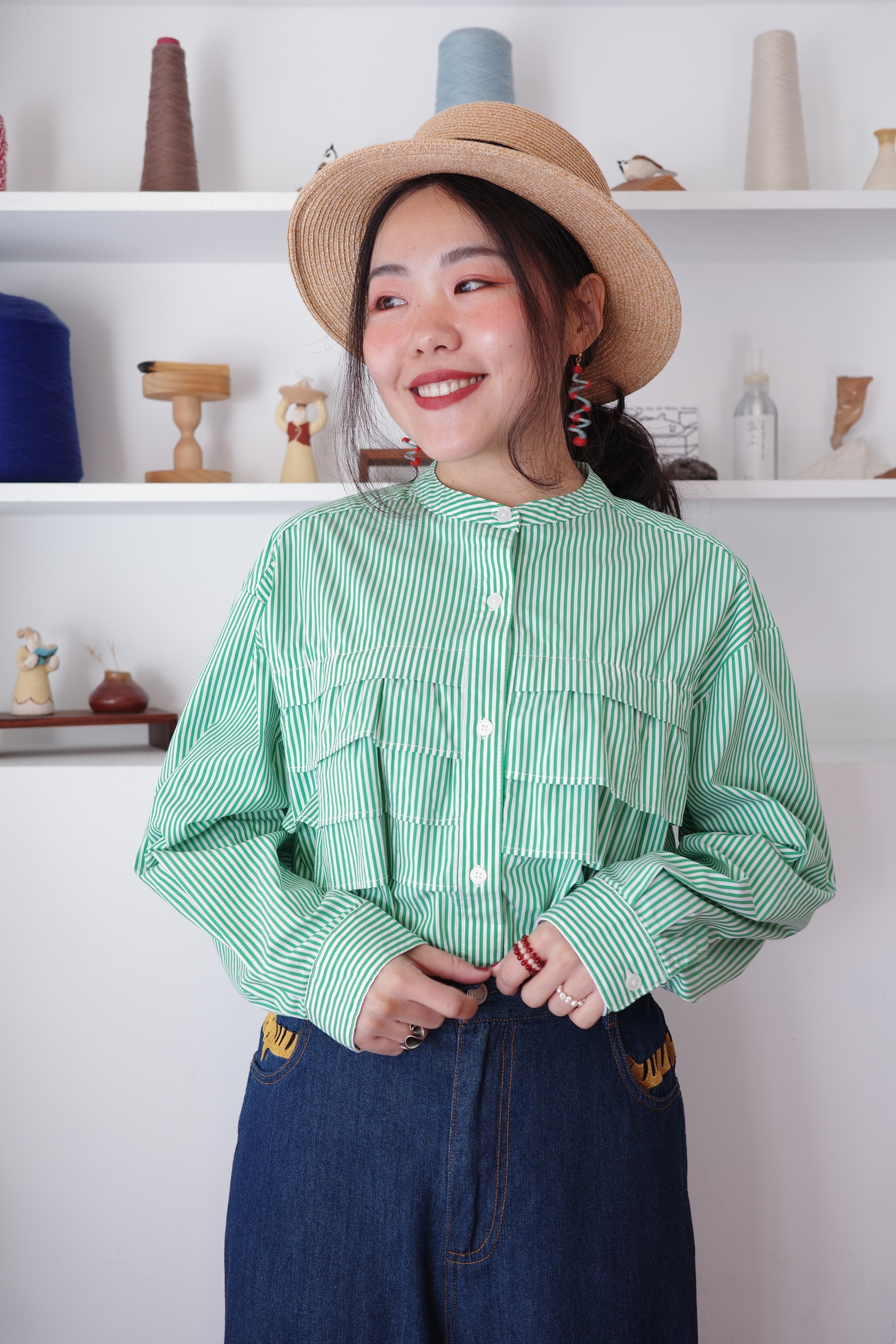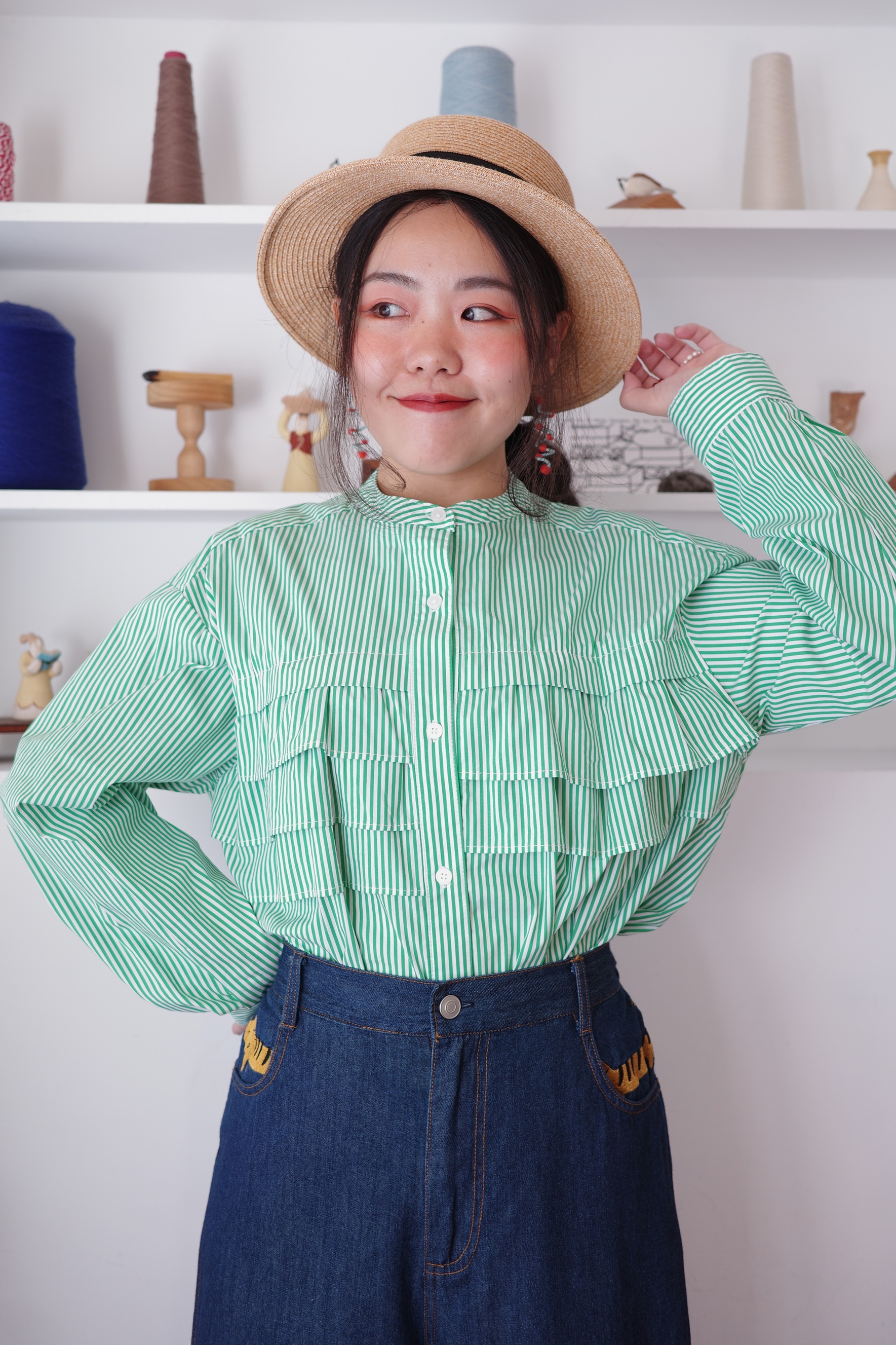 對比明亮的直紋襯衫以層次堆疊的荷葉邊點綴,