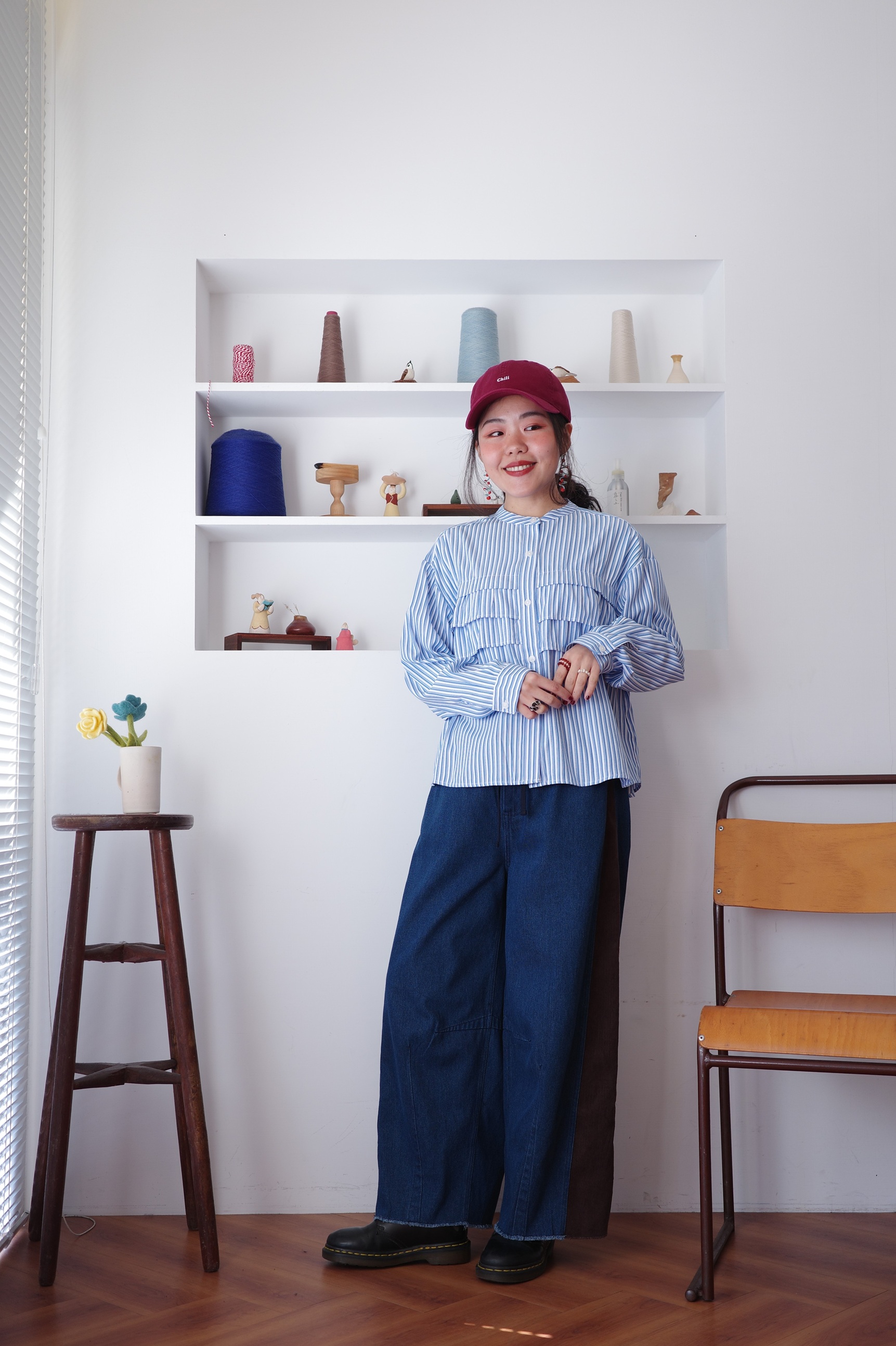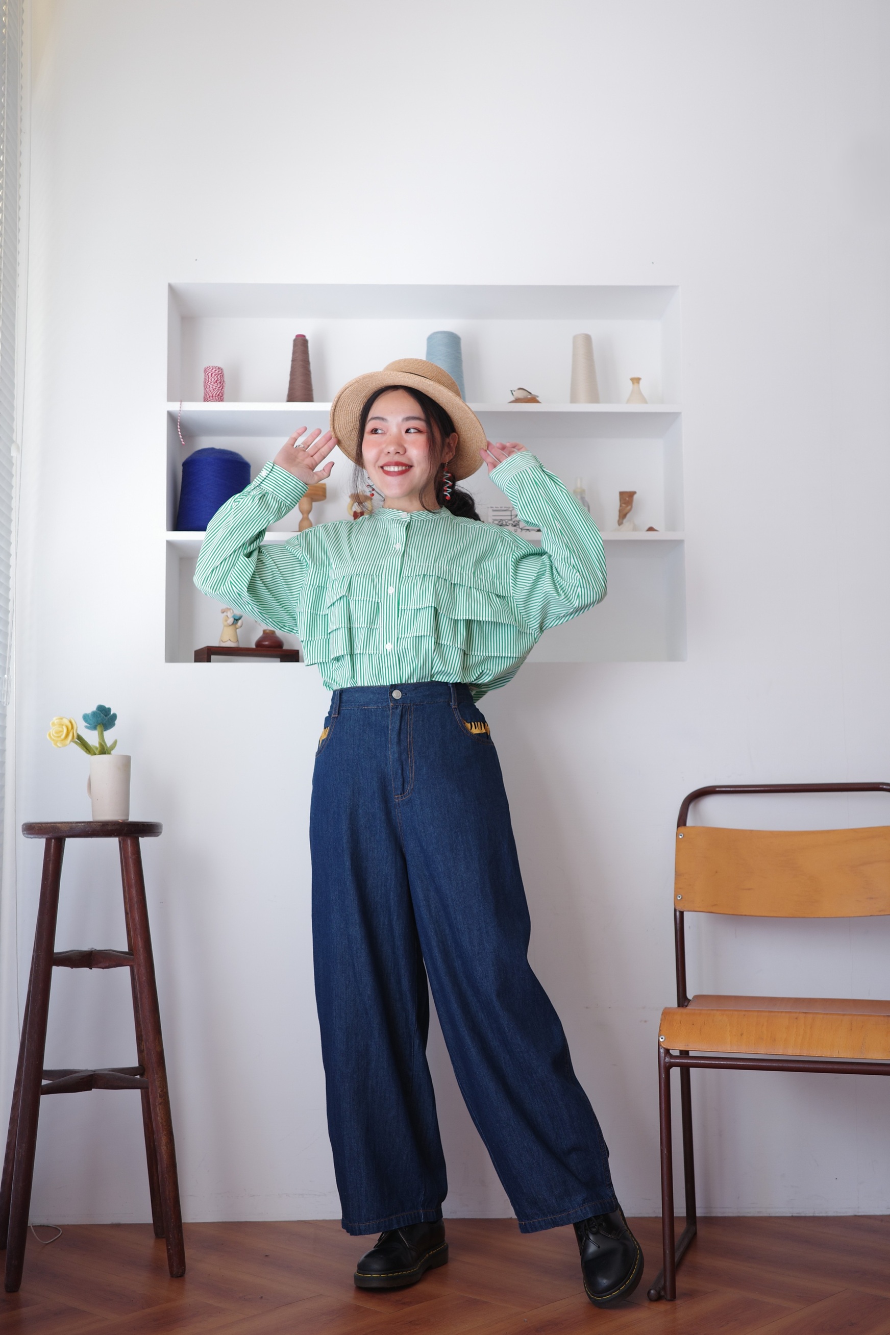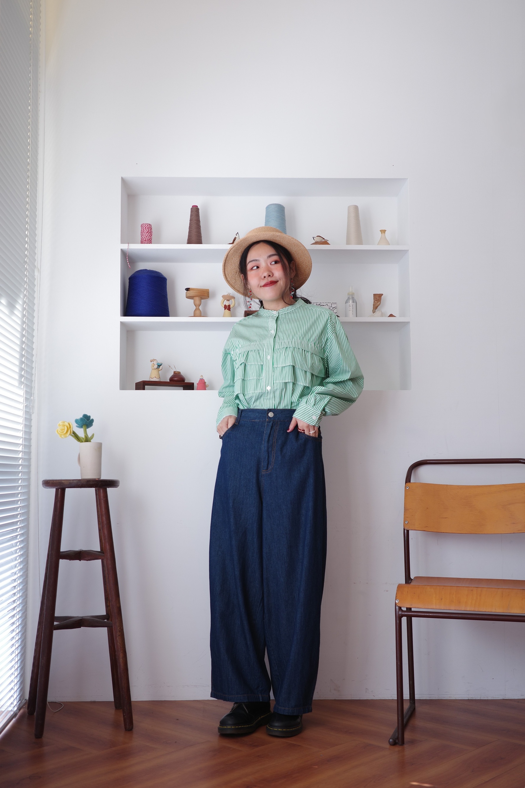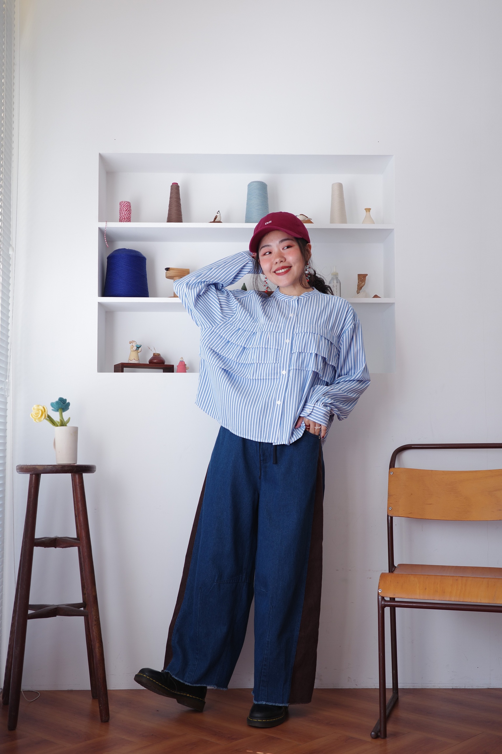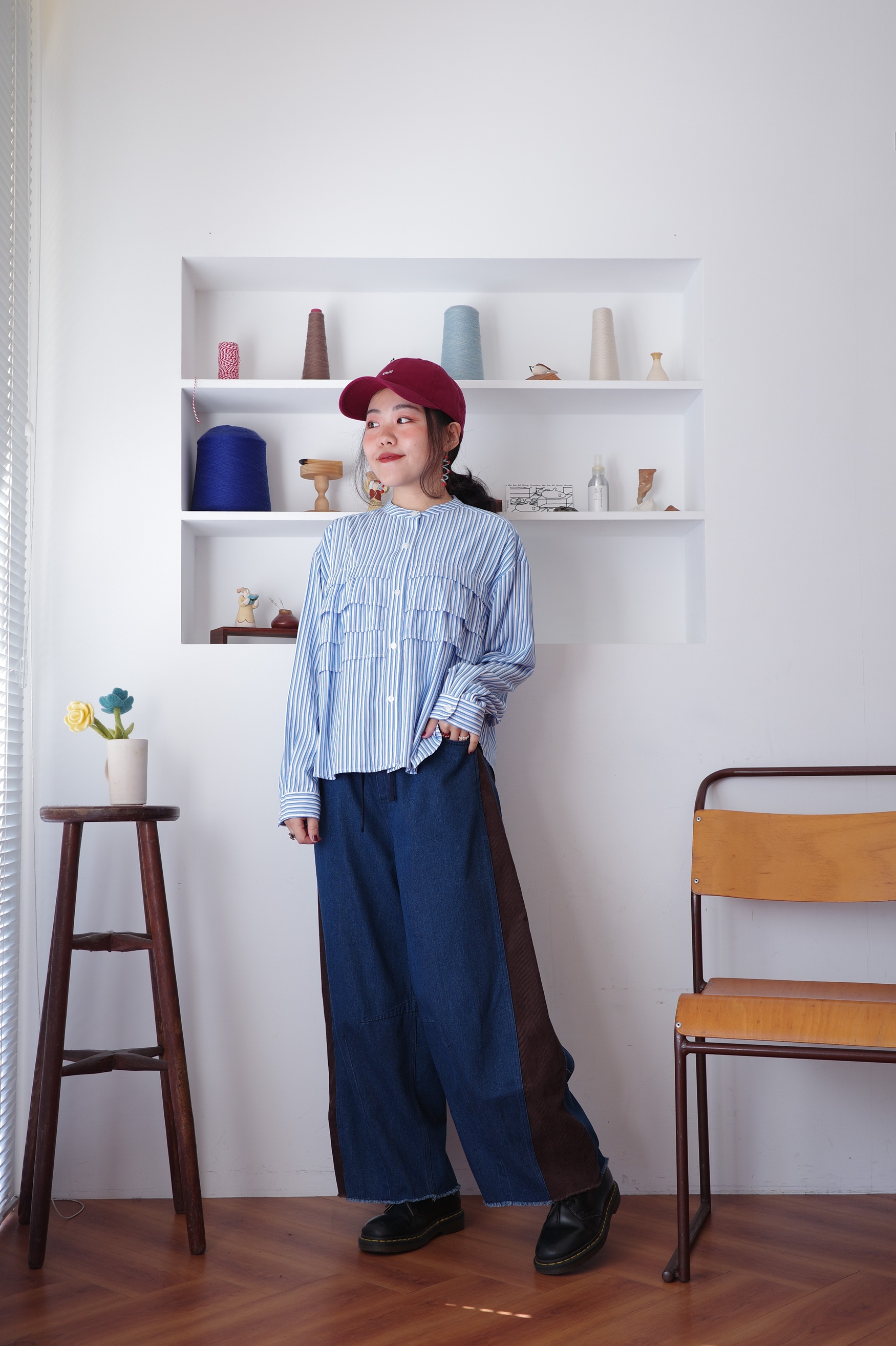 對比明亮的直紋襯衫以層次堆疊的荷葉邊點綴,