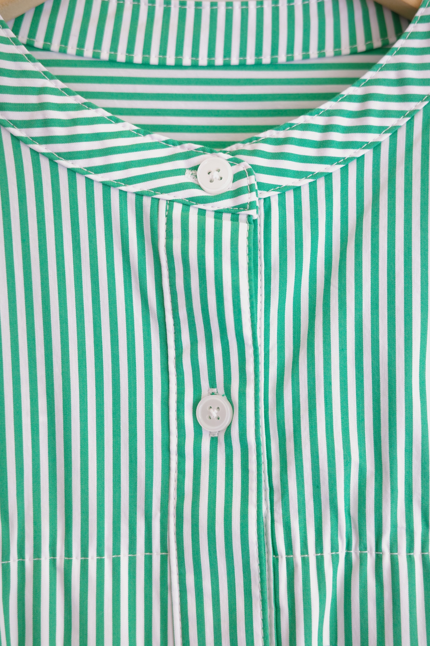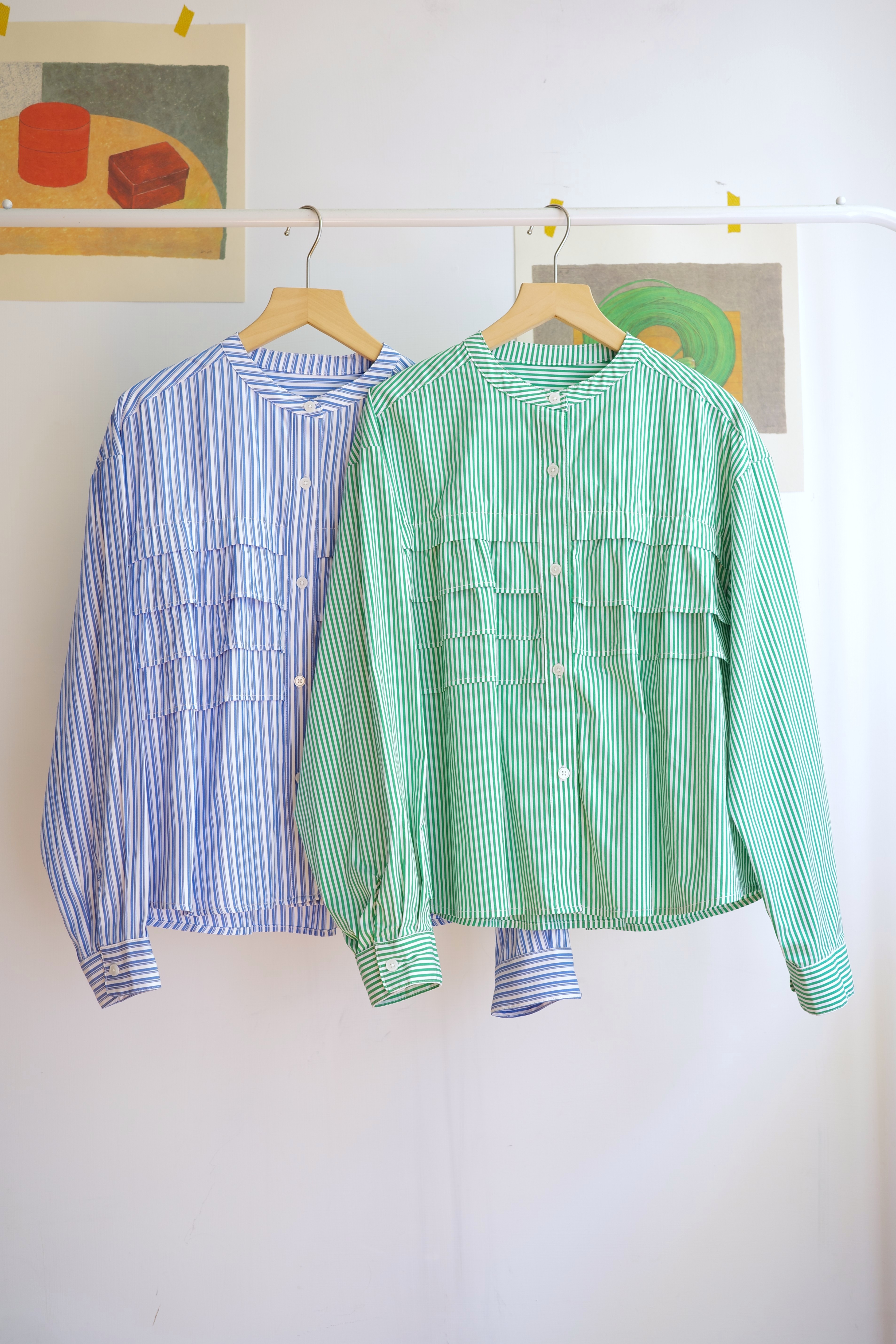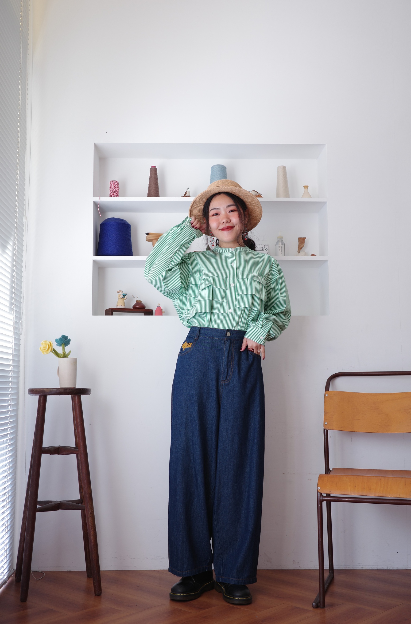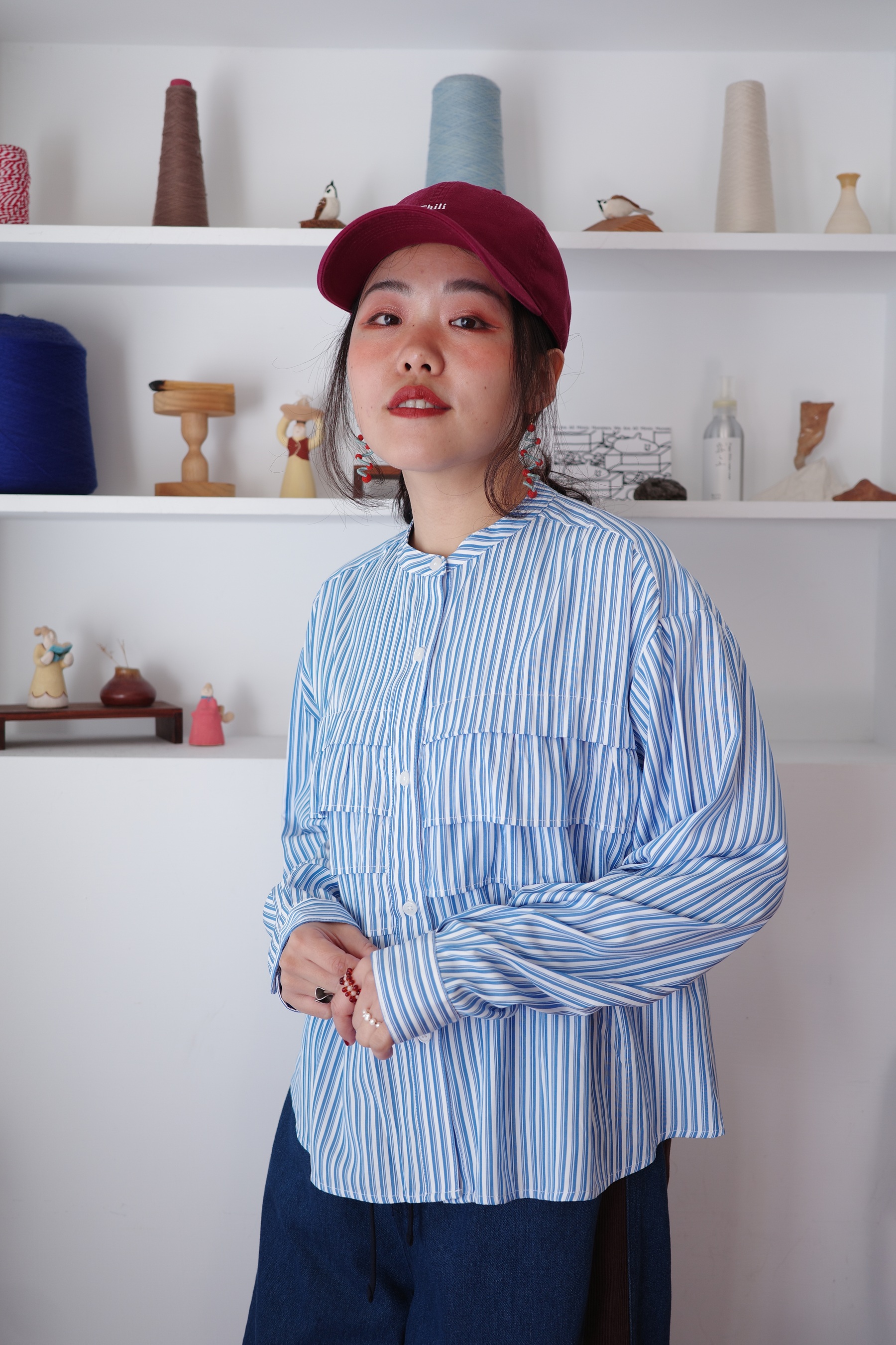 對比明亮的直紋襯衫以層次堆疊的荷葉邊點綴,