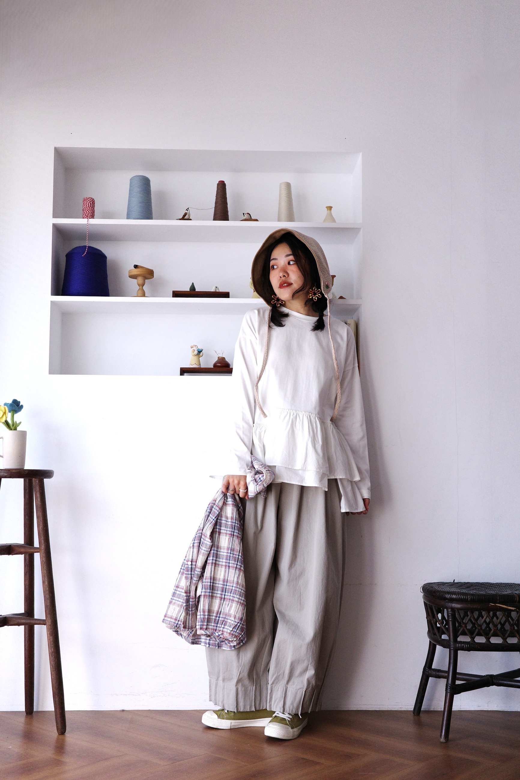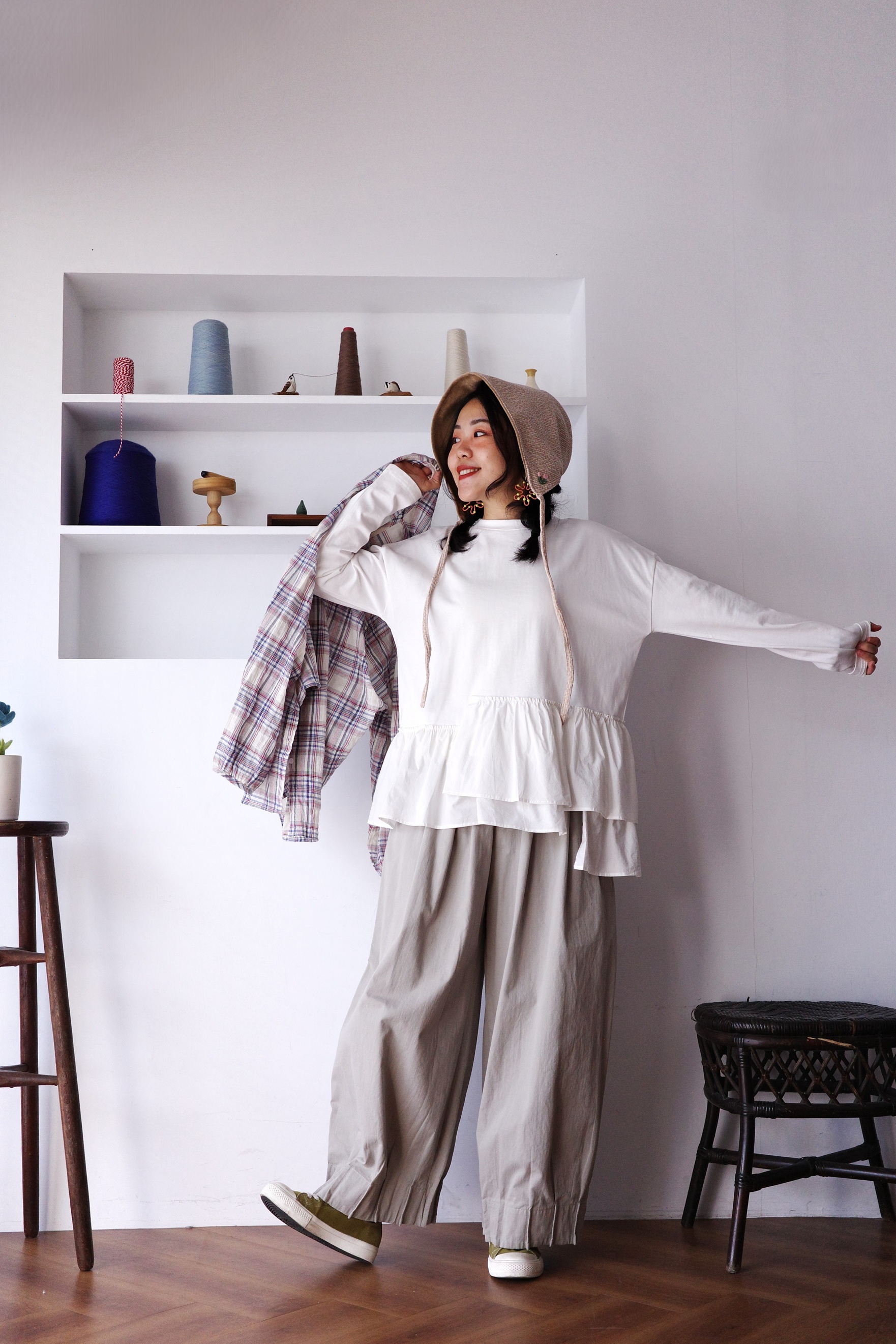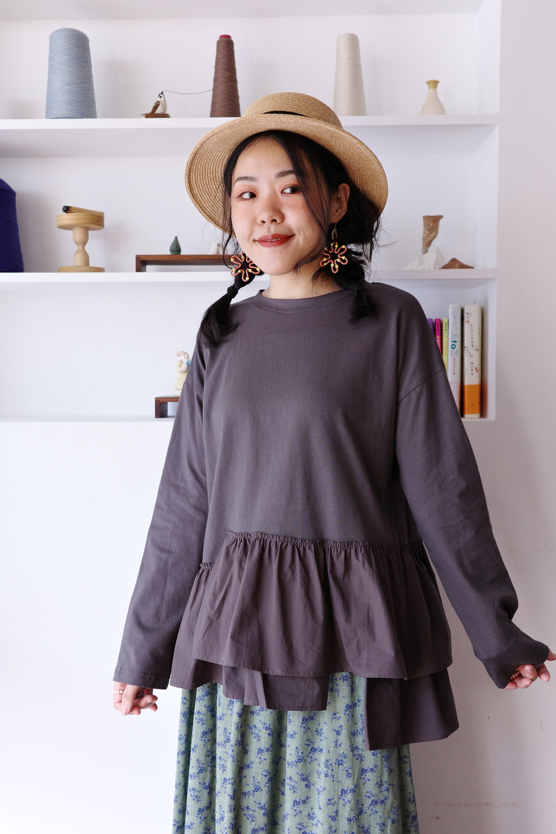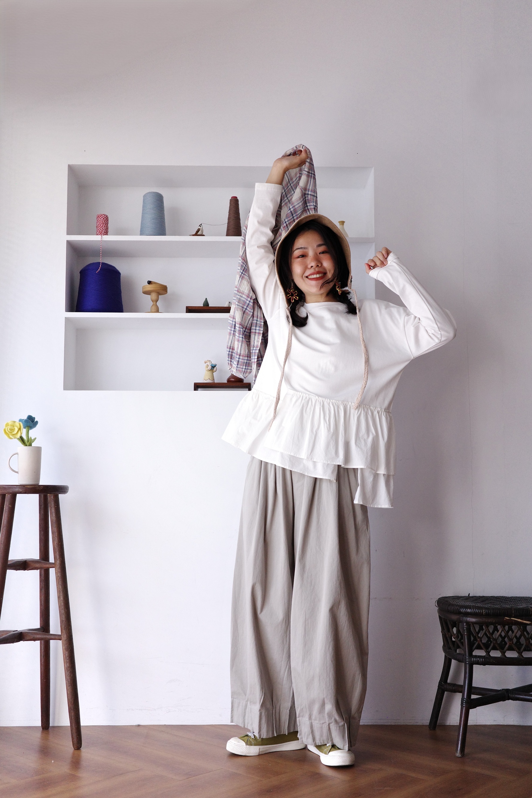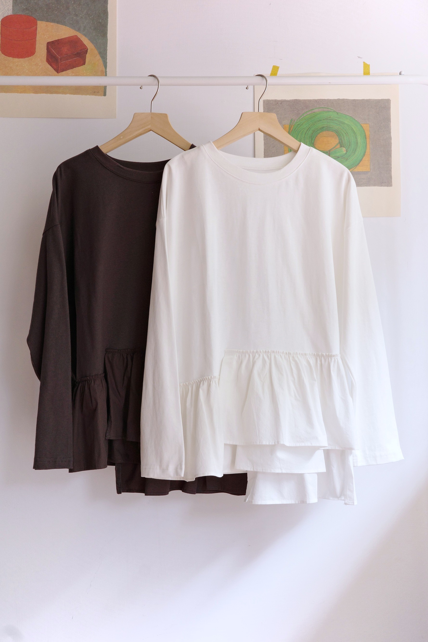 上半身是俐落好看的舒適棉T,下半部利用裁片抓皺,