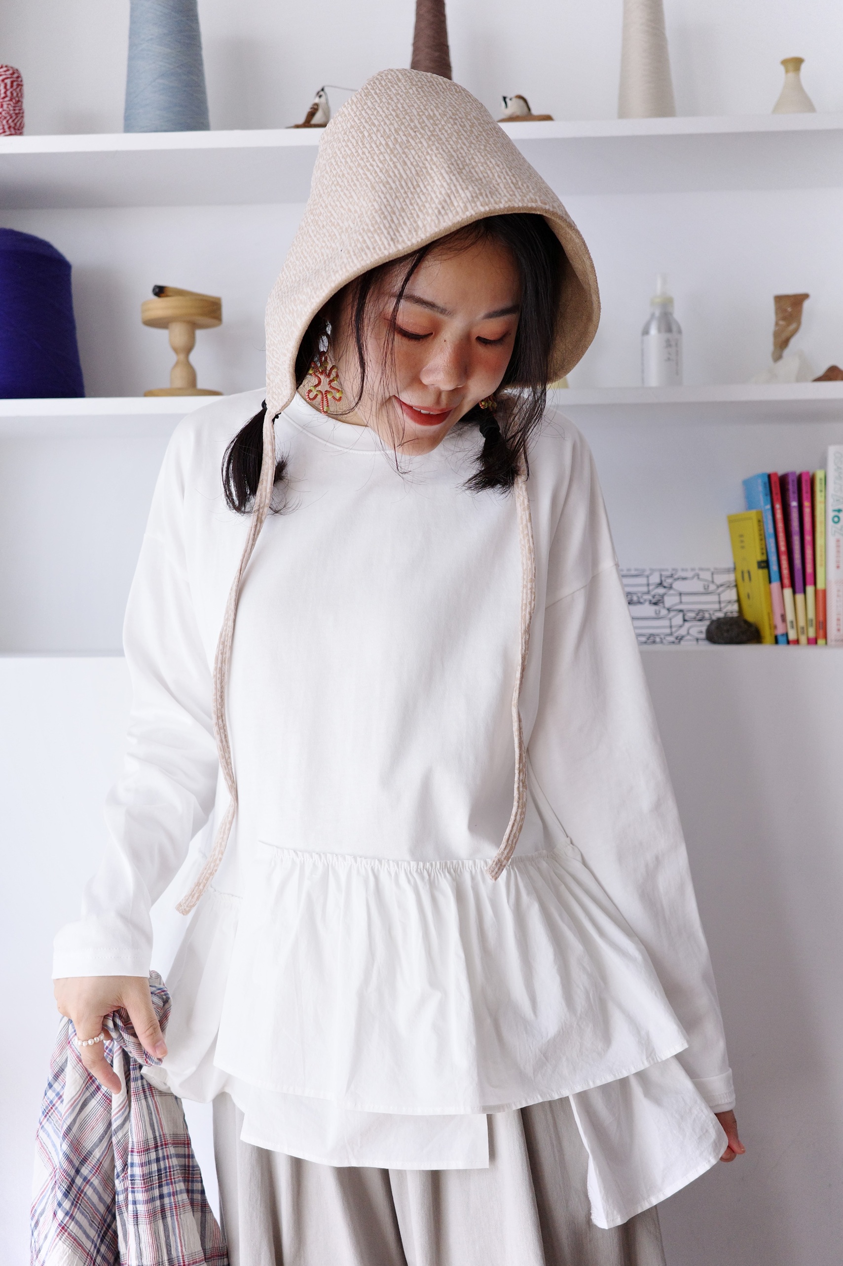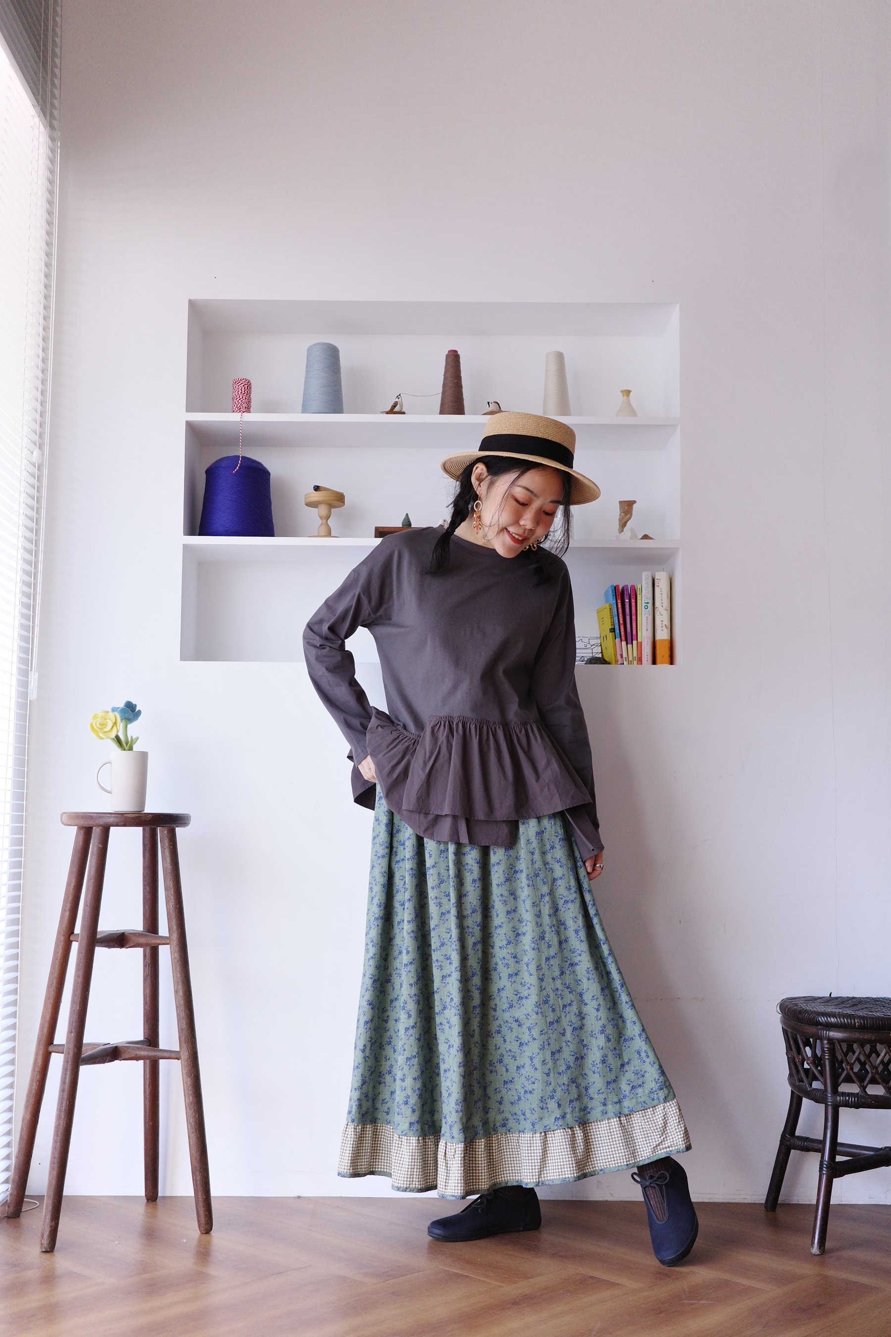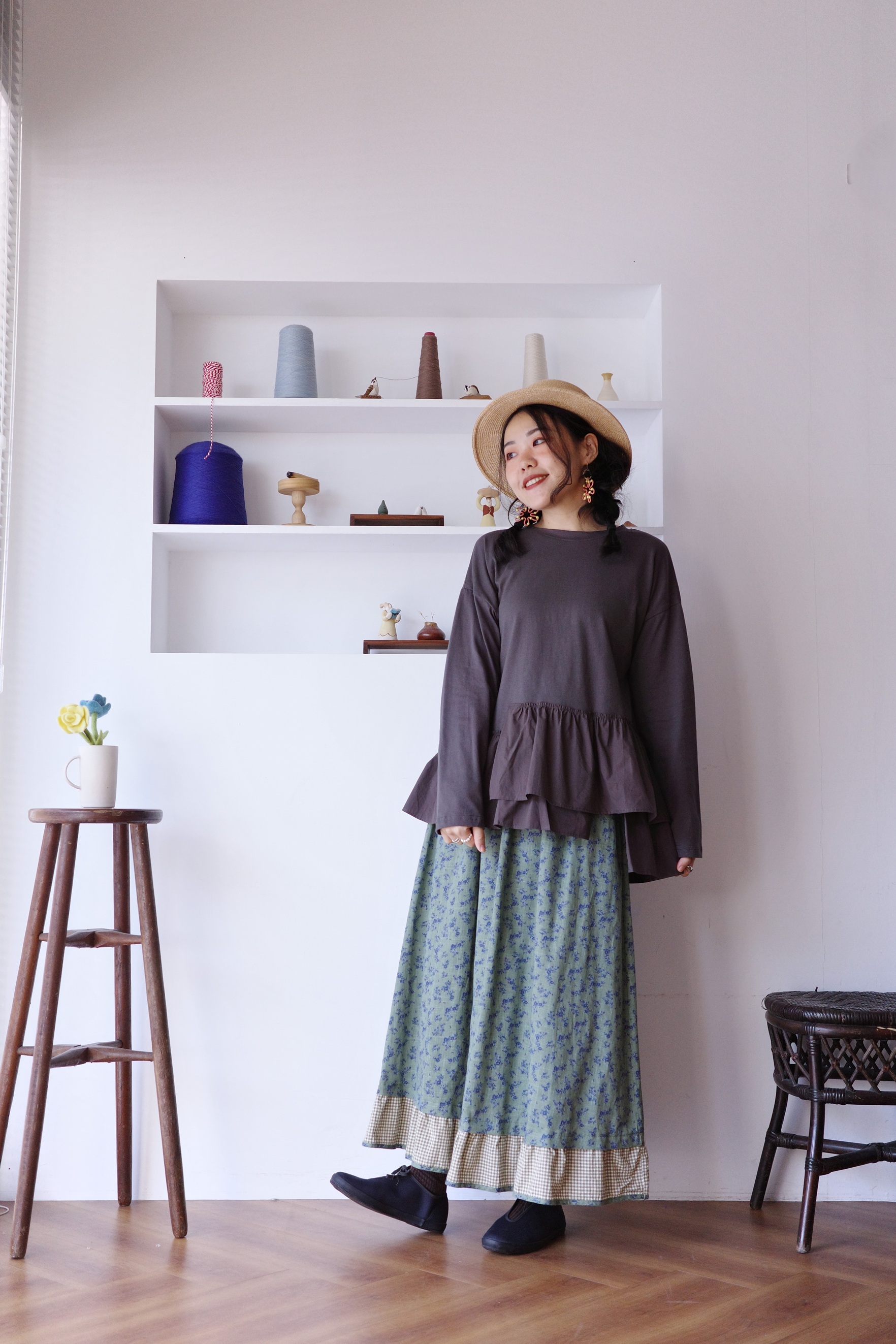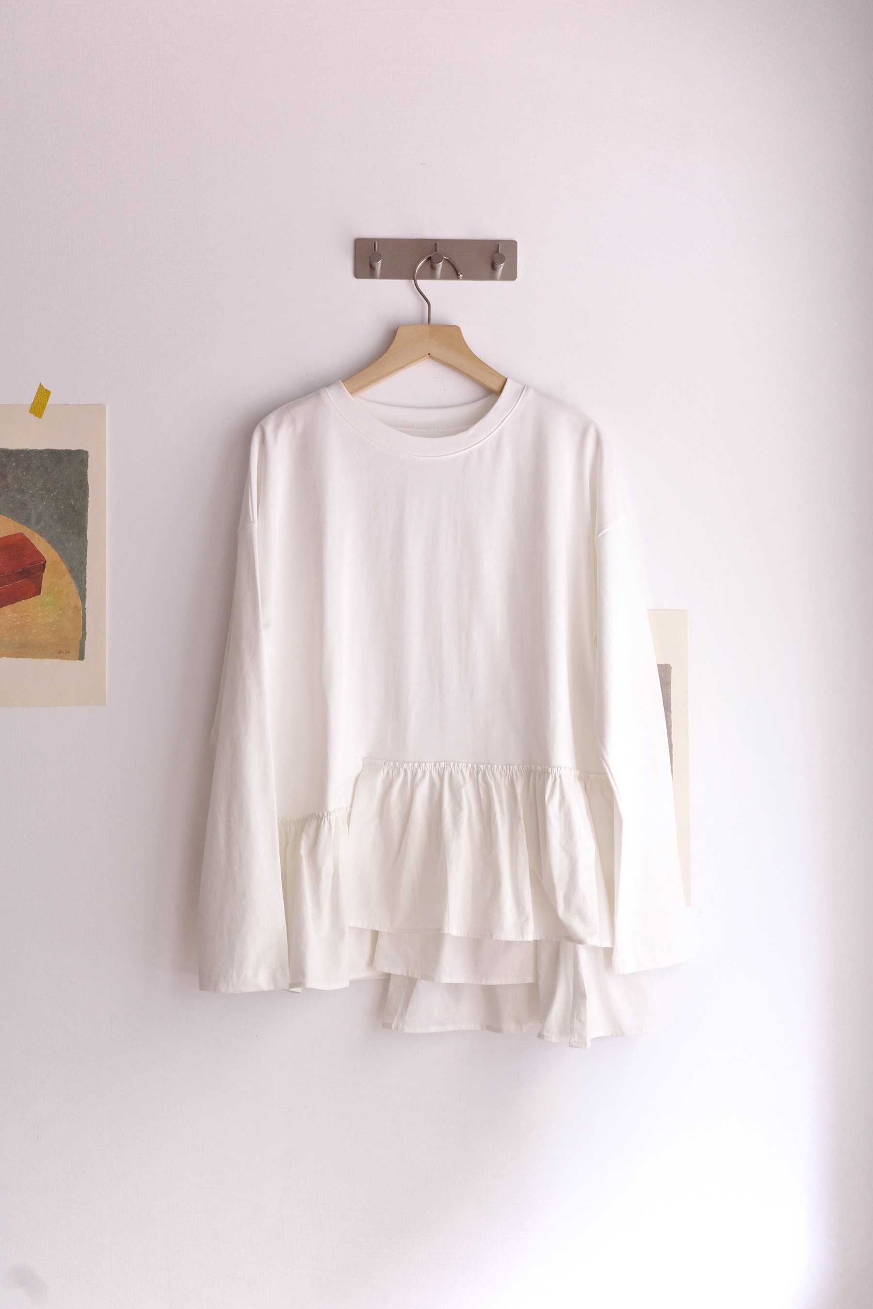 上半身是俐落好看的舒適棉T,下半部利用裁片抓皺,