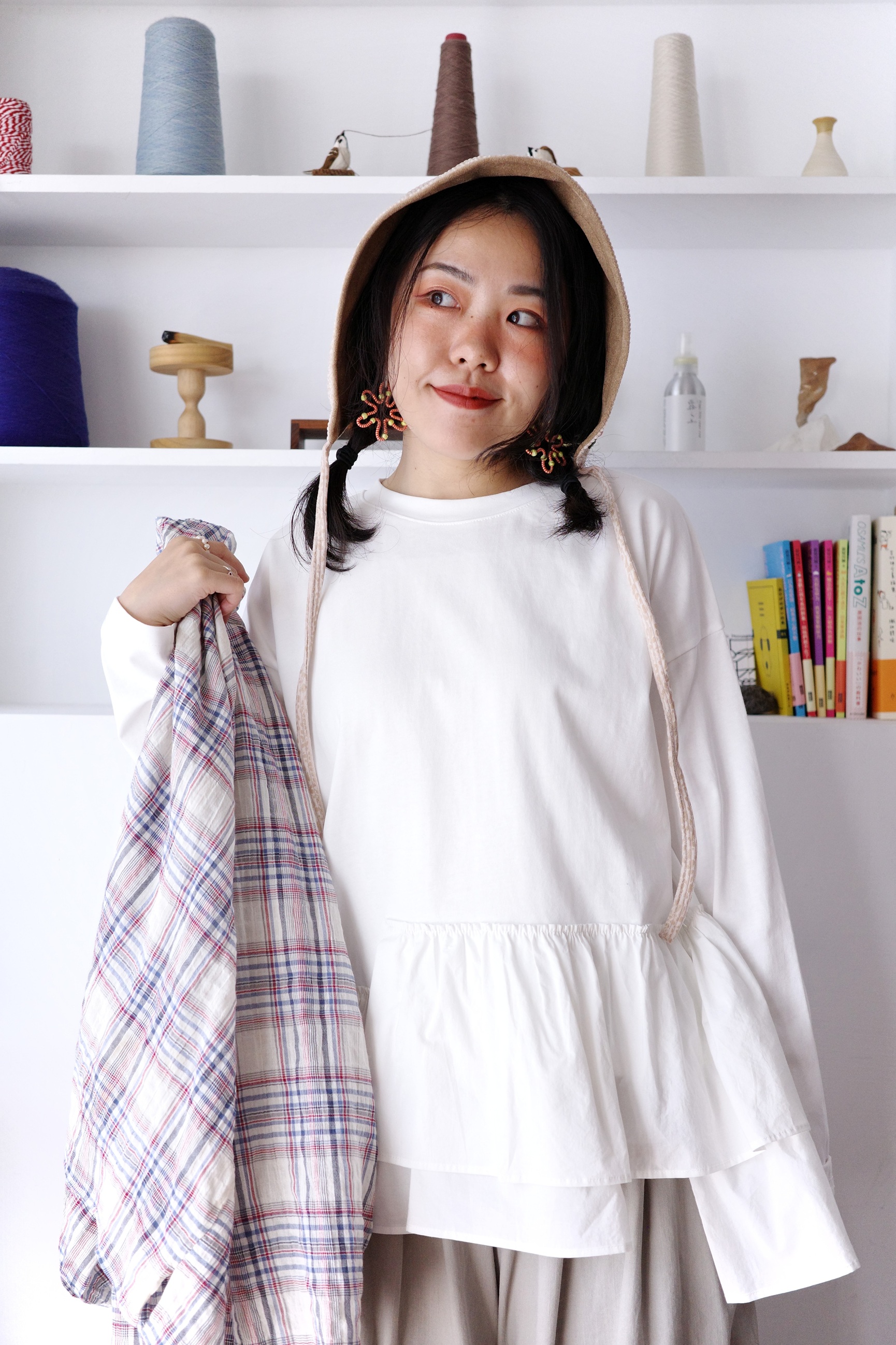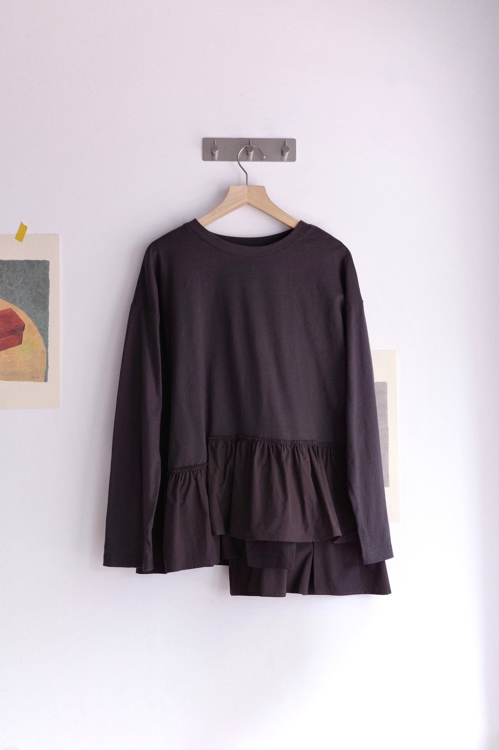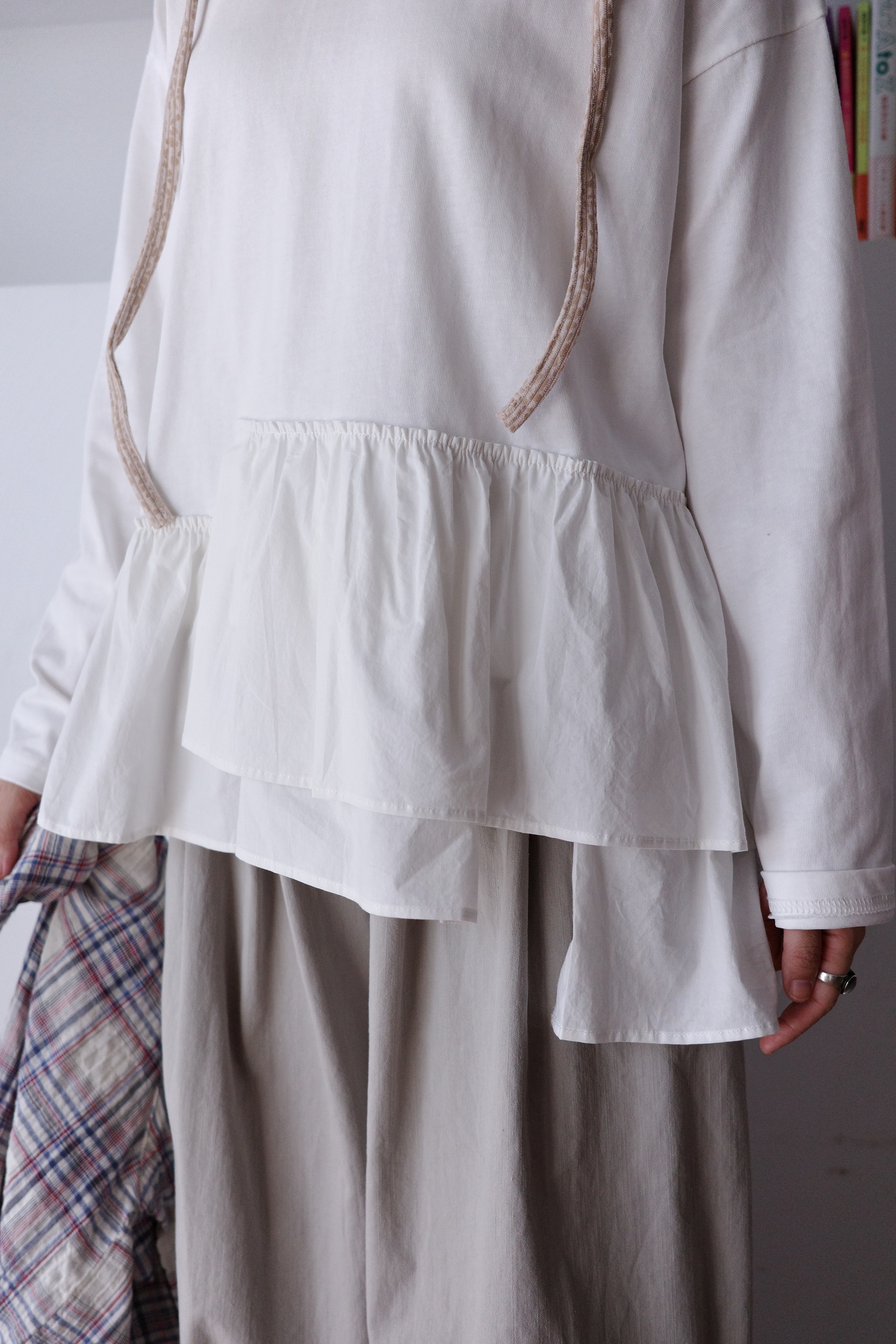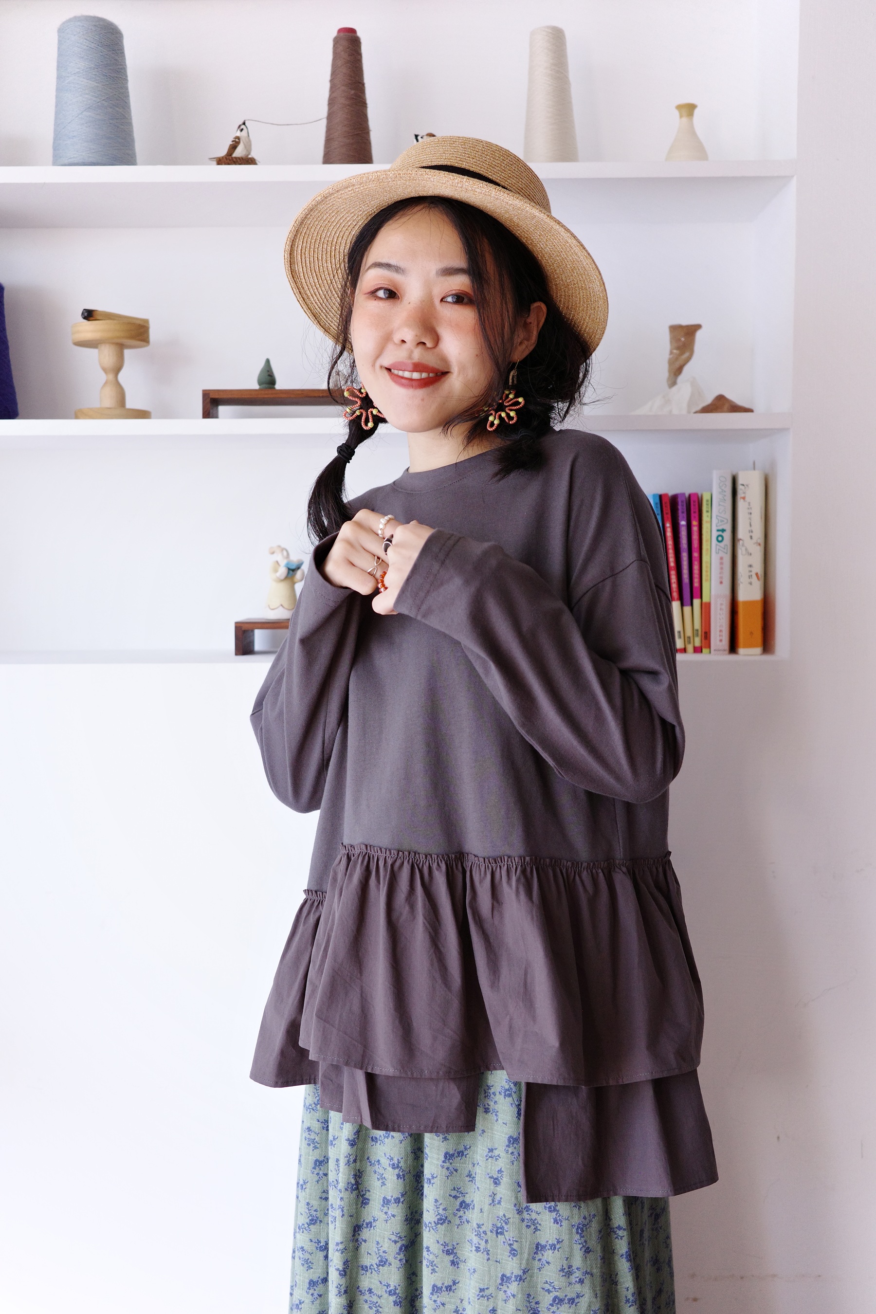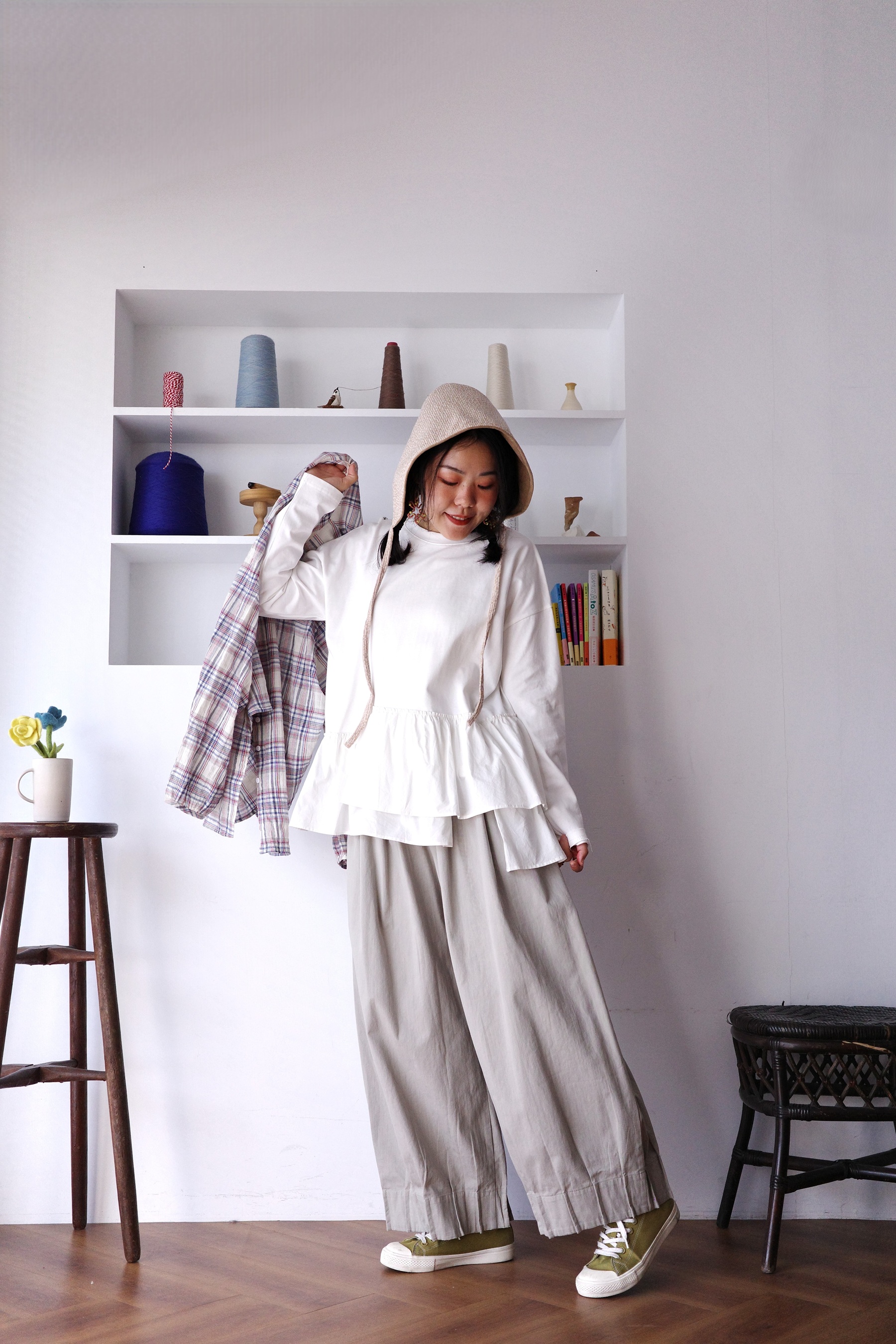 上半身是俐落好看的舒適棉T,下半部利用裁片抓皺,