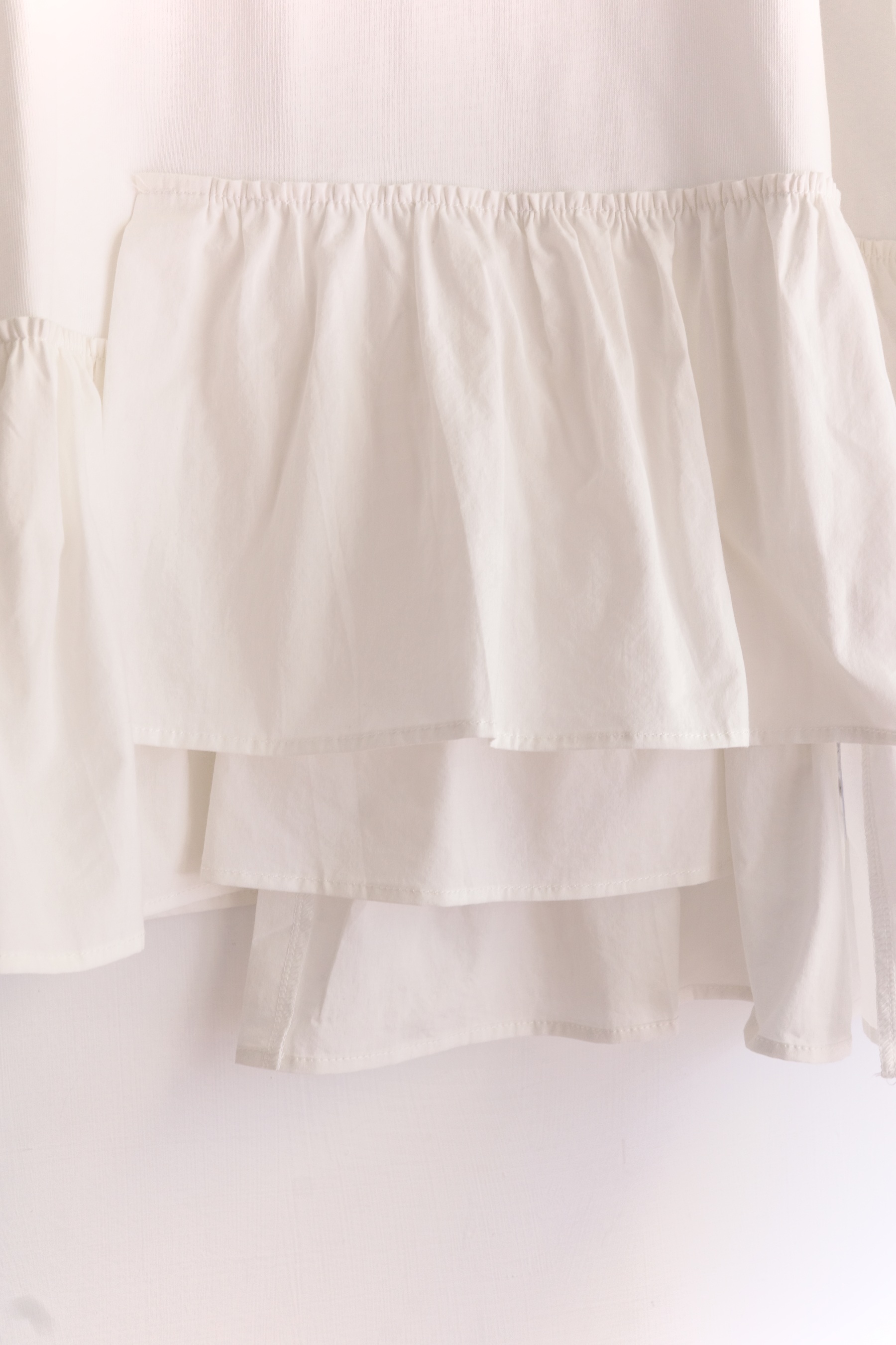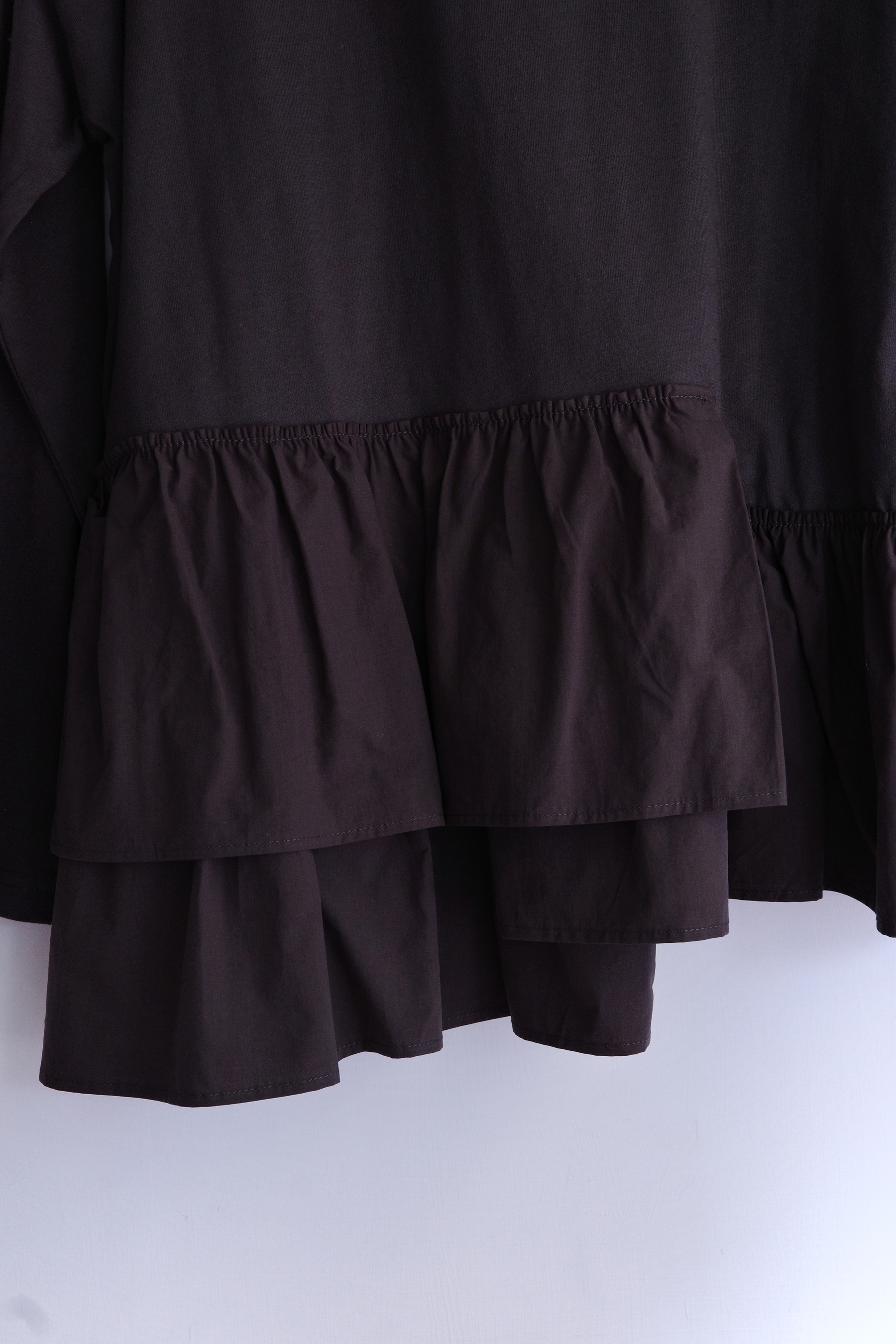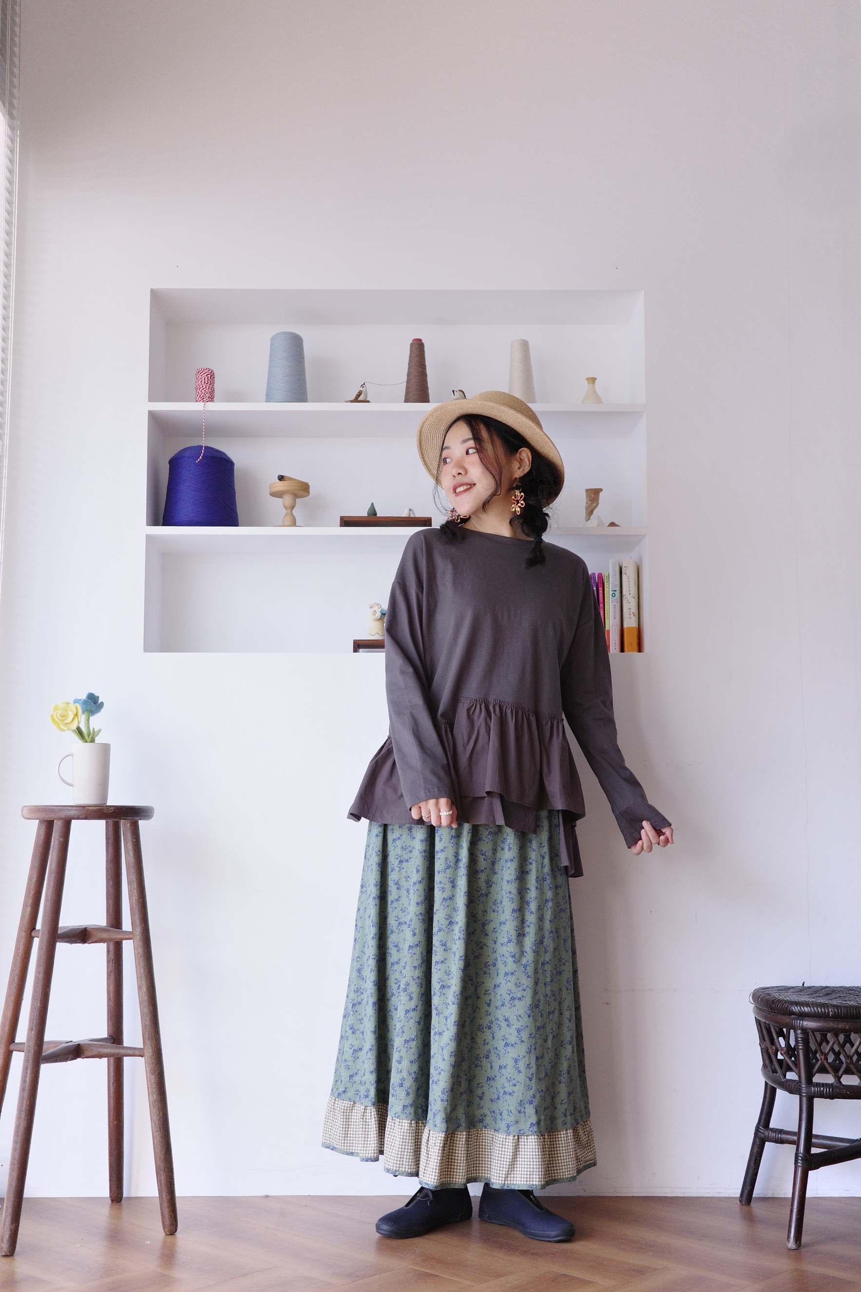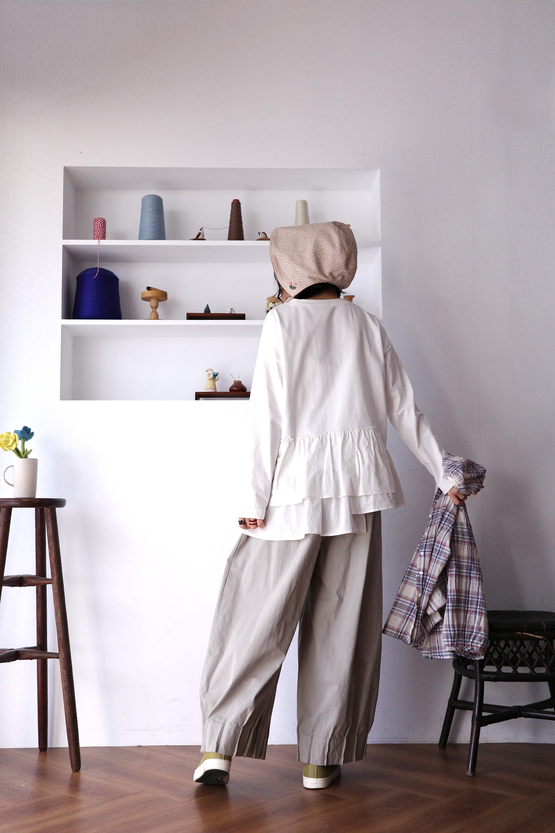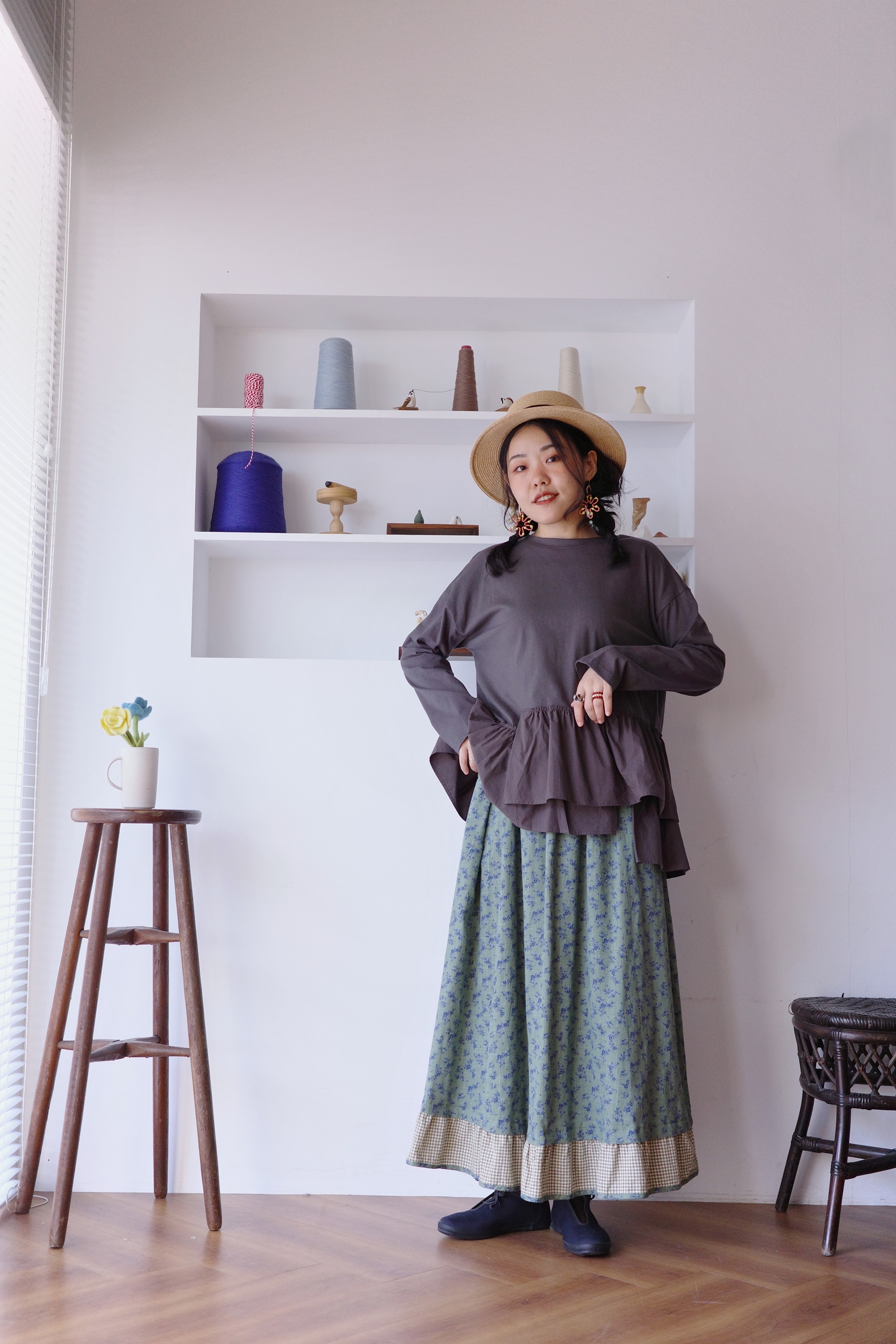 上半身是俐落好看的舒適棉T,下半部利用裁片抓皺,
