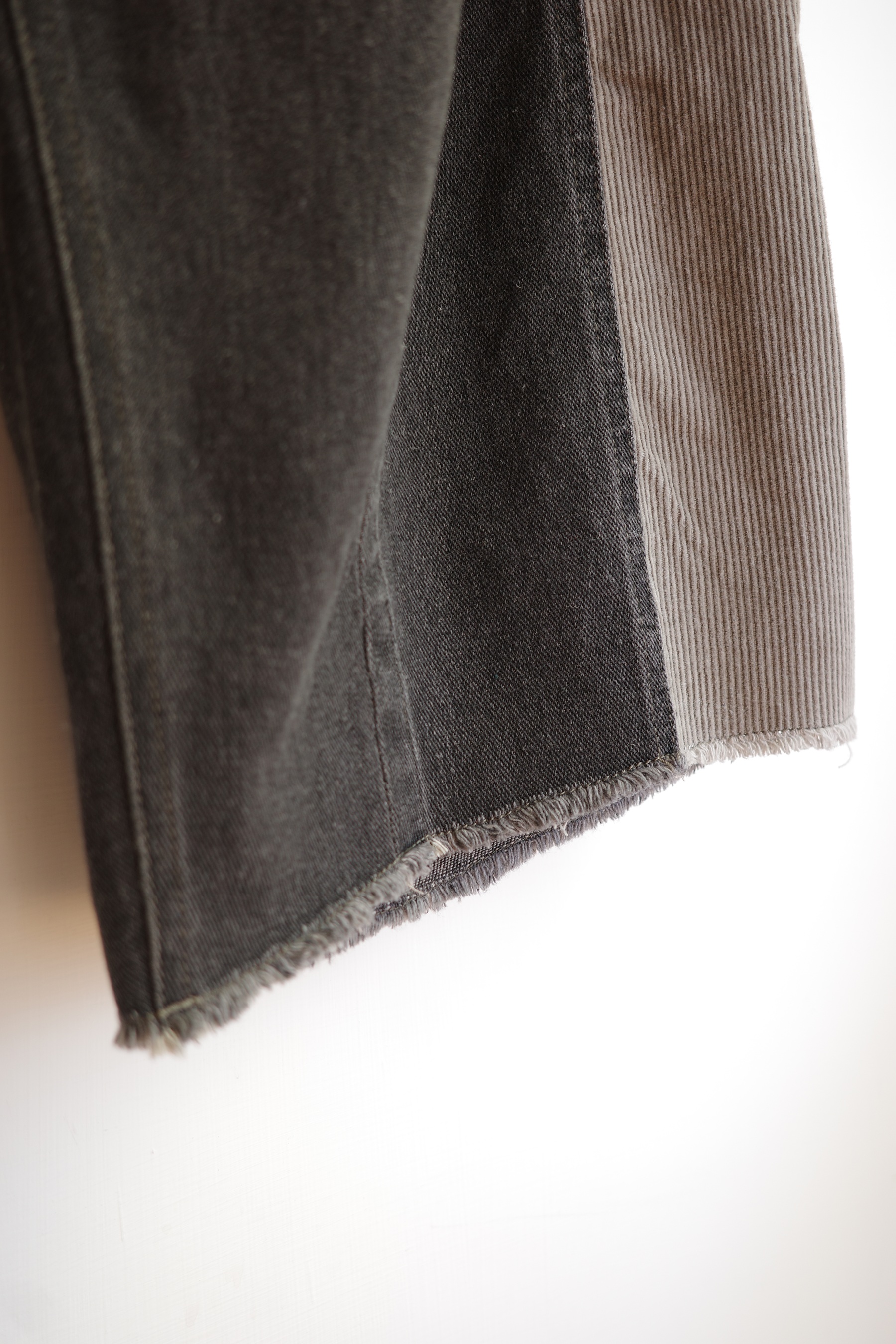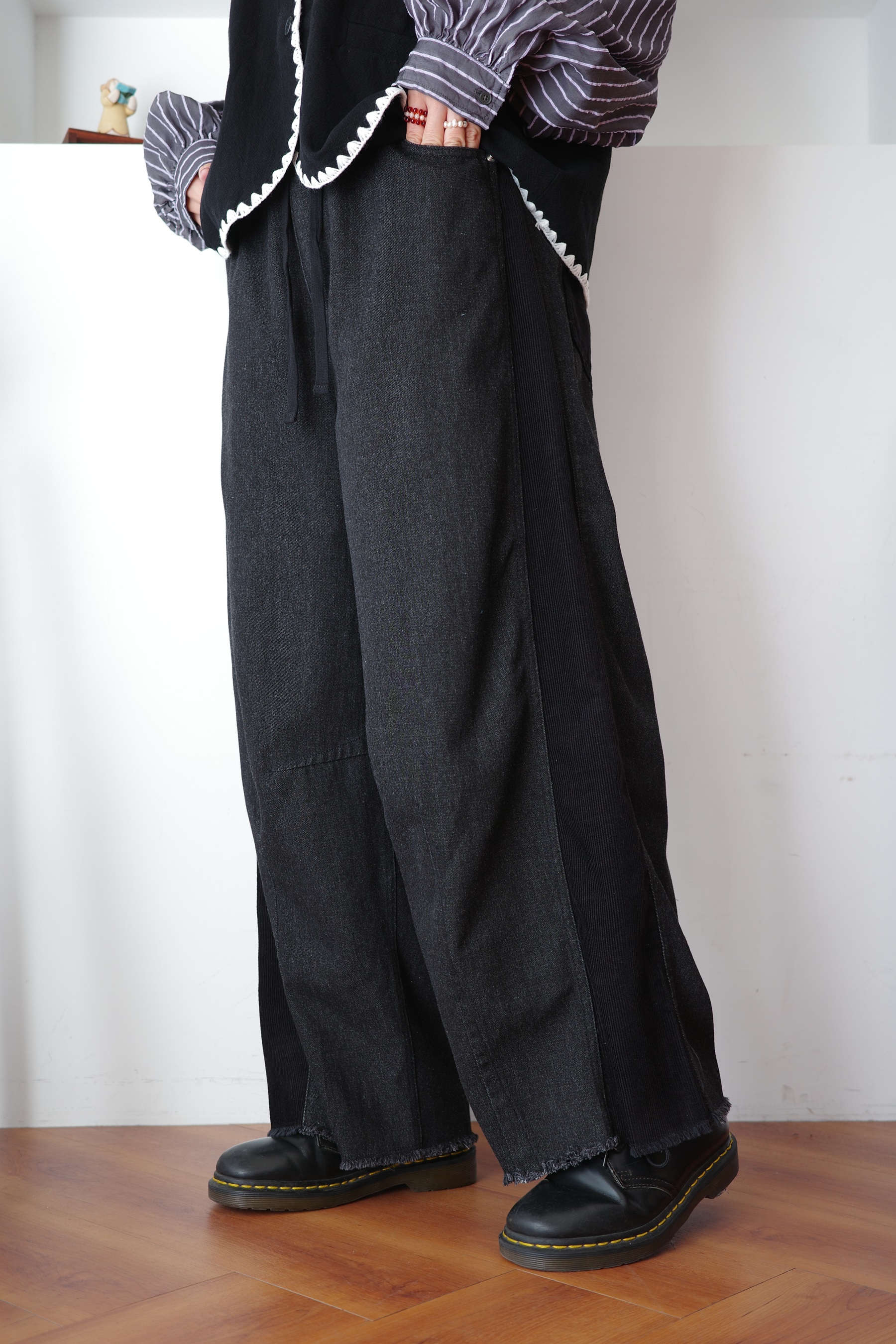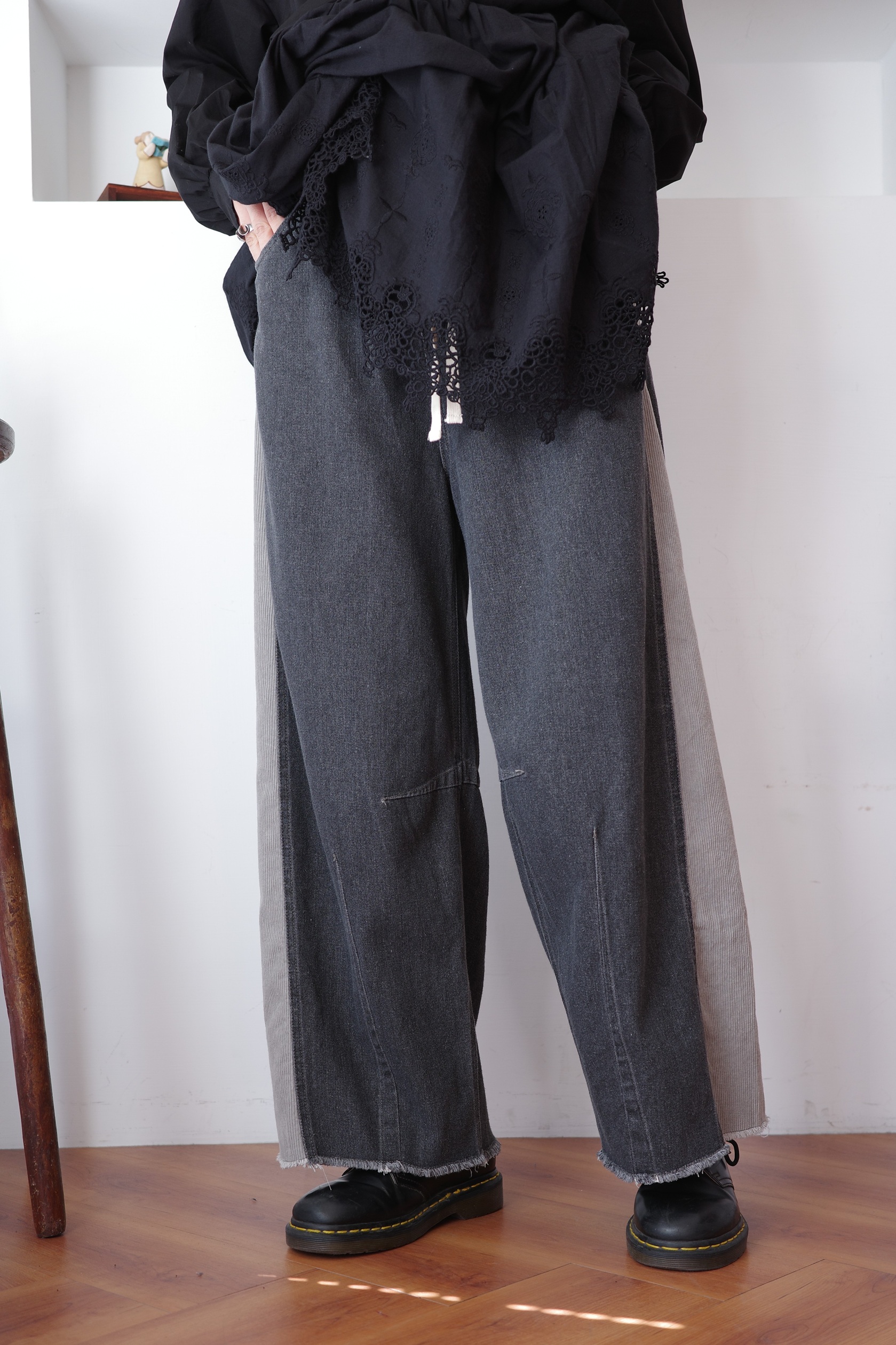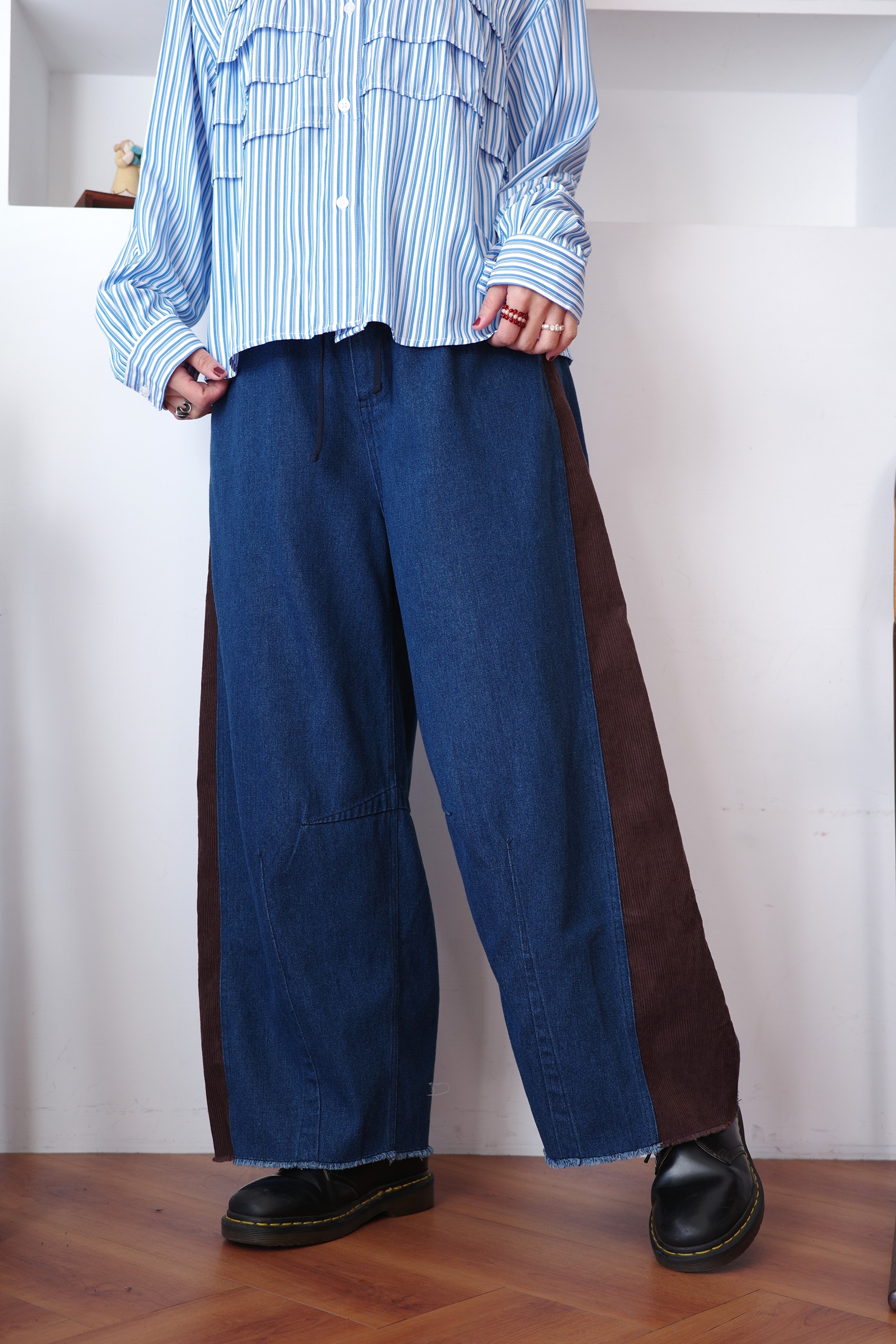 𓏭超修身細絨拼接抽鬚高腰丹寧褲