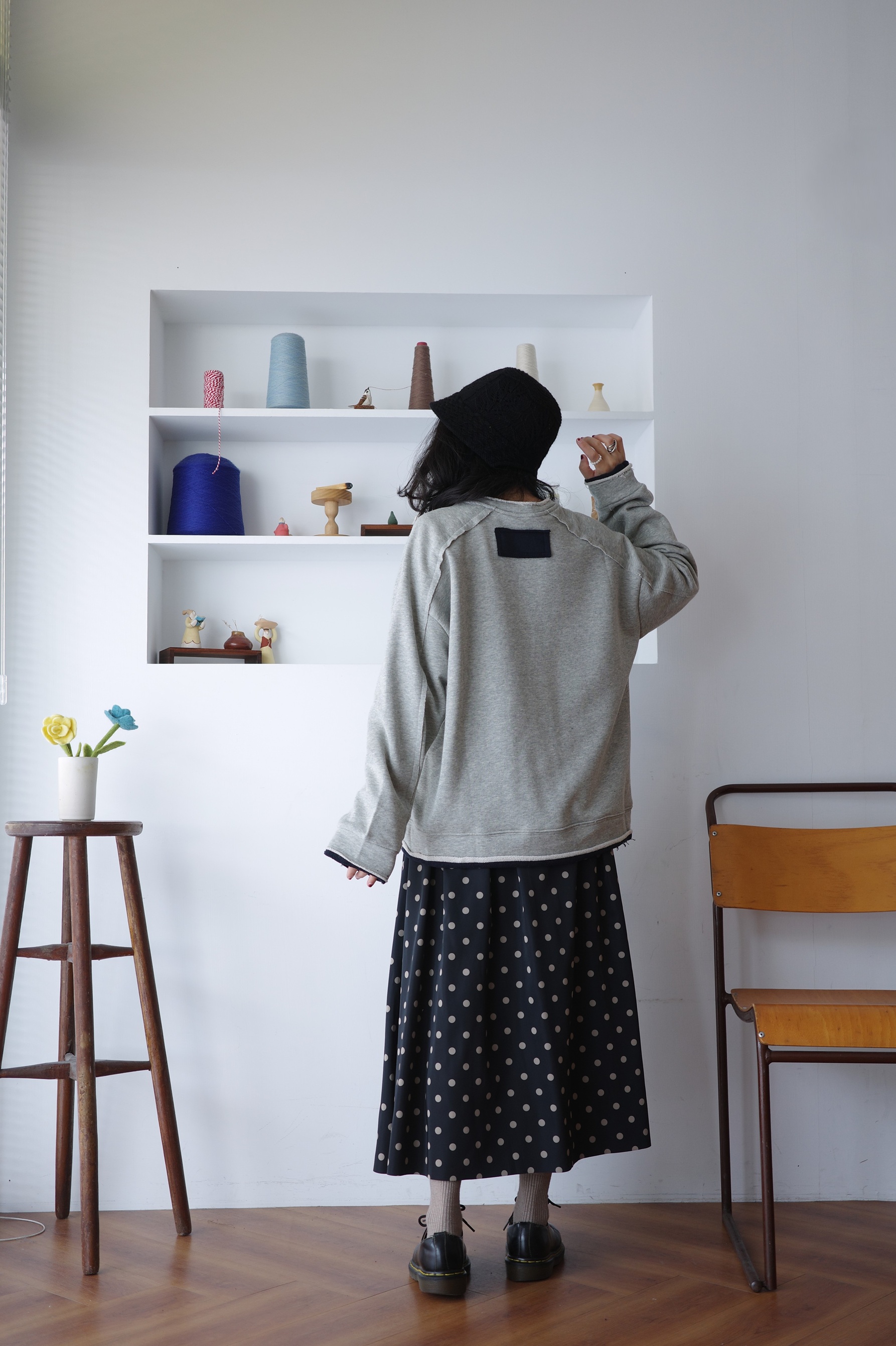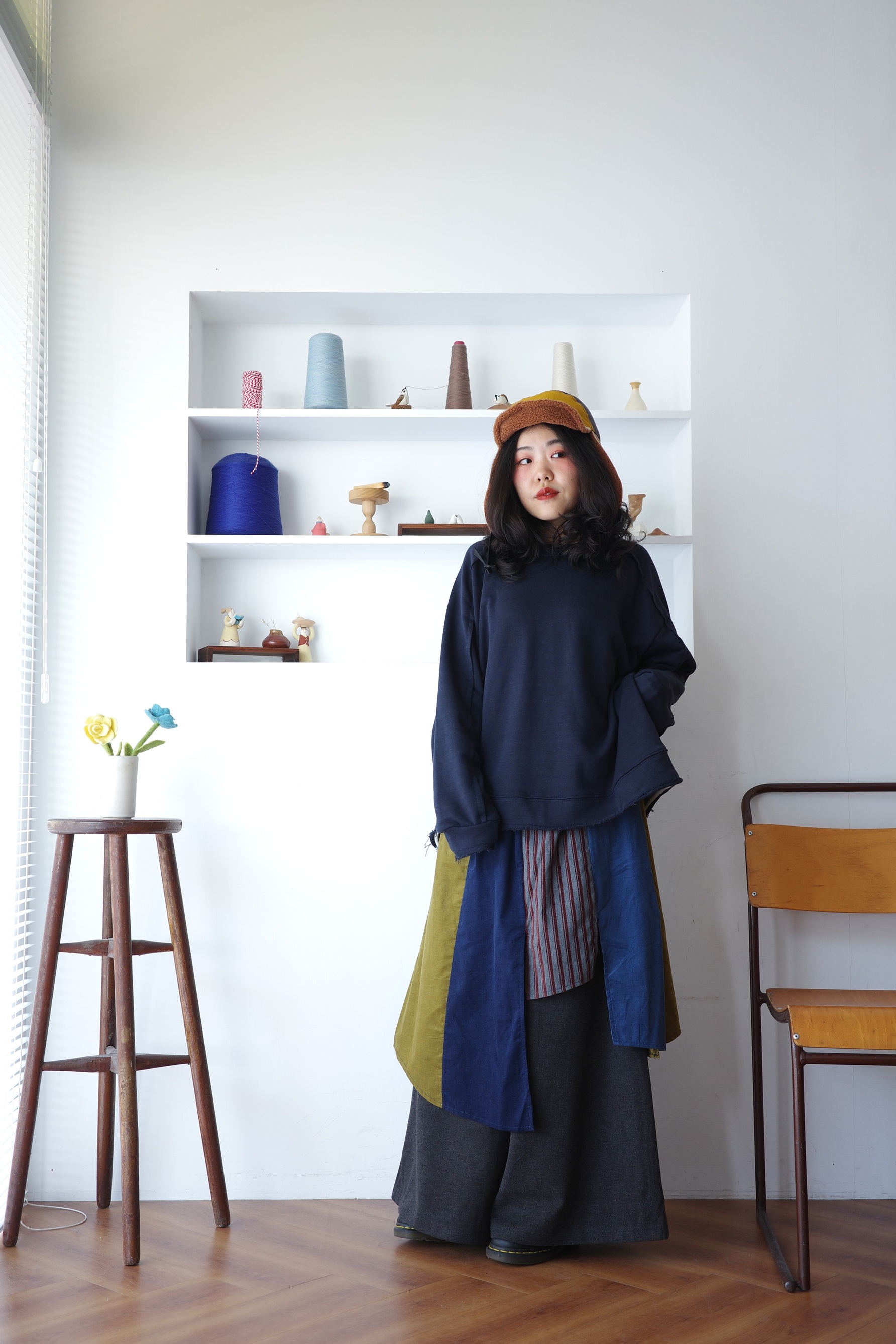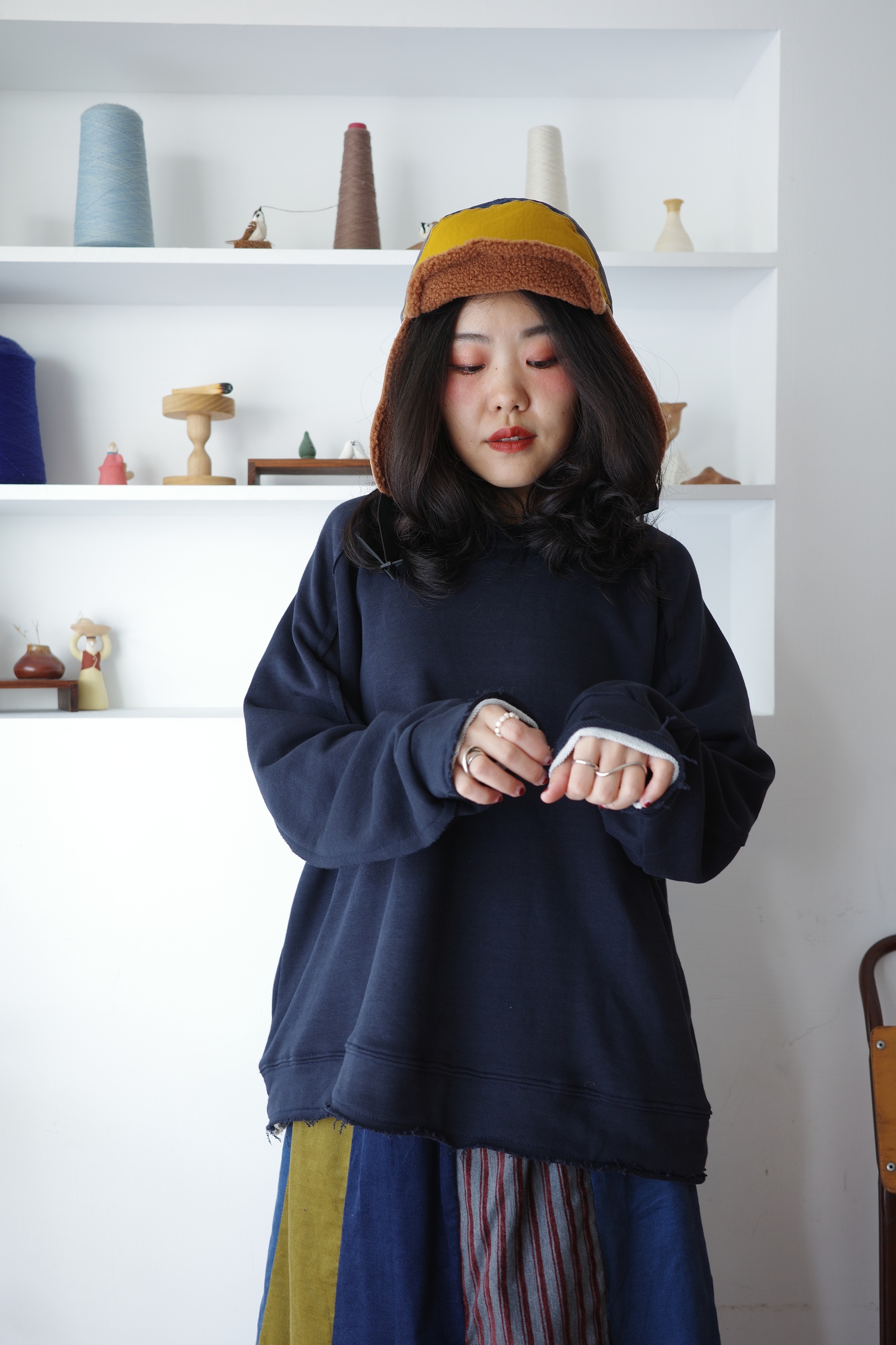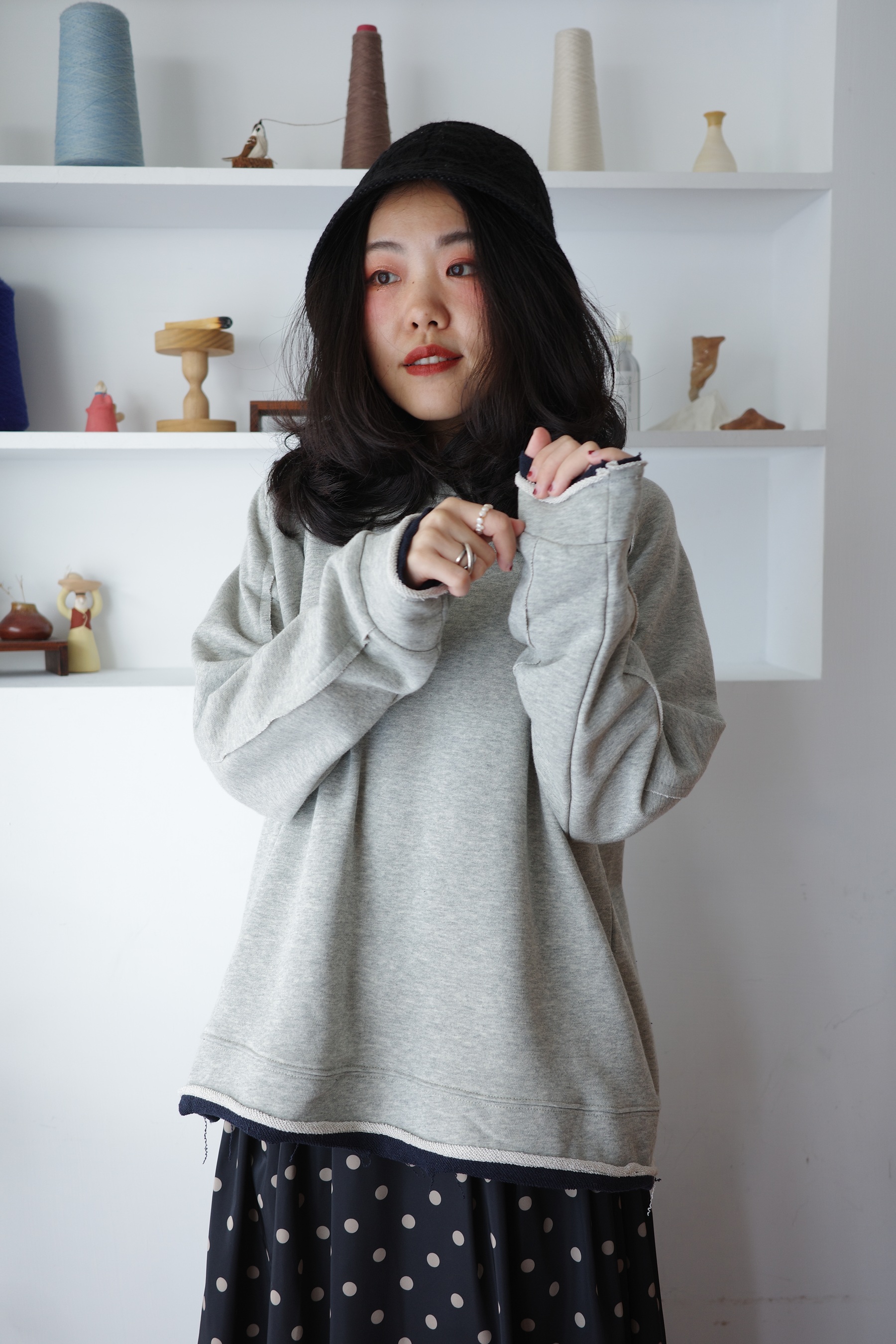 簡約的素面大學T,利用領口、袖口及下擺跳色雙層捲邊點綴,