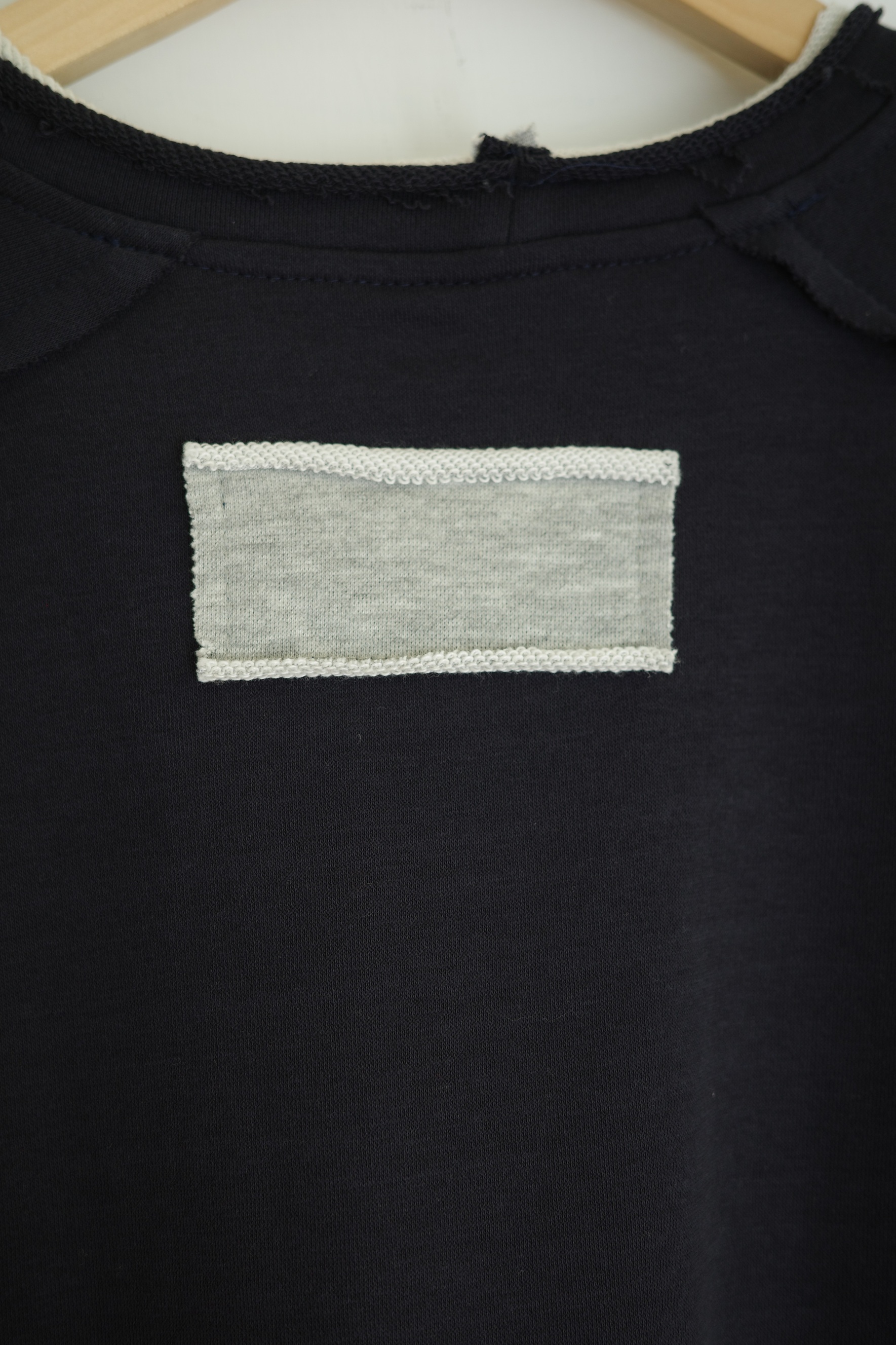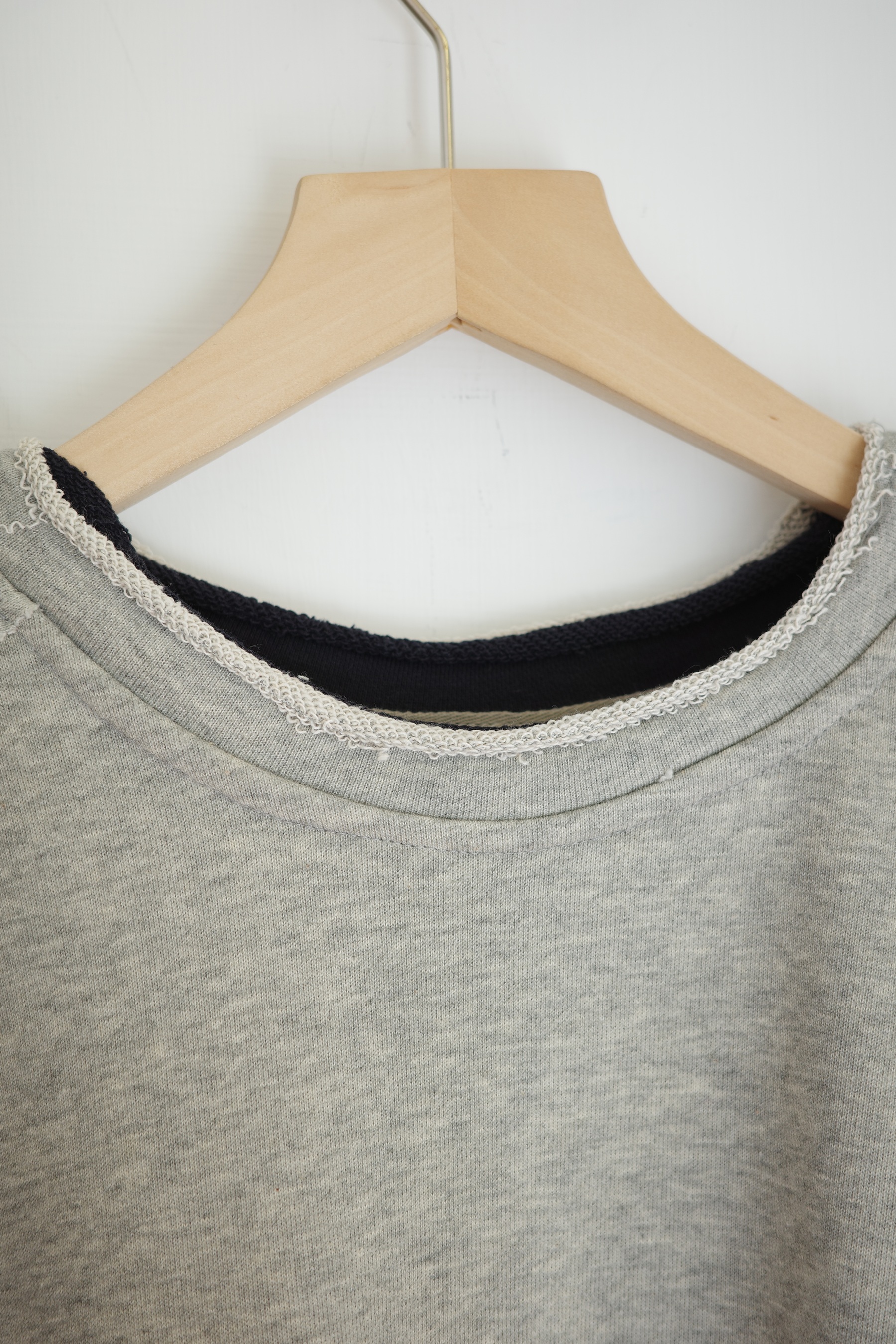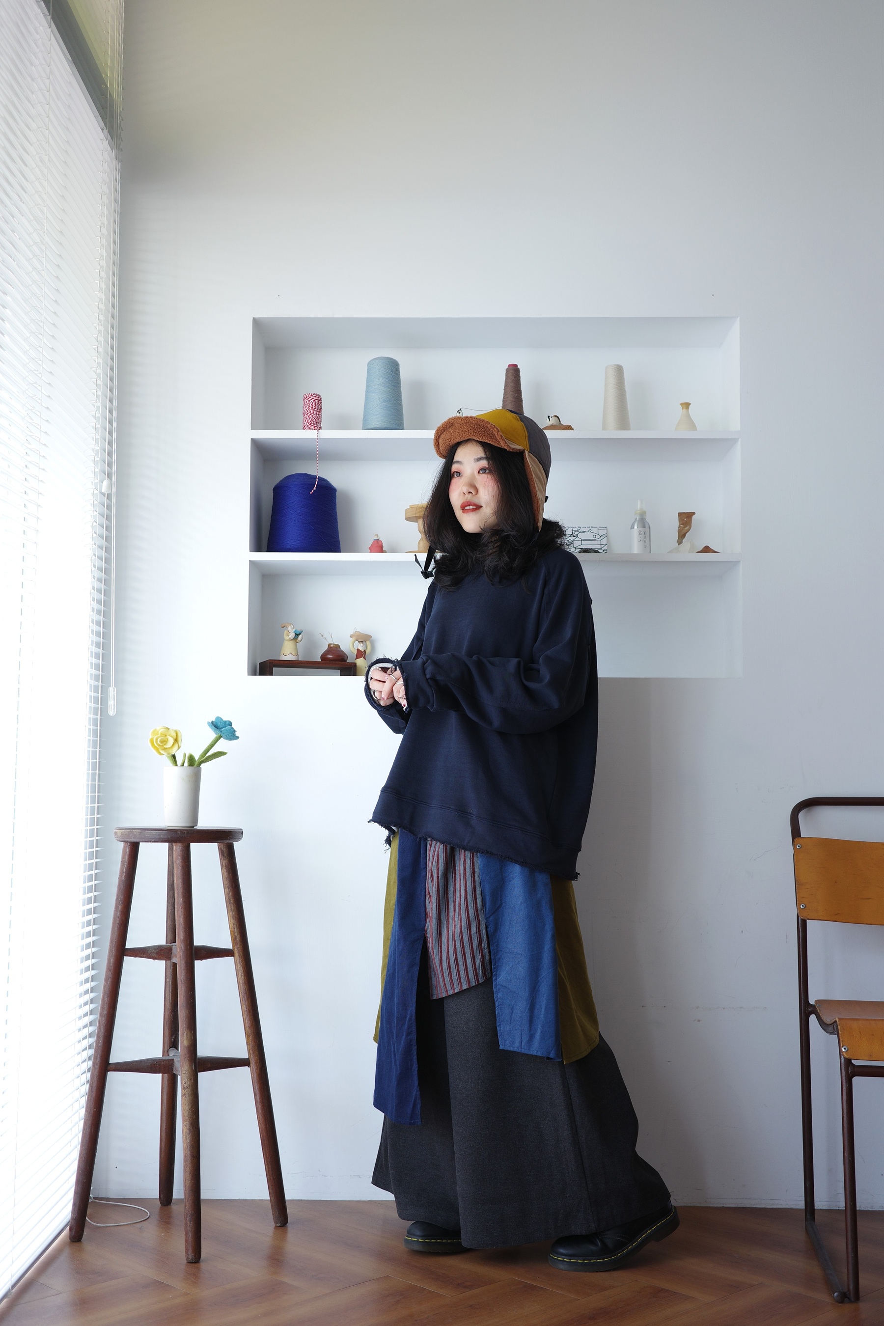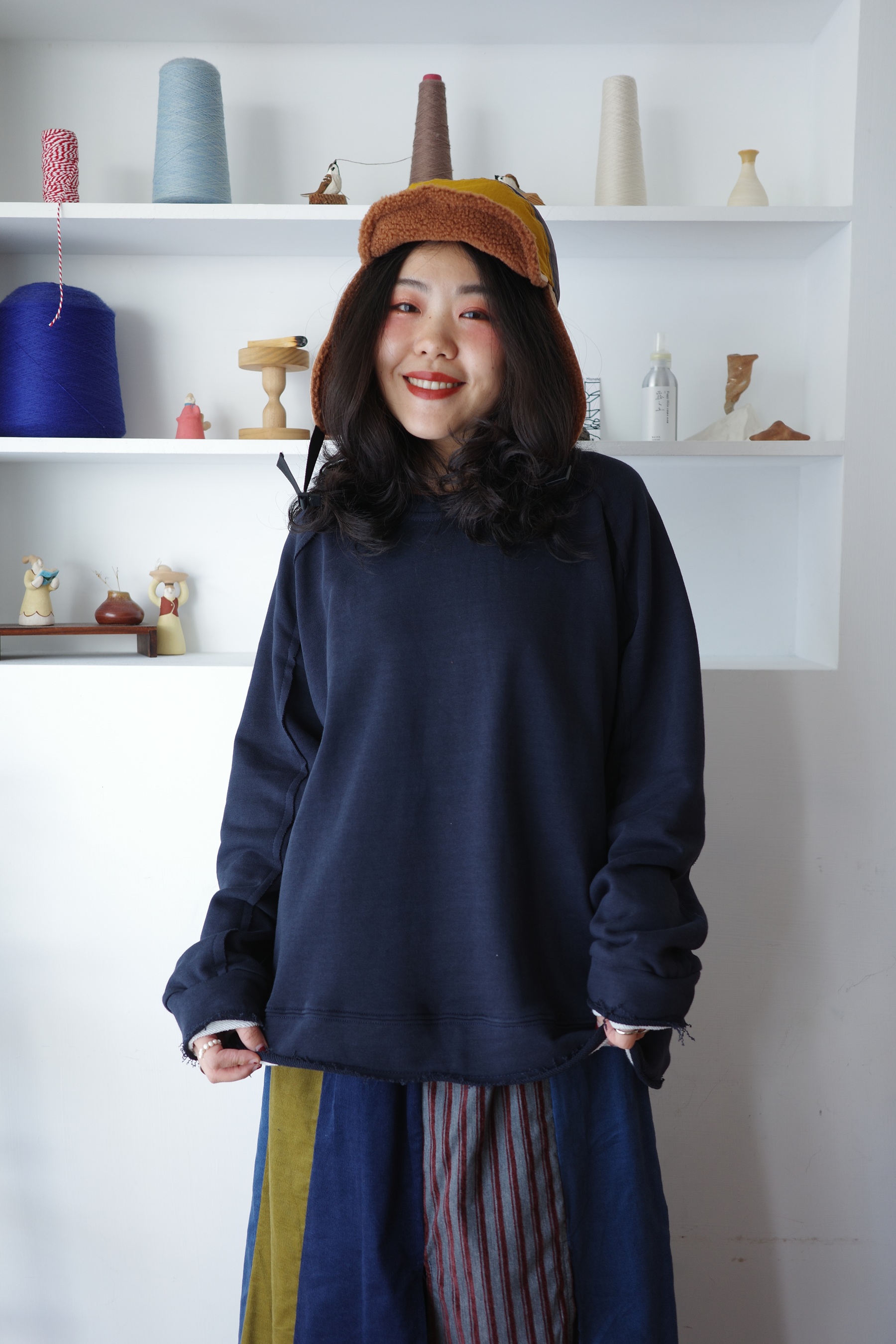簡約的素面大學T,利用領口、袖口及下擺跳色雙層捲邊點綴,