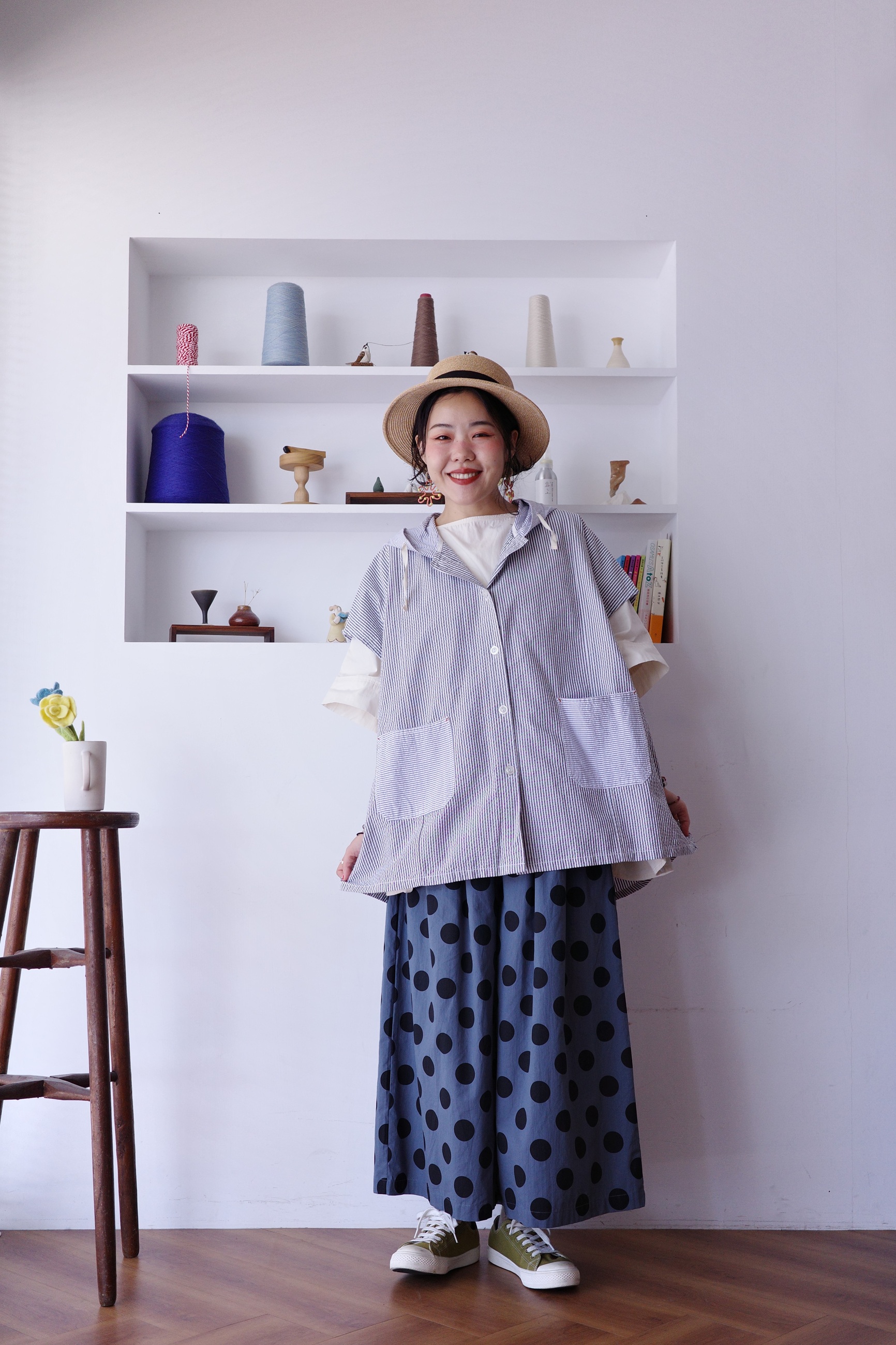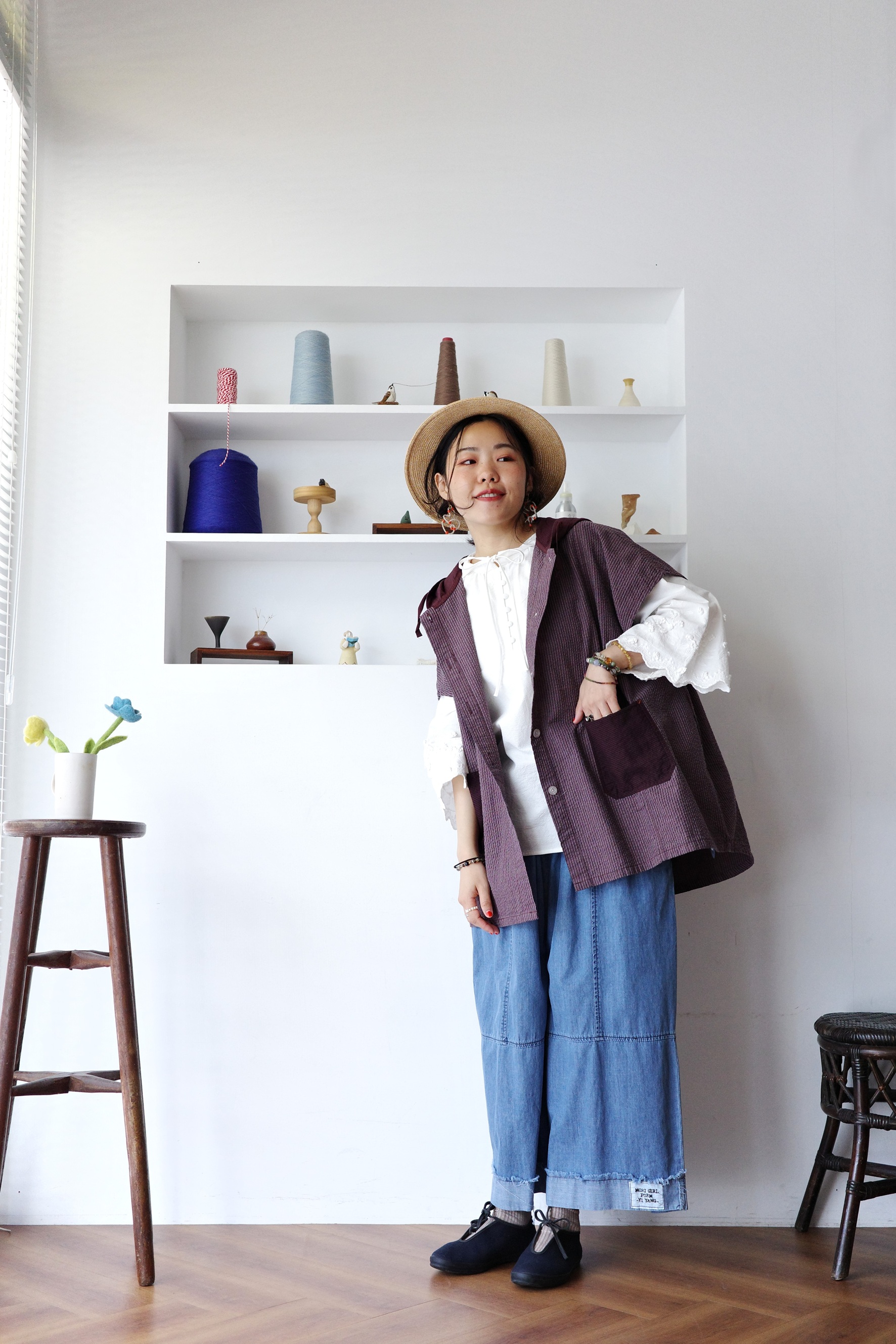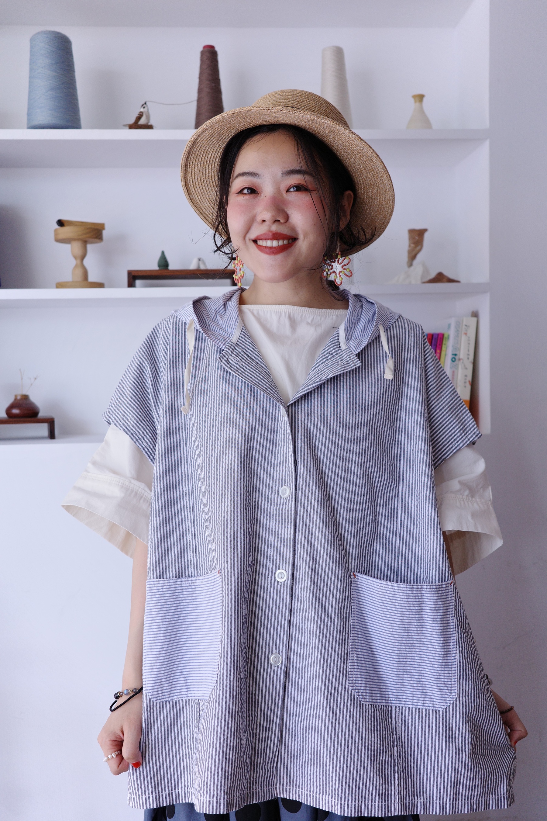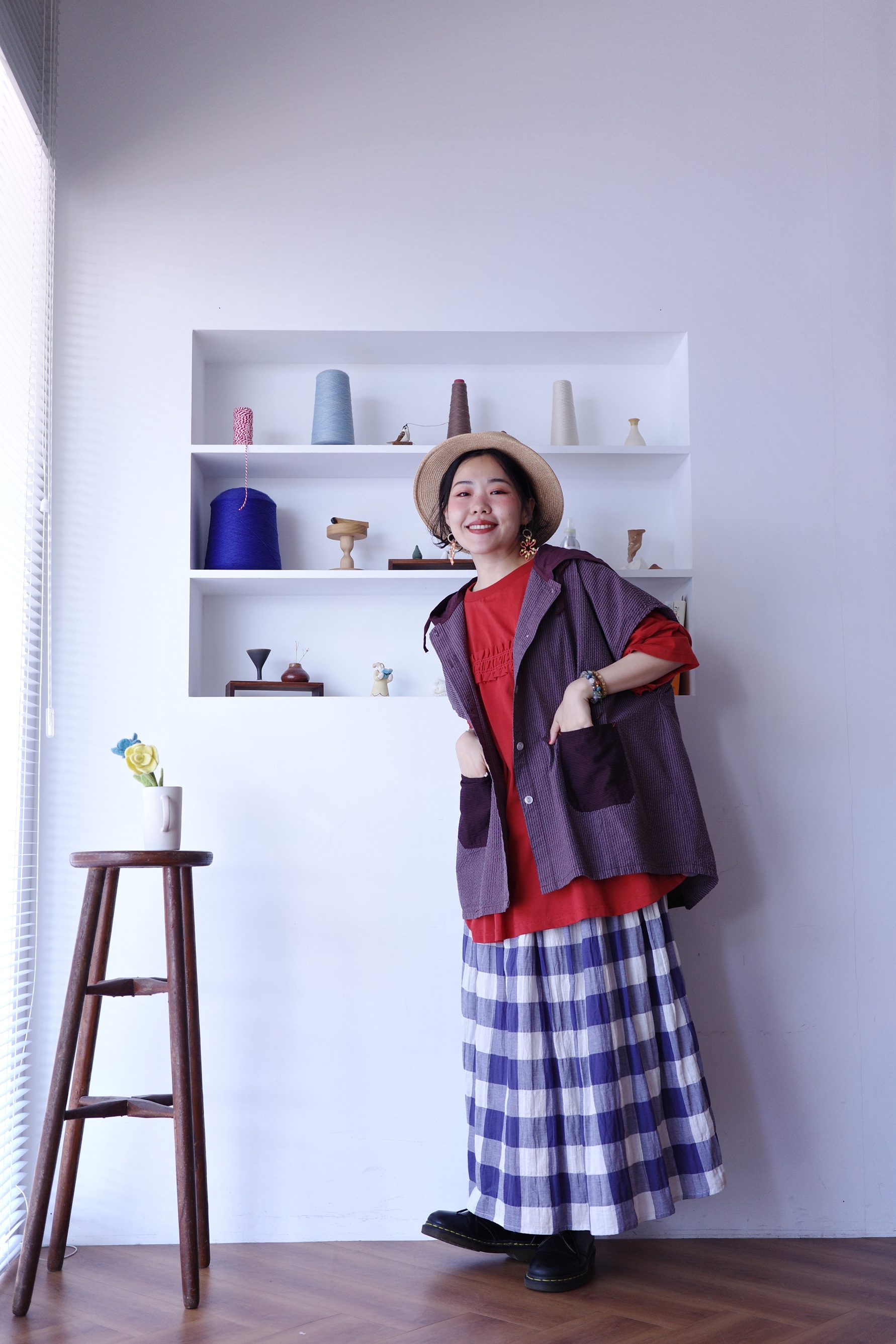 舒適有挺度的布料,利用各種直紋布拼接堆疊層次。