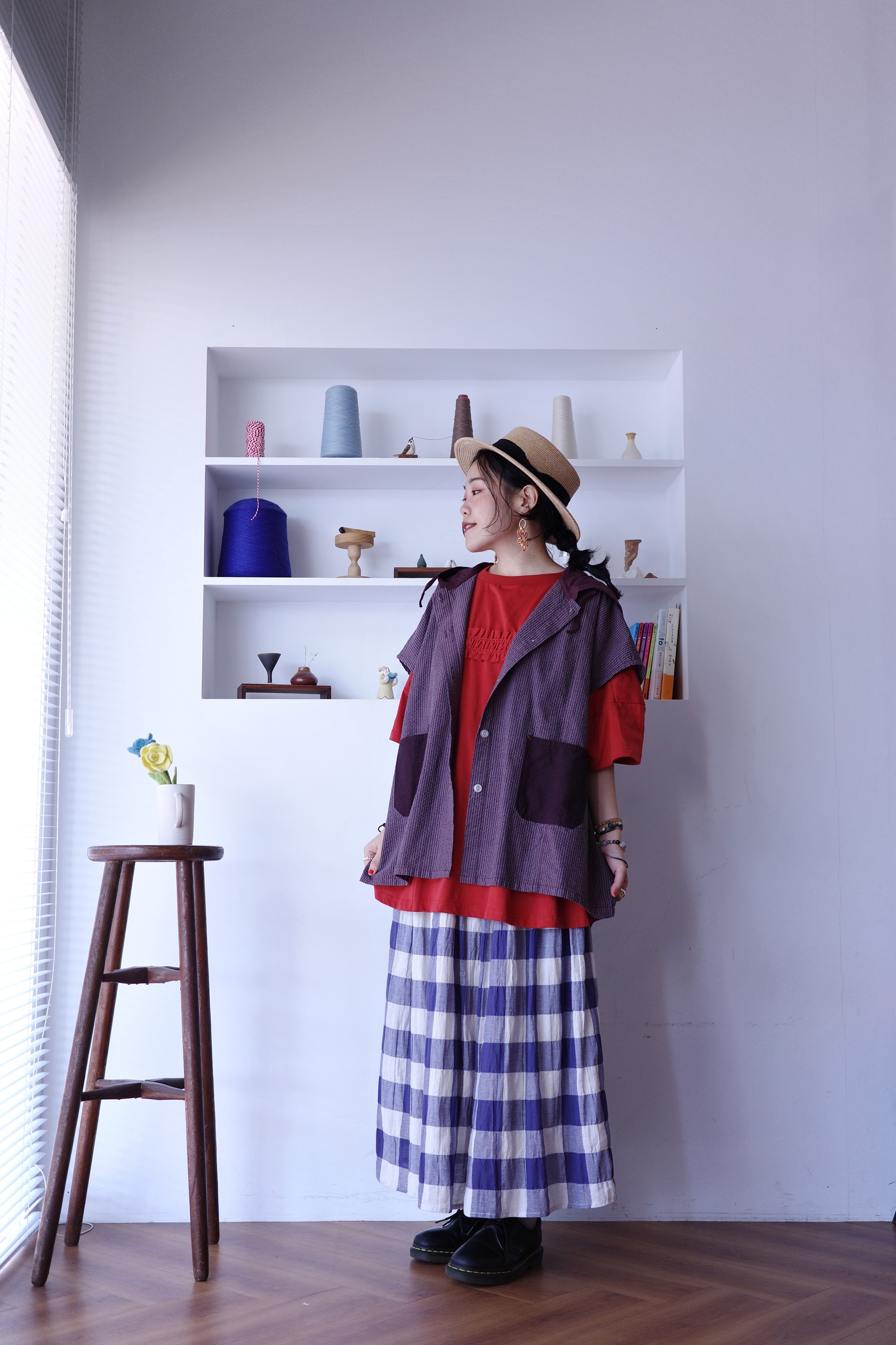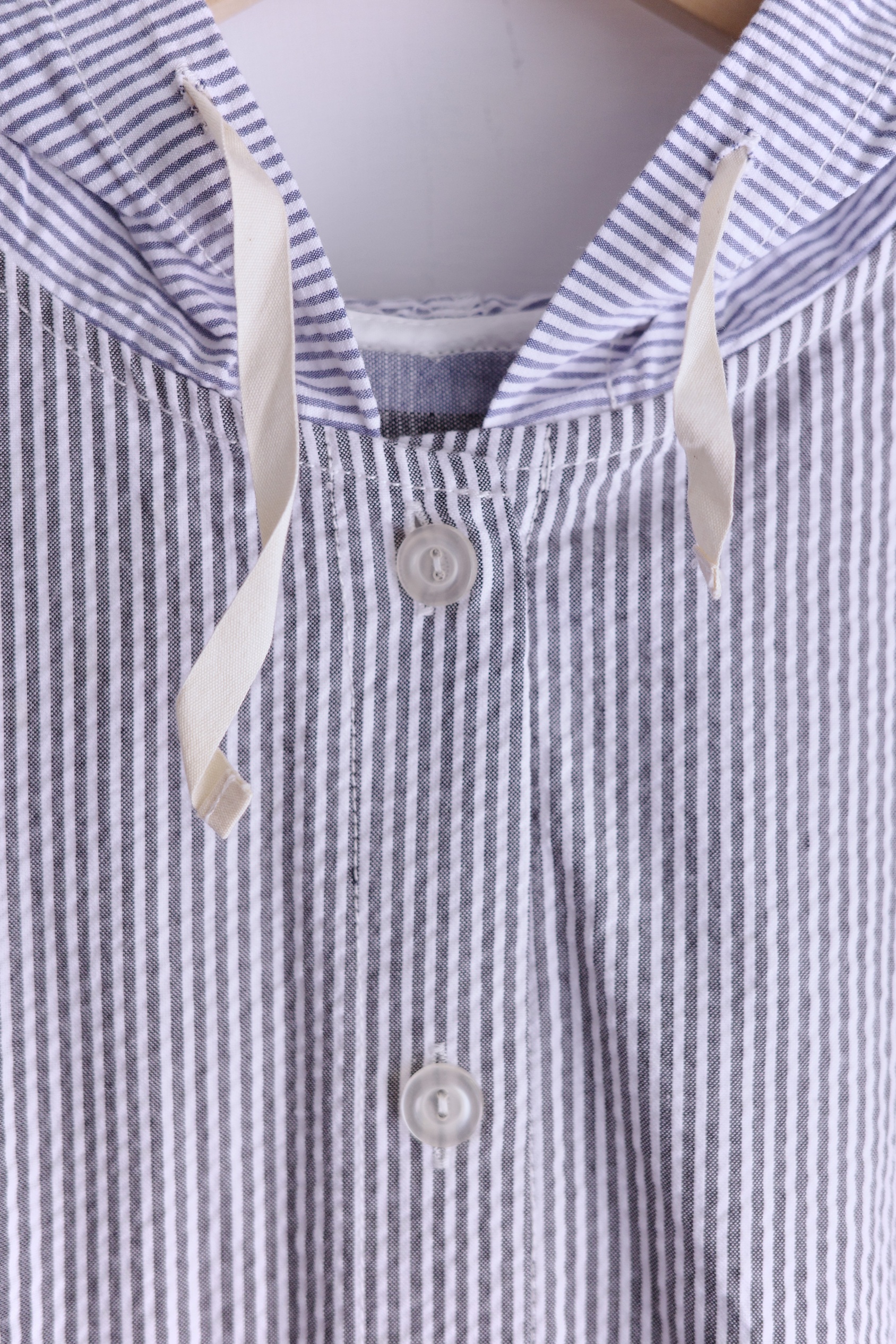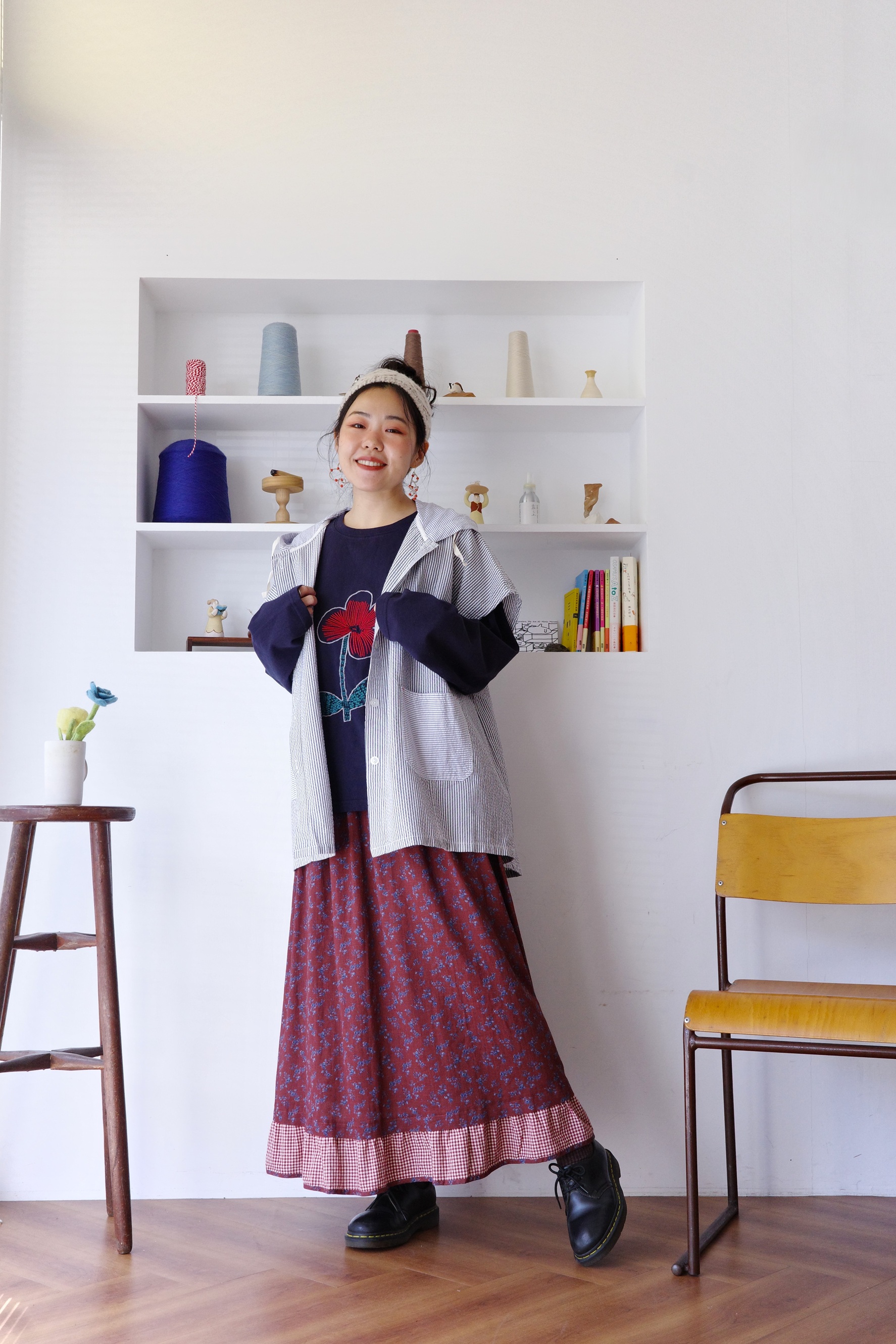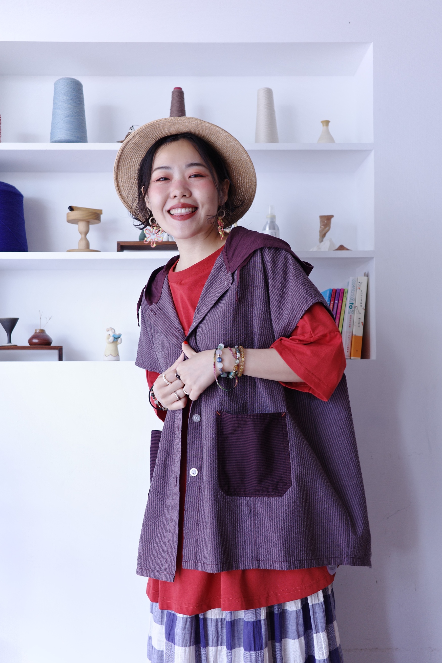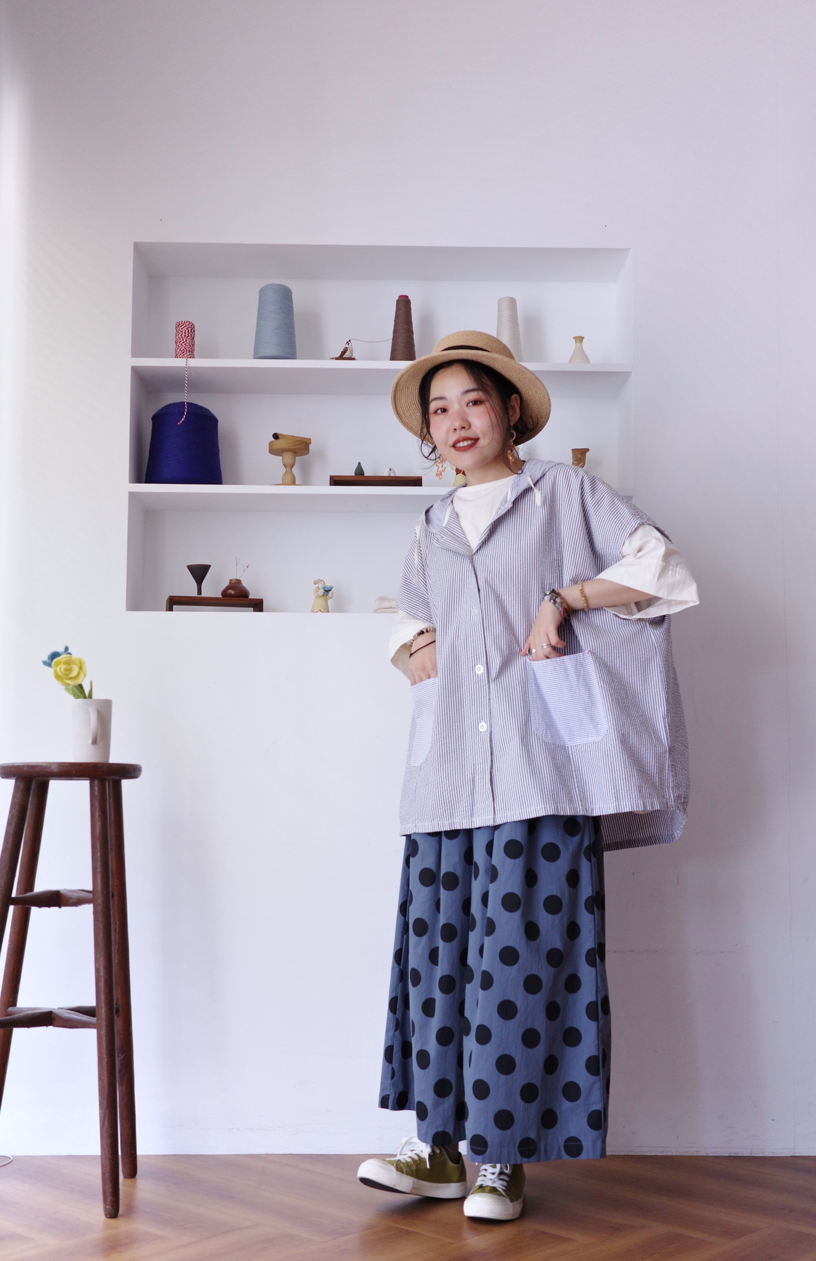 舒適有挺度的布料,利用各種直紋布拼接堆疊層次。