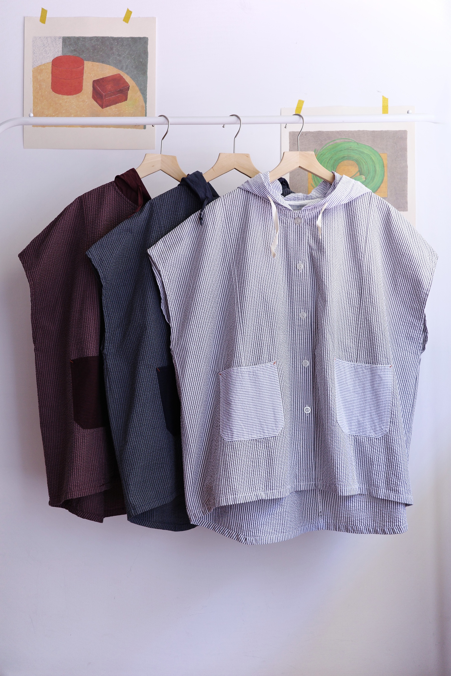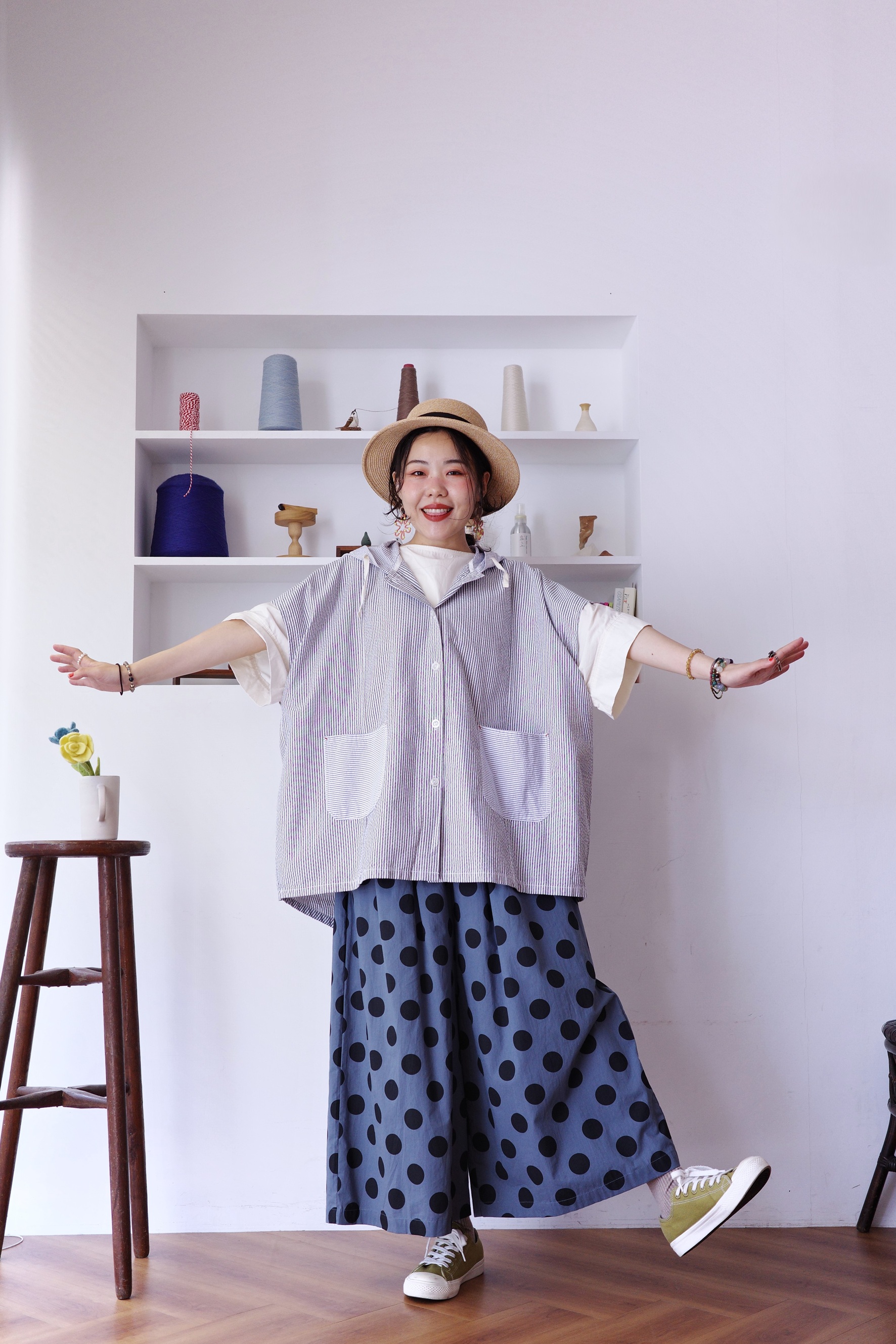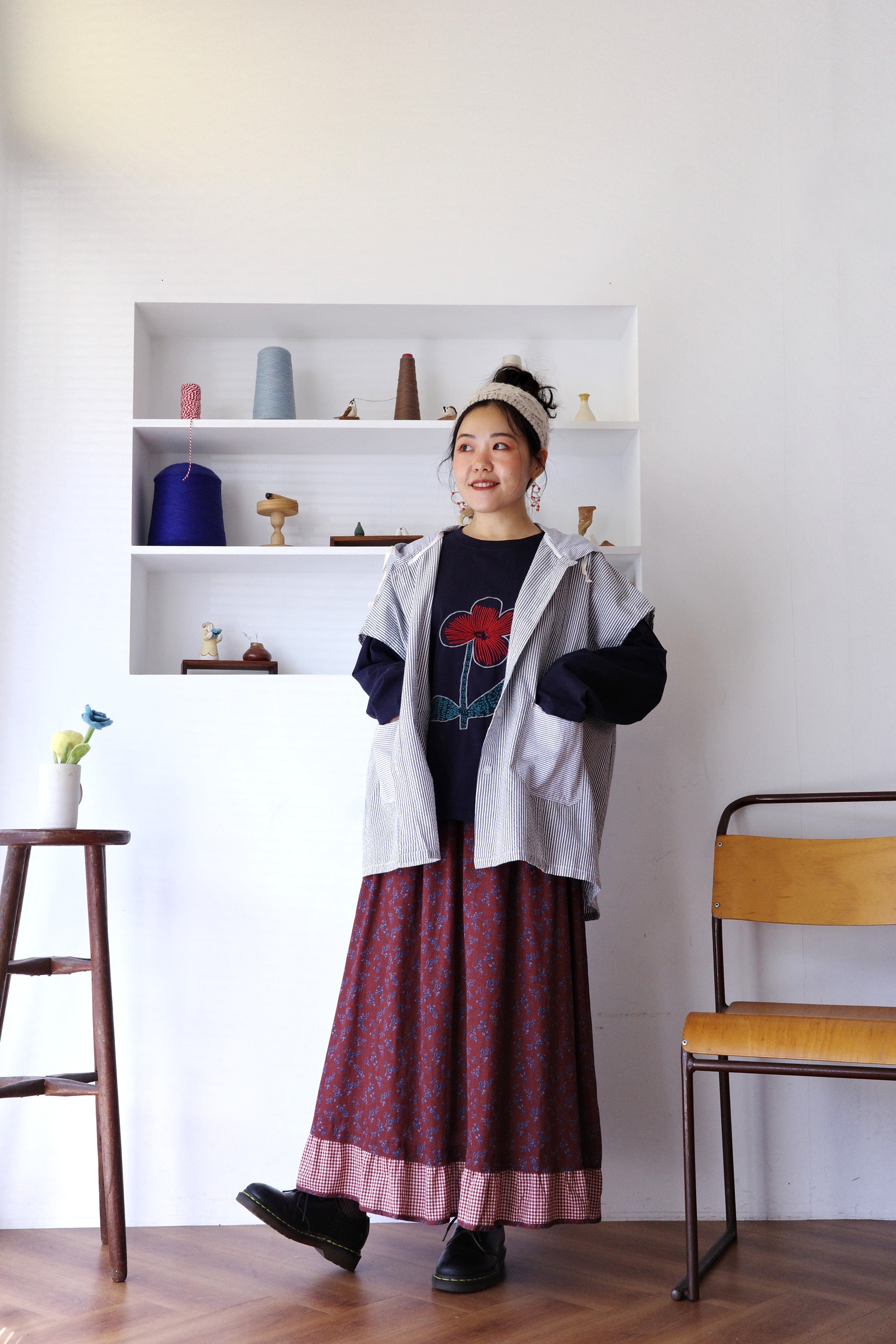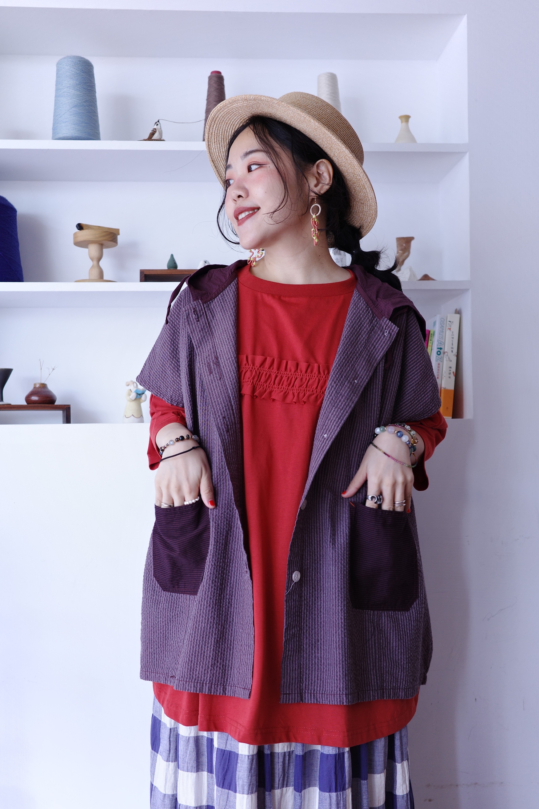 舒適有挺度的布料,利用各種直紋布拼接堆疊層次。