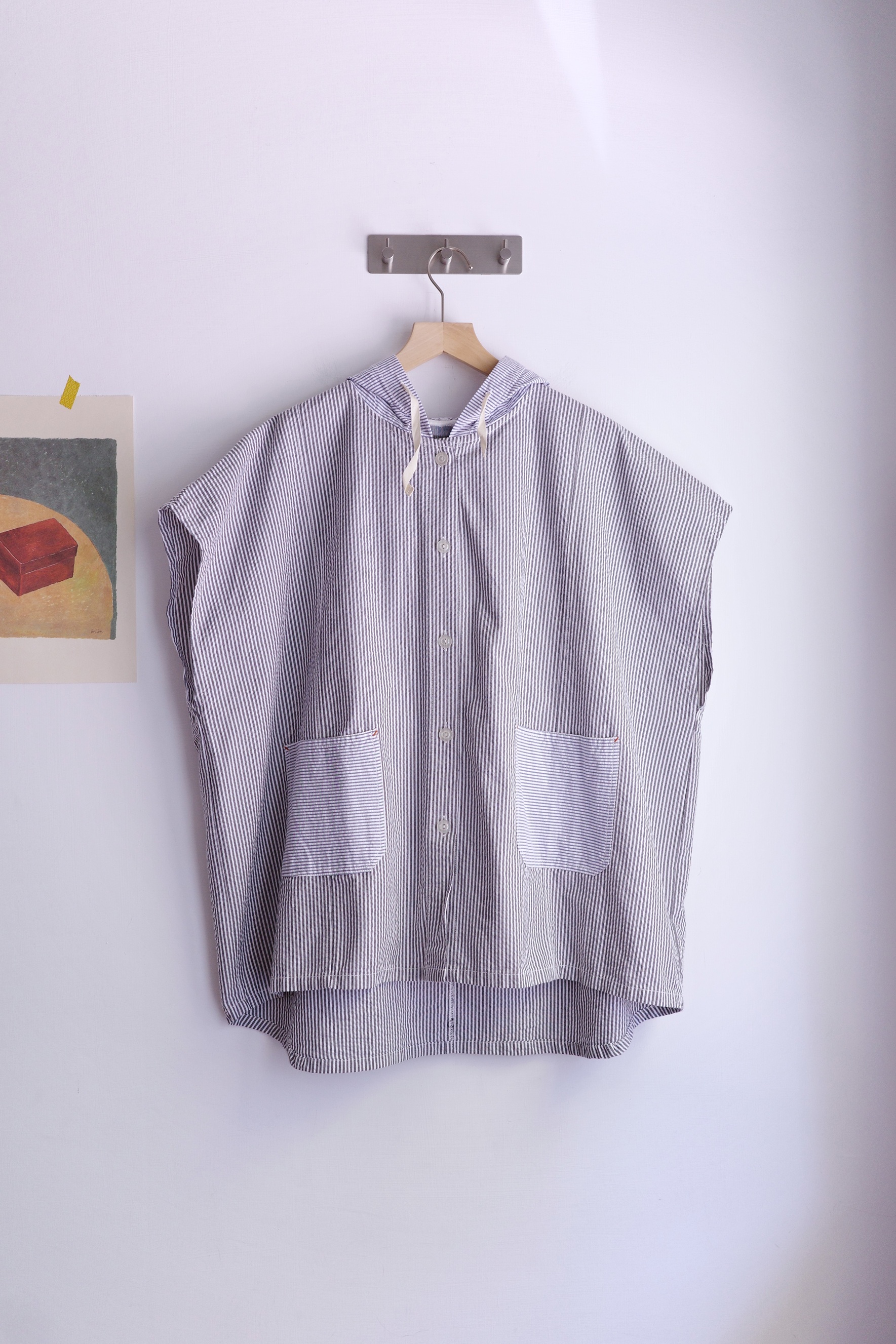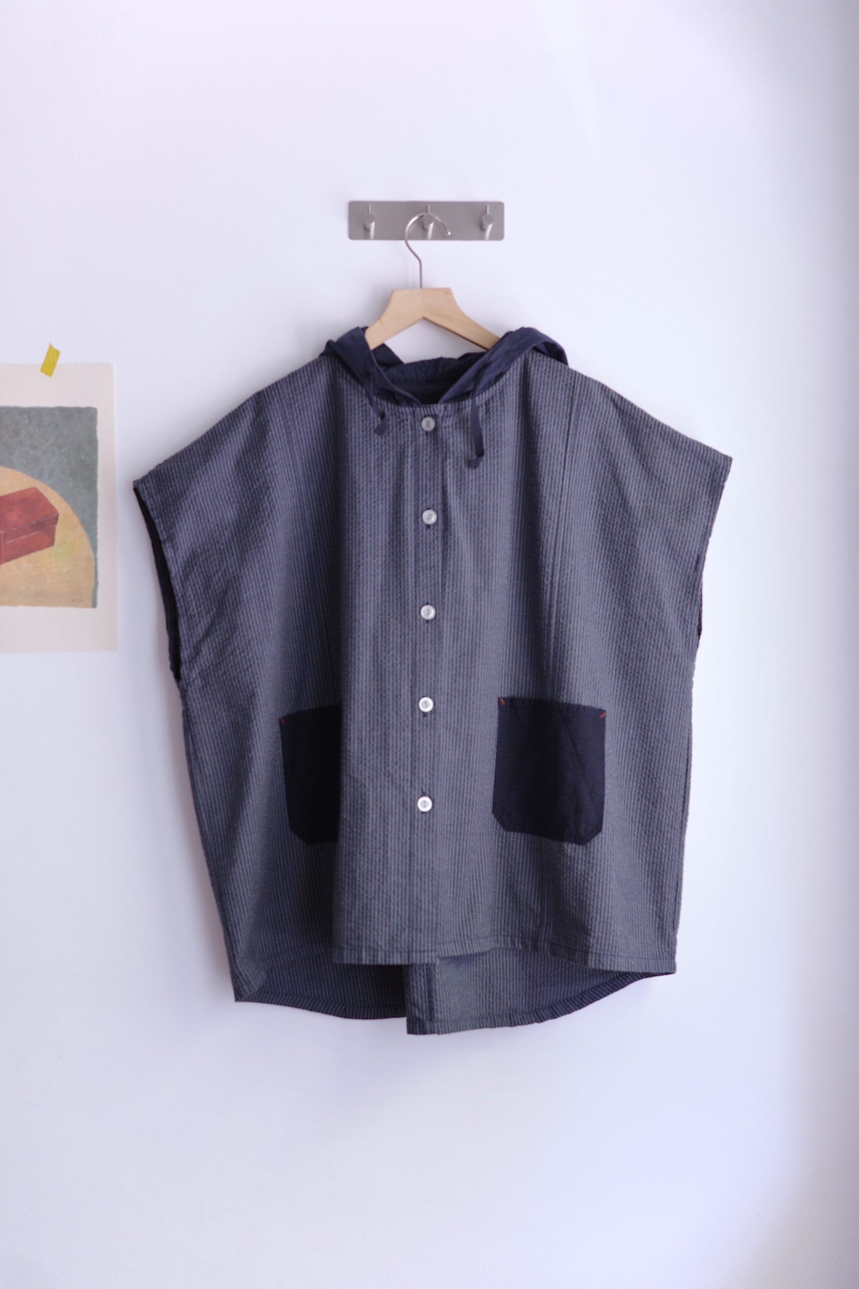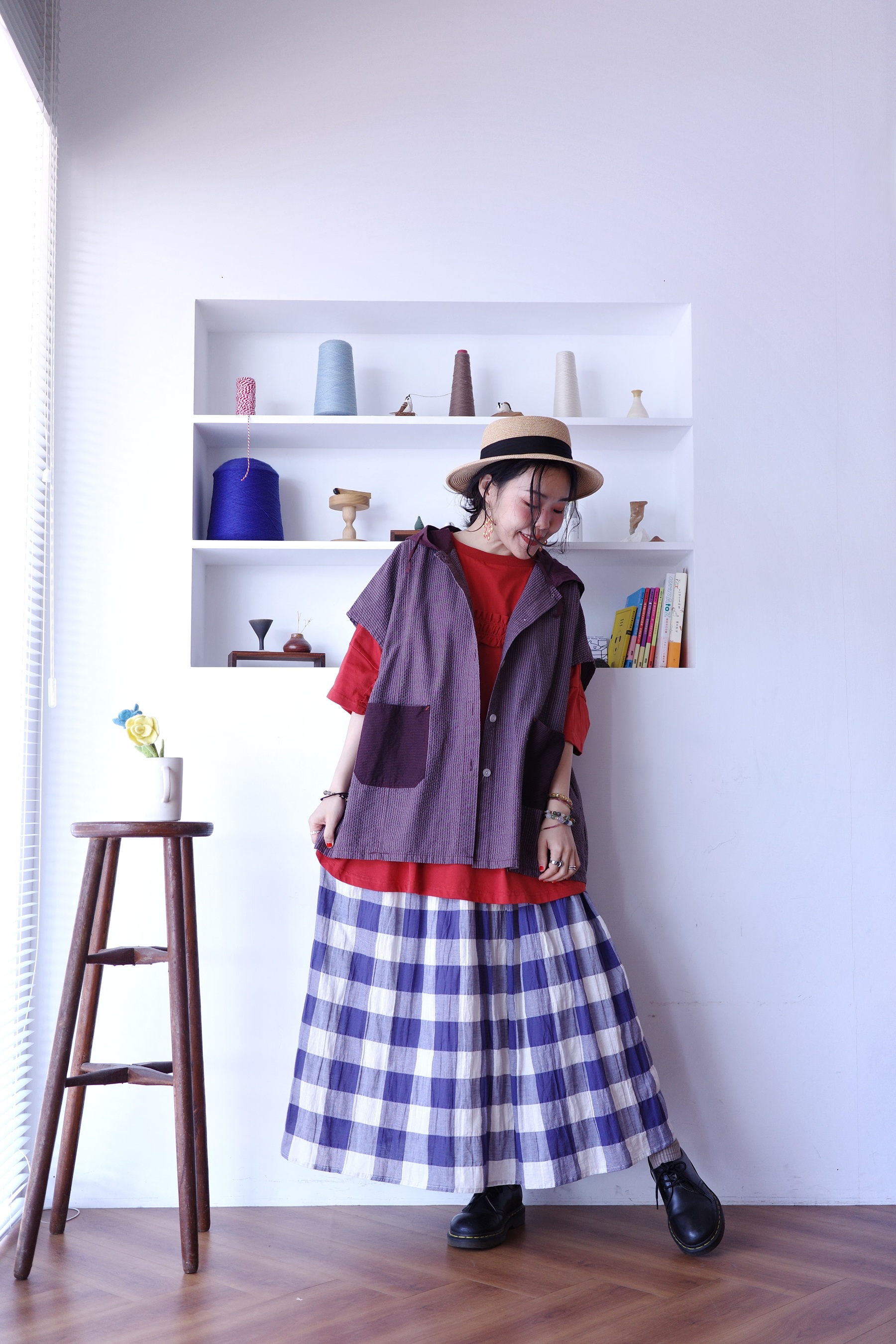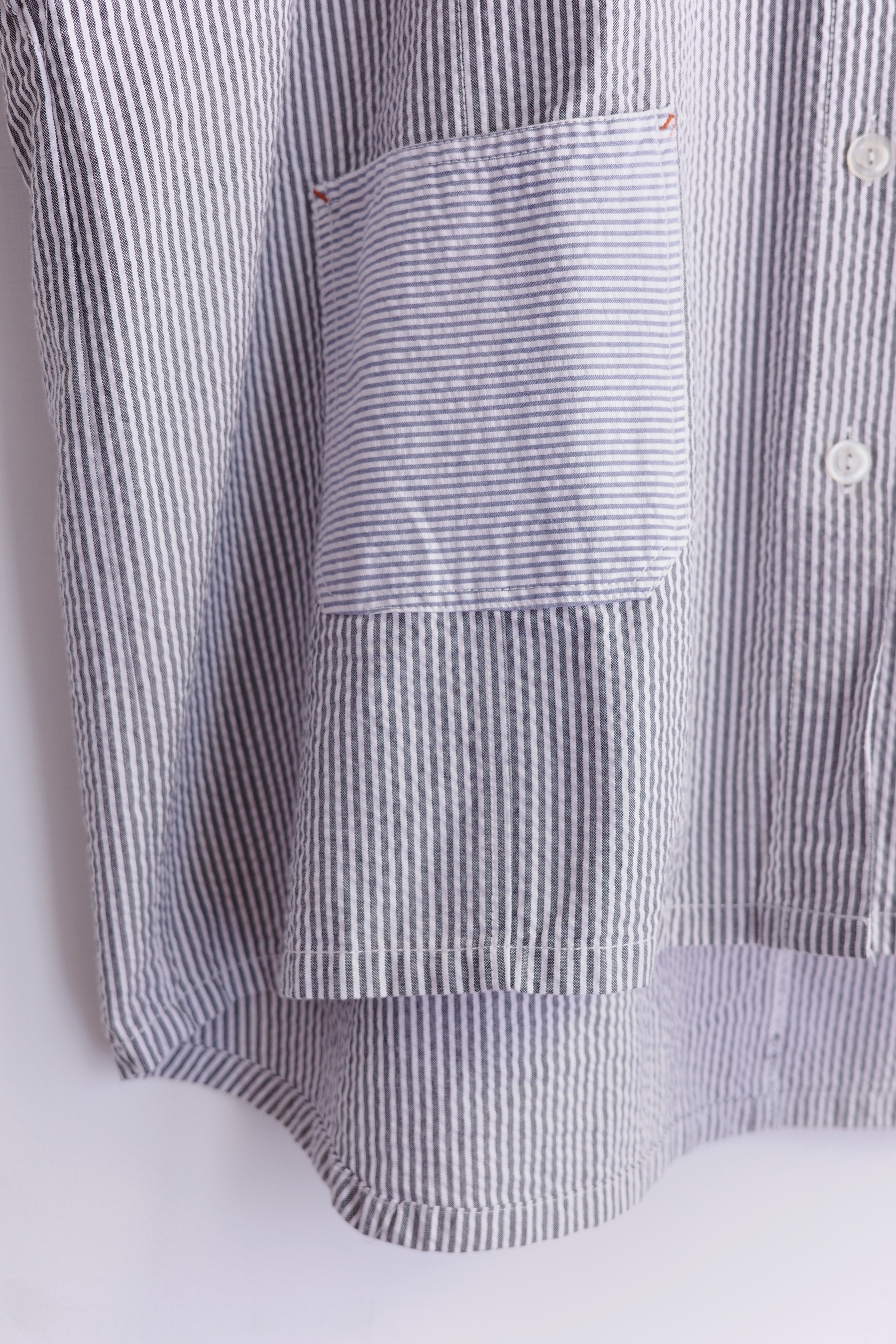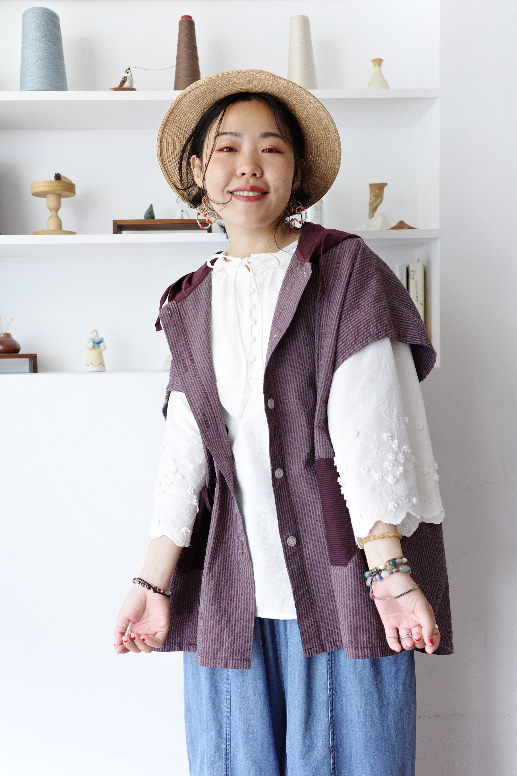 舒適有挺度的布料,利用各種直紋布拼接堆疊層次。
